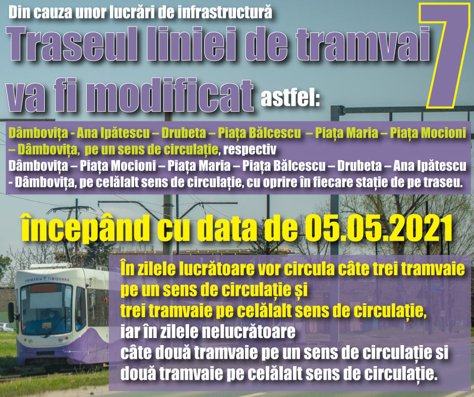„Începând cu data de 05.05.2021, din cauza unor lucrări de infrastructură, traseul liniei de tramvai 7 (șapte) va fi modificat astfel: