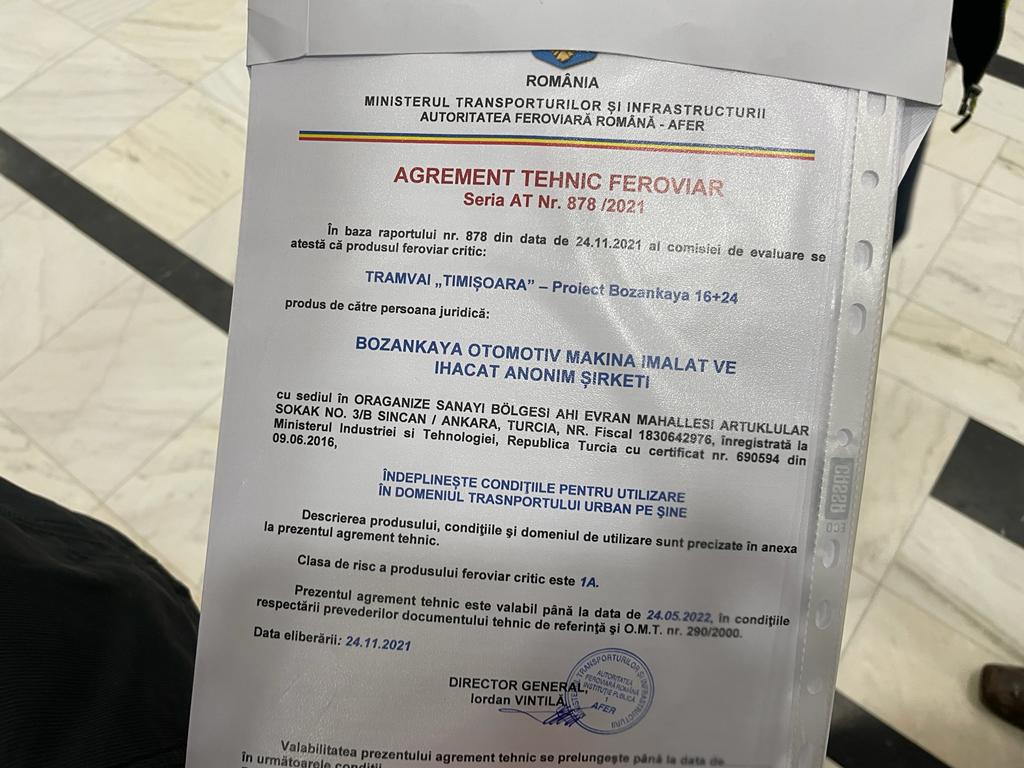 Primul tramvai nou produs în Turcia a ajuns în Timișoara la sfârșitul lunii iunie și a fost testat până în toamnă. Dosarul pentru omologare a fost trimis la mijlocul lunii octombrie la AFER, iar acum a venit și agrementul.