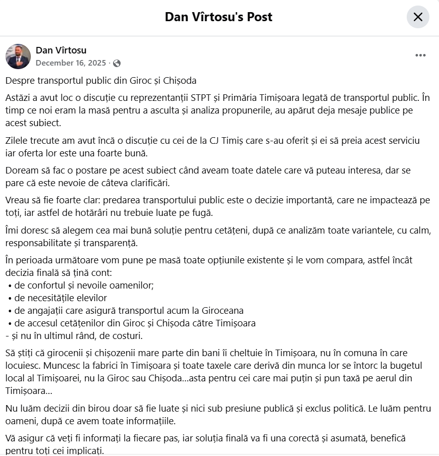 Trebuie menționat că, anterior acestor discuții din luna decembrie, în noiembrie, consilierii județeni au votat „Proiectul de hotărâre nr. 358/18.11.2025 privind aprobarea atribuirii directe, ca o măsură de urgență și pe o perioadă determinată, de maximum 2 ani, către operatorul de transport TIMIȘ – BUS S.R.L. a contractului de delegare a gestiunii serviciilor de transport public de persoane desfășurat în aria de competență teritorială” a ADI TRANSTIMIȘ, pe grupa de trasee Timișoara – Pișchia – Fibiș – Mașloc – Alioș și Timișoara – Pișchia – Fibiș – Mașloc – Bogda.