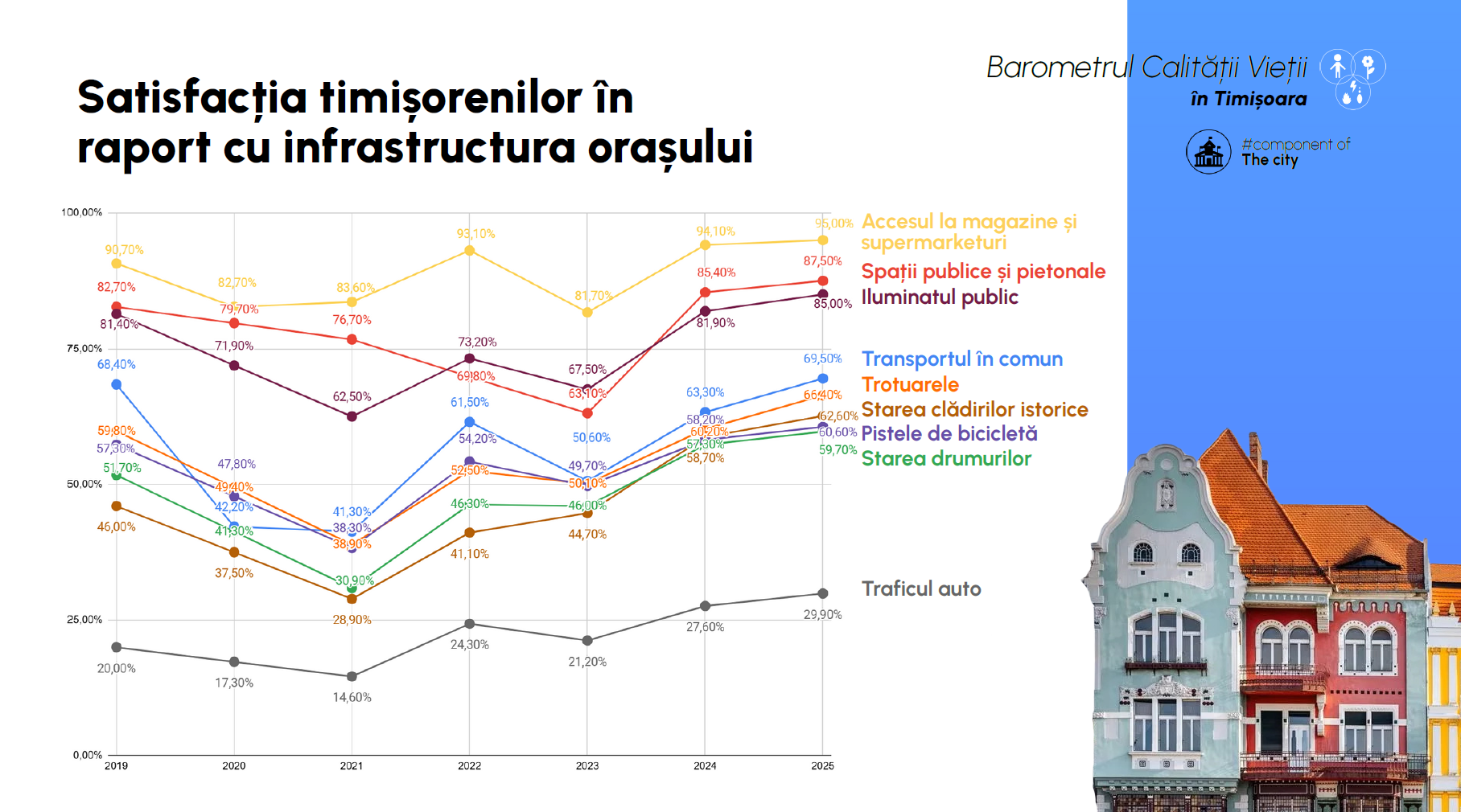 Potrivit studiului, pe partea de infrastructură, traficul auto este, în continuare, cea mai mare problemă a orașului – 66,5% dintre respondenți fiind parțial sau total nemulțumiți. Urmează transportul feroviar (43,4%) și trotuarele (33,2%). Printre domeniile remarcate pozitiv de timișoreni au fost spațiile verzi, transportul în comun și accesul la magazine. Majoritatea (59,3%) folosesc în continuare mașina personală, însă au crescut procentajele celor care apelează la transportul în comun (52,9%), taxi/Uber (31,7%) și bicicleta (17,8%).