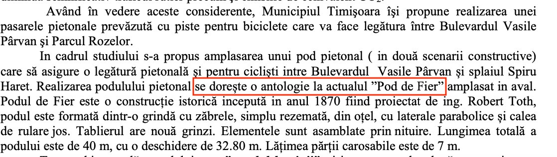 „Scenariul tehnico-economic recomandat de proiectant propune realizarea unui pod pietonal peste Canalul Bega în zona Universității de Vest, care să asigure circulația pietonilor și a bicicliștilor între Bd. Vasile Pârvan și Splaiul Spiru Haret, spre Parcul Justiției. (…) Realizarea podului pietonal se dorește o antologie (probabil analogie – n.r.) la actualul Pod de Fier amplasat în aval”, se arată în anexa proiectului.