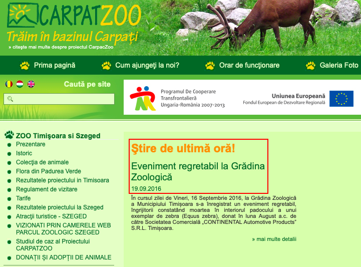 Sunt portaluri ale Direcției de Mediu, care nu prea sunt promovate de Primăria Timișoara. De exemplu, pe carpatzoo.ro, cea mai nouă „știre de ultimă oră” este un anunț postat în 19.09.2016, despre un „eveniment regretabil la Grădina Zoologică”, moartea celebrei zebre.