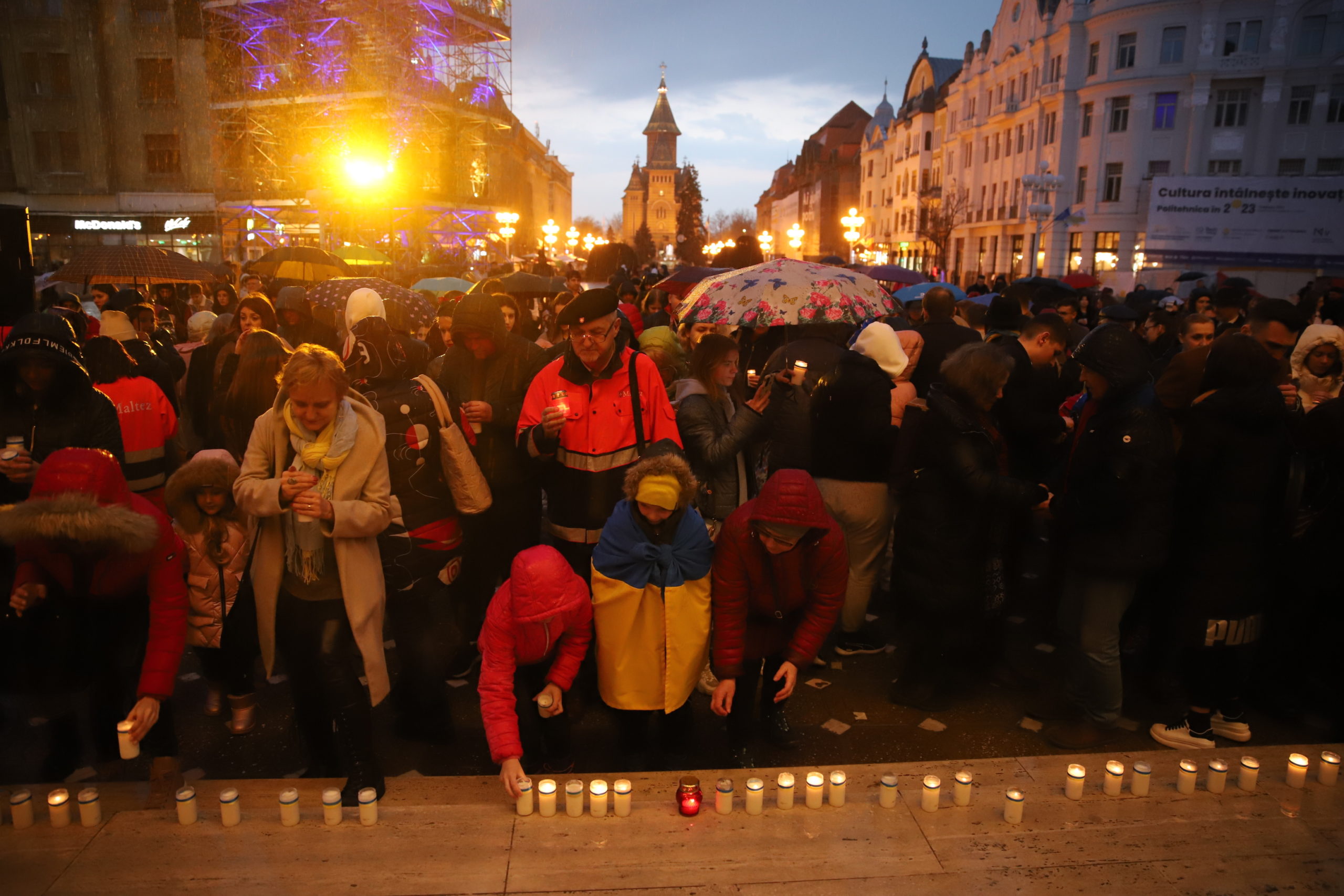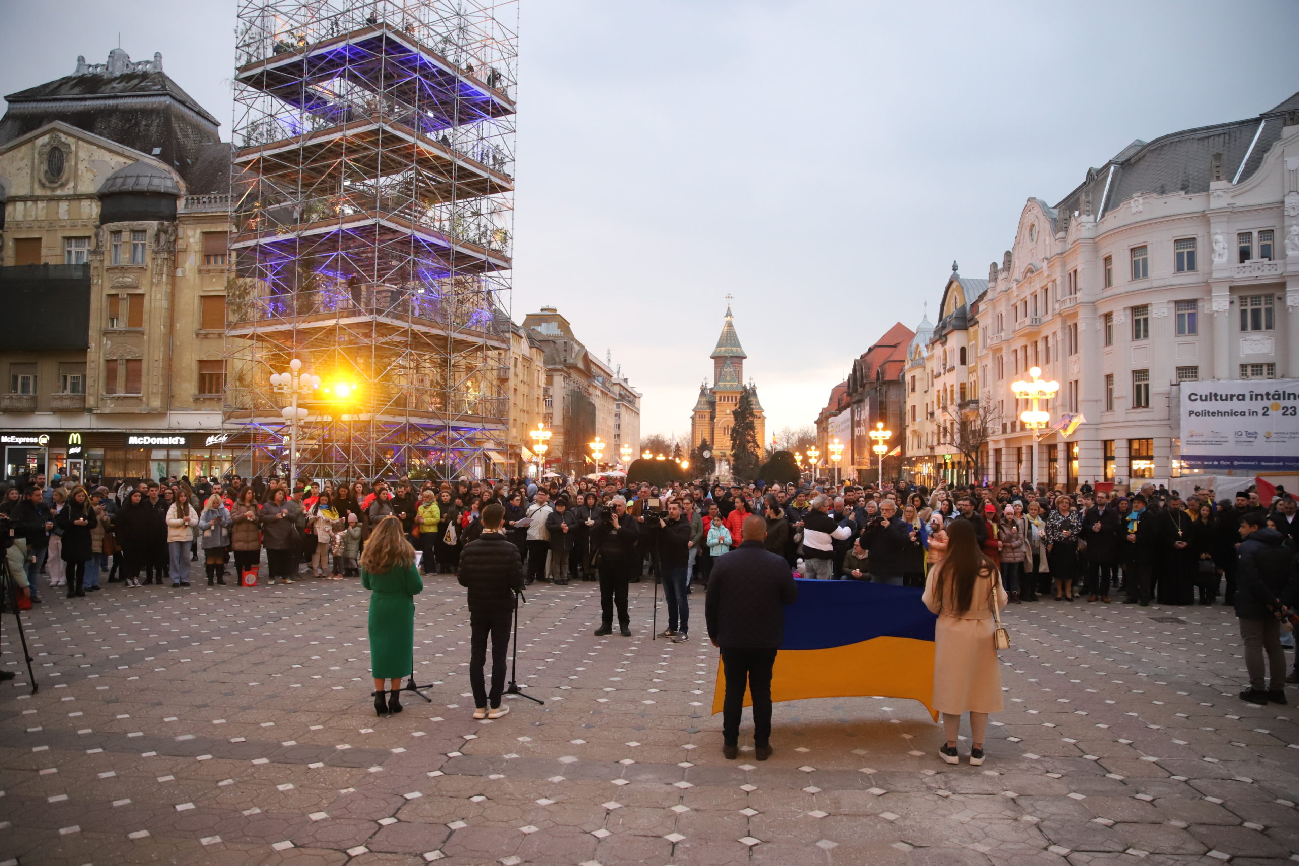 În centrul Timișoarei au fost prezenți membri ai comunității ucrainene din Timișoara, precum și organizații non-guvernamentale, culte religioase, instituții publice, companii și societatea civilă, care s-au ocupat de refugiații din Timișoara timp de un an.