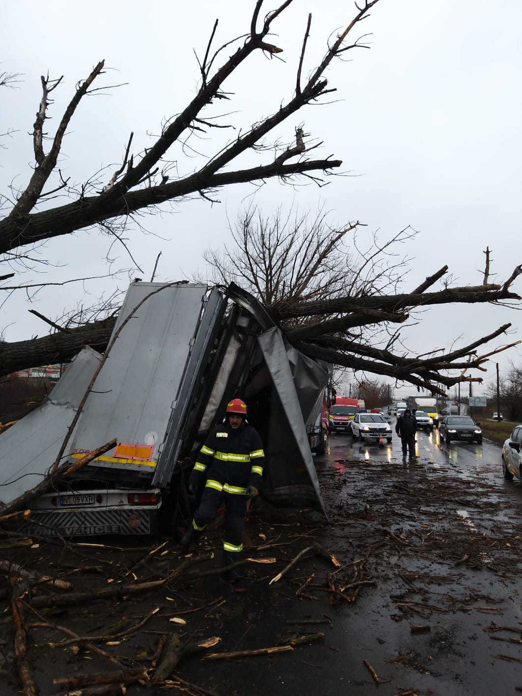 Traficul se desfășoară cu dificultate la ieșirea din Timișoara, spre Utvin. Un arbore de pe marginea drumului a fost smuls de vânt și a distrus partea din spate a unui tir.