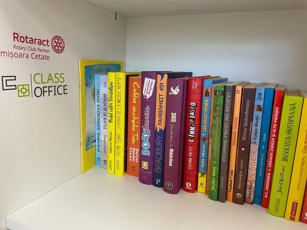 Sara Barbu și George Matei, artist vizual, membri aspiranți ai Clubului Rotaract Timișoara Cetate, au definit spațiul de lectură din Școala Bulgăruș și au ajutat la mobilarea acestuia cu sprijinul Class Office Timișoara.