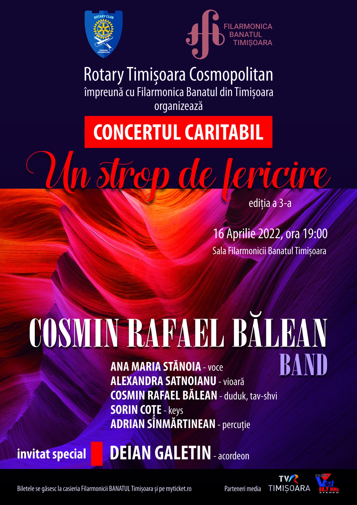 Clubul Rotary Timișoara Cosmopolitan împreună cu Filarmonica Banatul organizează pe 16 aprilie, de la ora 19, concertul caritabil „Un strop de fericire”.