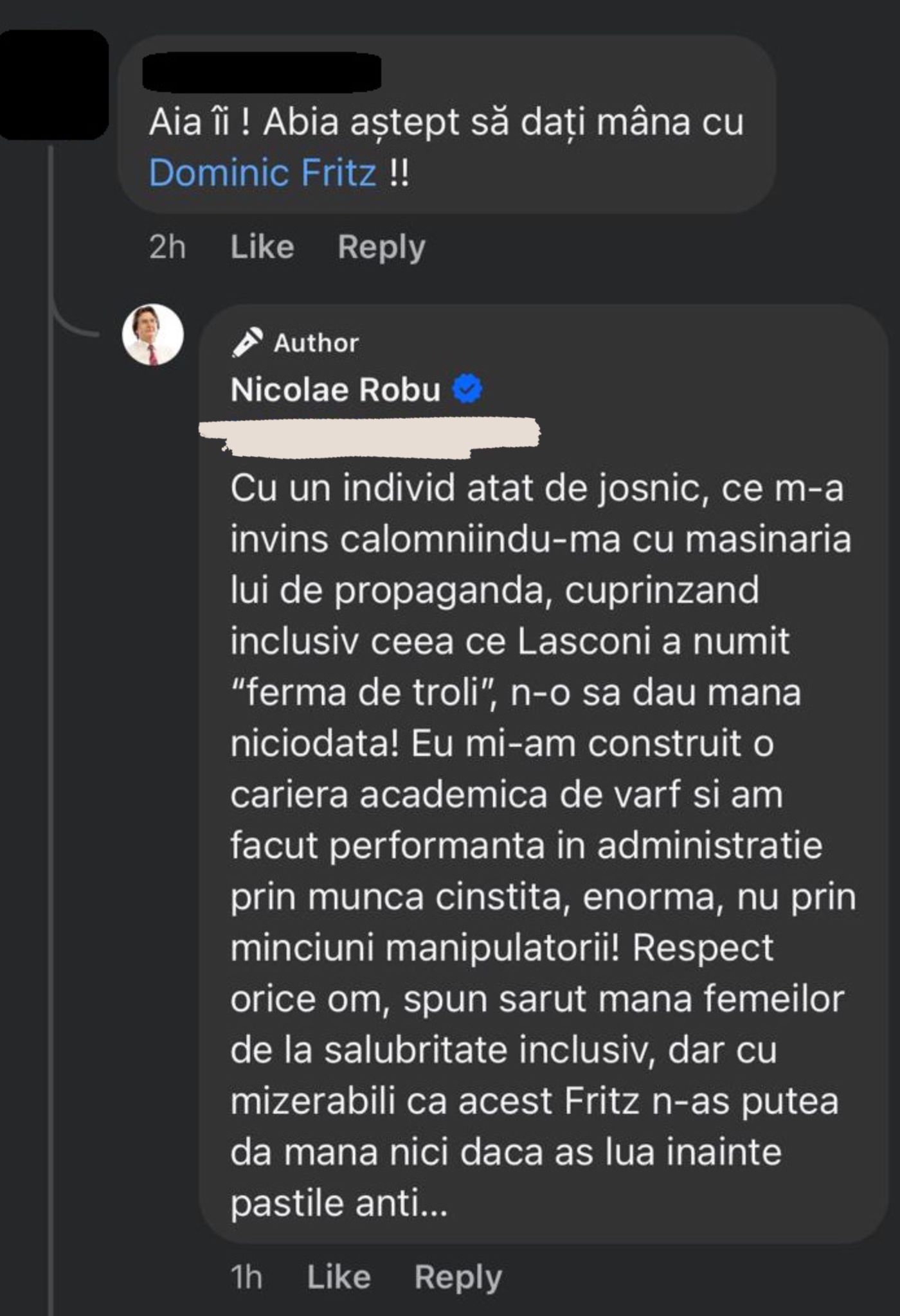 „Cu un individ atât de josnic, ce m-a învins calomniindu-mă cu mașinăria lui de propagandă, cuprinzând inclusiv ceea ce Lasconi a numit «ferma de troli», n-o să dau mâna niciodată! Eu mi-am construit o carieră academică de vârf și am făcut performanță în administrație prin muncă cinstită, enormă, nu prin minciuni manipulatorii! Respect orice om, spun sărut mâna femeilor de la salubritate inclusiv, dar cu mizerabili ca acest Fritz n-aș putea da mână nici dacă aș lua înainte pastile anti…”, a scris Robu.
