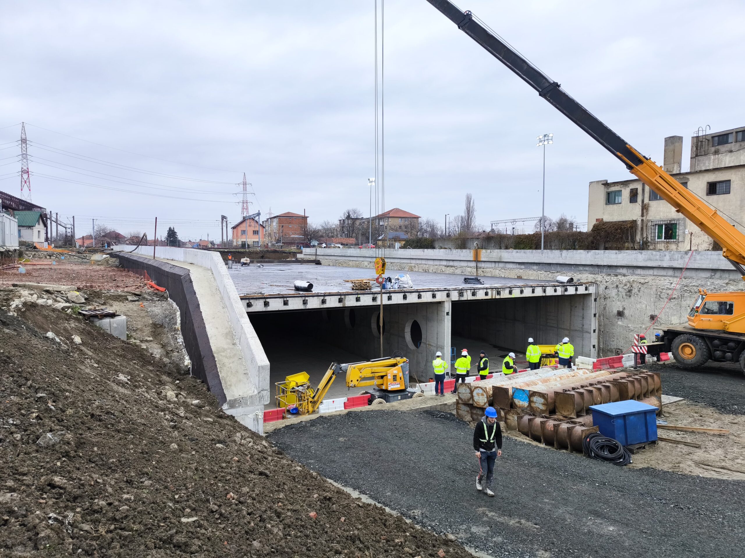 „Practic începe împingerea chesonului, adică tunelului propriu-zis. Vedeți în spatele meu: este în întregime finalizat. Acest tunel uriaș care este deja turnat, pregătit, tensionat, va fi împins pe poziții, adică va trebui să străbată 80 de metri pe sub cele 10 linii de cale ferată. Această pătrundere va lua probabil undeva între 2 și 3 luni de zile. Astăzi și mâine vom face împingerea în gol (…), undeva la 10-15 metri, care vor fi străbătuți, probabil de azi sau până mâine dimineață.