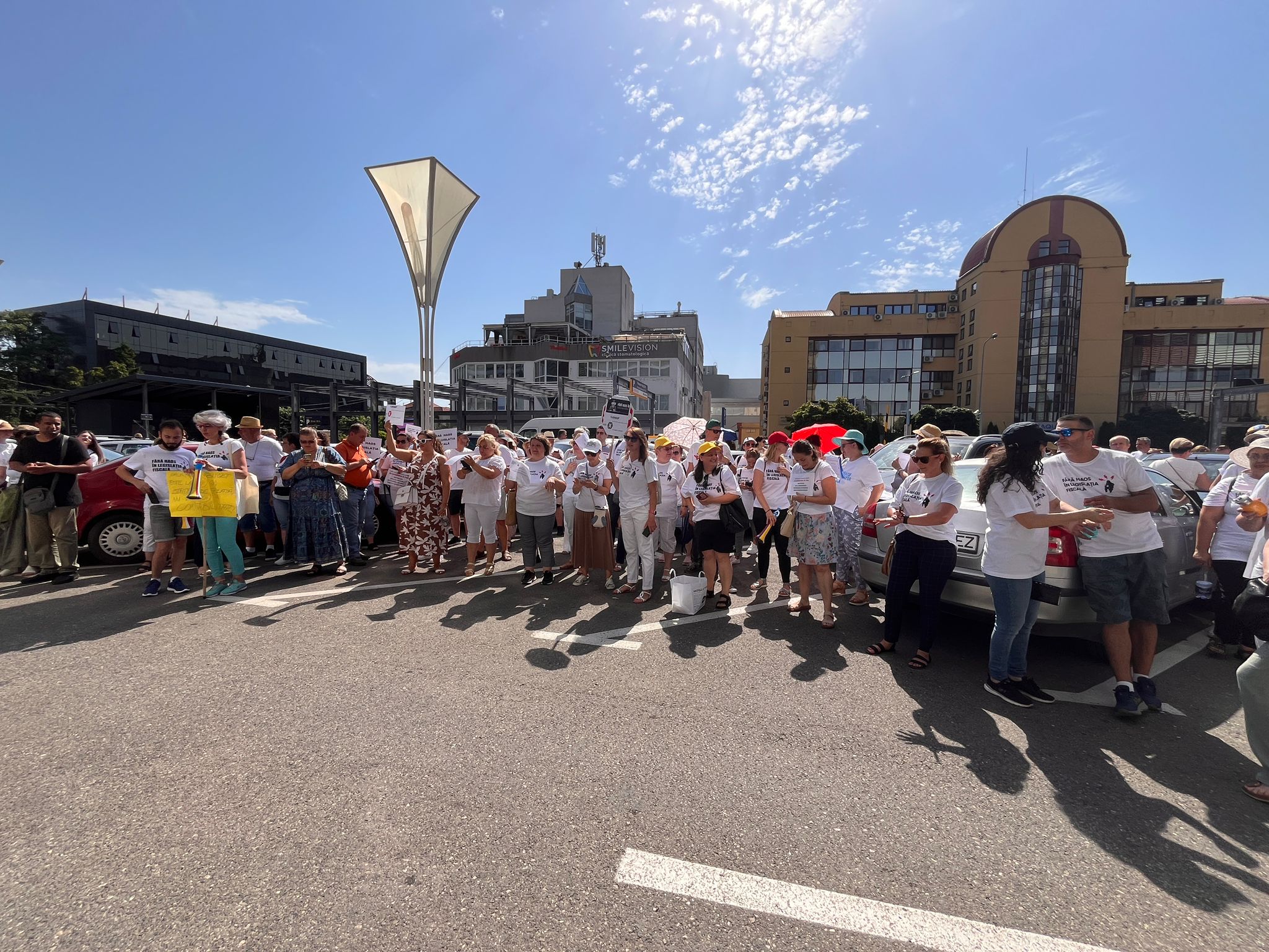 Ei scandează în fața filialei Timișoara a Agenției Naționale de Administrare Fiscală (ANAF): „Transparența și respect, nu doar legi fără efect”.