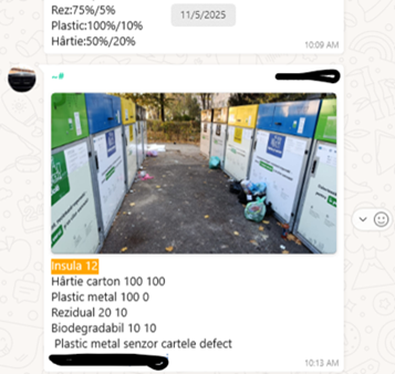 - Miercuri, 5 noiembrie, ora 10:13, erau pline containerele albastre, iar la un container galben (plastic-metal) am constatat că era defect senzorul de cartele. Pentru rezidual (maro și negru), gradul de umplere nu depășea 20%;