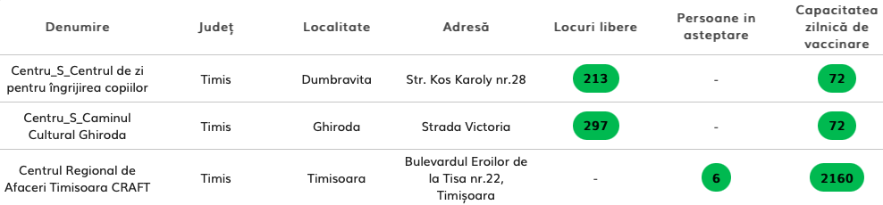 Centrul de la CRAFT a apărut deja pe platforma de vaccinare. Capacitatea zilnică de vaccinare este, conform platformei, de 2.160, ceea ce înseamnă, în trei zile, exact 6.480 de locuri. În traducere liberă, vor putea fi vaccinați, în trei zile, aproape 6.500 de oameni. În Timiș sunt disponibile aproape 3.000 de locuri de vaccinare cu ser Pfizer, potrivit vaccin.live.ro. În Timișoara, în acest moment, sunt aproape 1.000 de locuri disponibile dacă vorbim despre serul Pfizer.