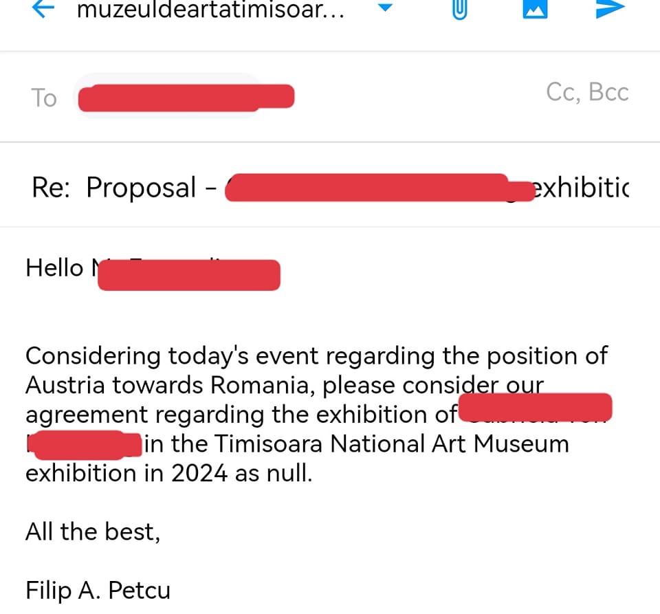 Muzeul Național de Artă din Timișoara (MNArT) ar fi trebuit să găzduiască, în 2024, o expoziție a unui artist austriac. Fără a oferi detalii despre artist sau expoziție, Filip Petcu, directorul instituției, a anunțat pe pagina sa de Facebook că „urmare a celor petrecute astăzi (n.r. – joi), raportat la poziția Austriei față de România, se cuvine să luăm atitudine”. Acesta a postat și o fotografie cu mail-ul trimis partenerilor austrieci prin care îi anunță despre decizia luată.