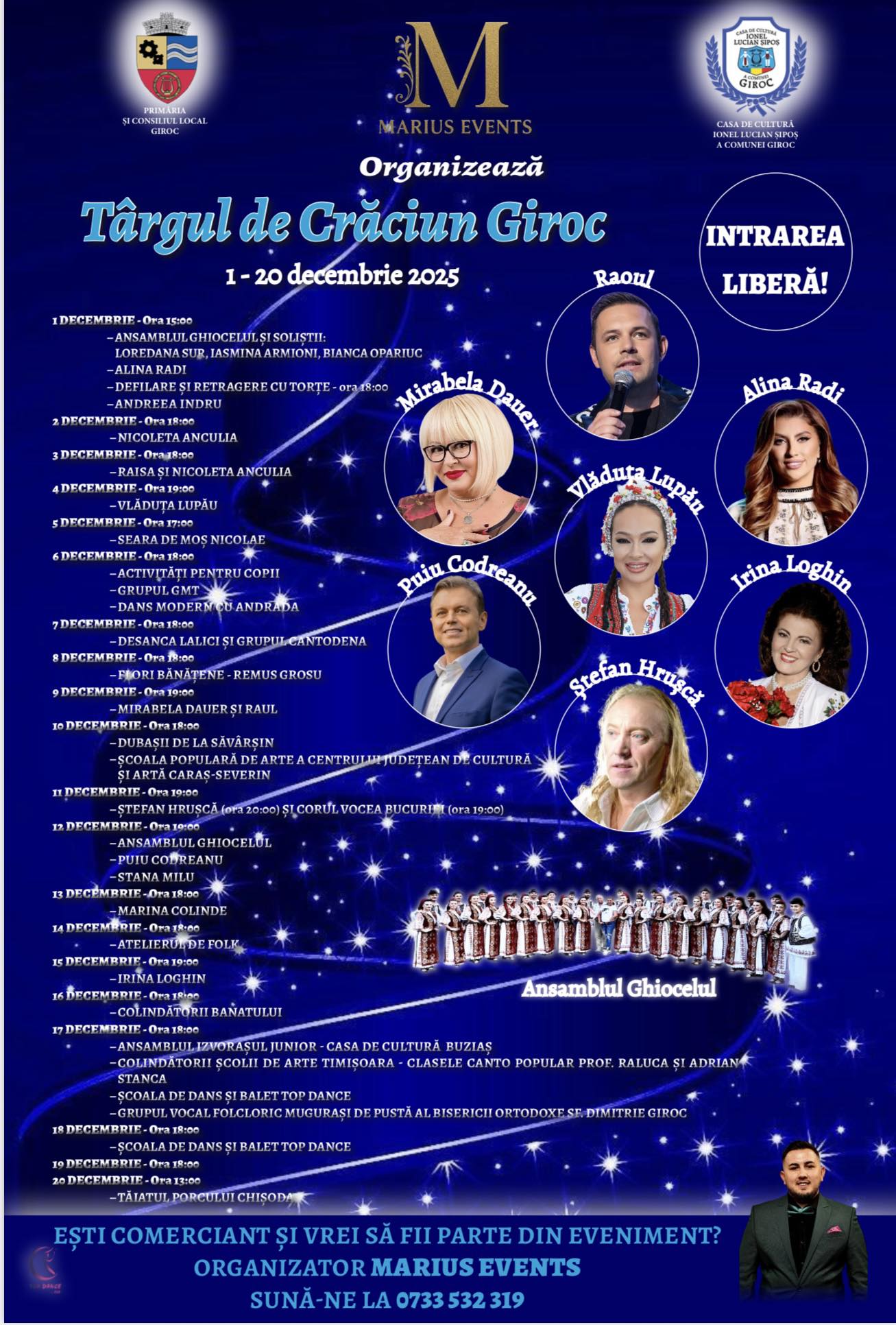 Programul cuprinde recitaluri ale unor artiști îndrăgiți, spectacole folclorice, activități pentru copii și momente tradiționale specifice sărbătorilor de iarnă.