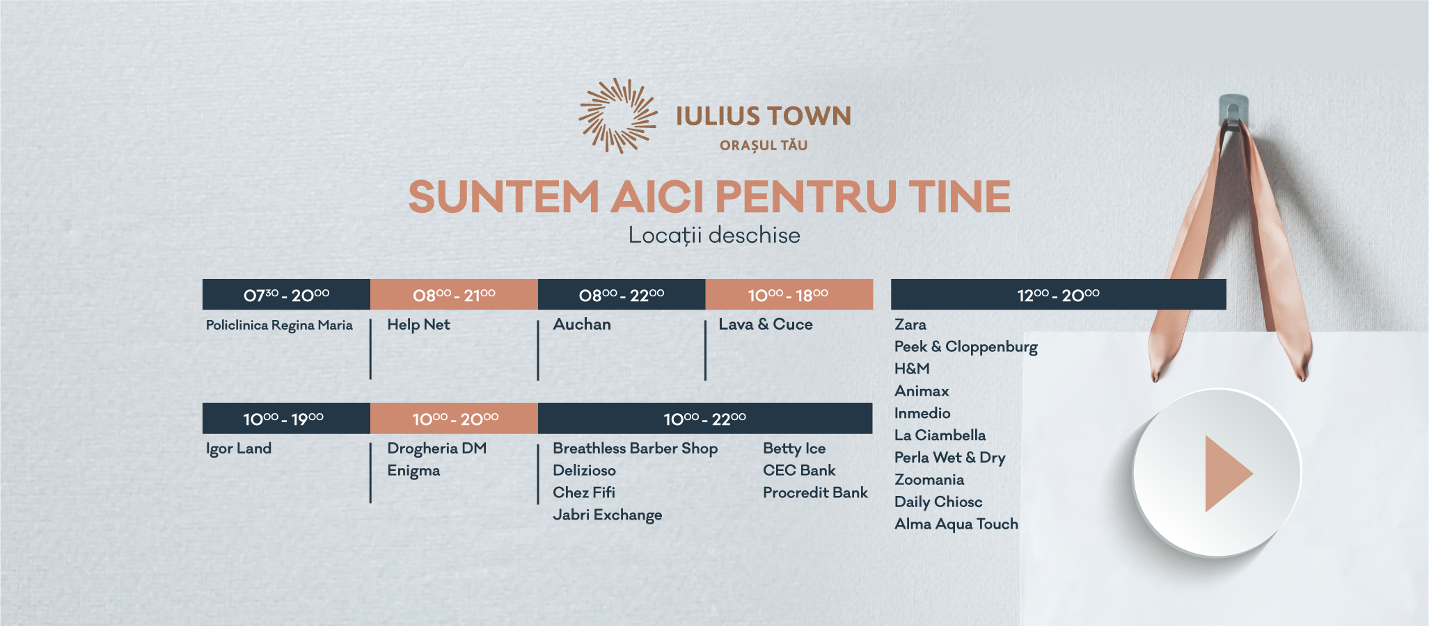 S-au redeschis și saloanele de înfrumusețare din cadrul Iulius Town, precum Breathless Barber Shop (10.00 – 22.00), unde sunt păstrate măsurile de protecție impuse. Hypermarketurile rămân deschise: Auchan (08.00 – 22.00) și dm drogherie markt (10.00 – 20.00). Servicii de curățătorie se pot face la Perla Wet & Dry (12.00 – 20.00) și Lava&Cuce (10.00 – 18.00), dar și de spălătoria auto Alma Aqua Touch (12.00 – 20.00), în timp ce Inmedio te ajută să fii informat (12.00 – 20.00). Serviciile medicale oferite de Policlinica Regina Maria sunt accesibile în intervalul orar 7.30 – 20.00. Preparatele preferate pot fi comandate prin platforme delivery sau în regim to go, de la Taco Bell, Noodle Pack, Pizza Hut și Daily. Programul locațiilor deschise este disponibil pe www.iuliustown.ro.