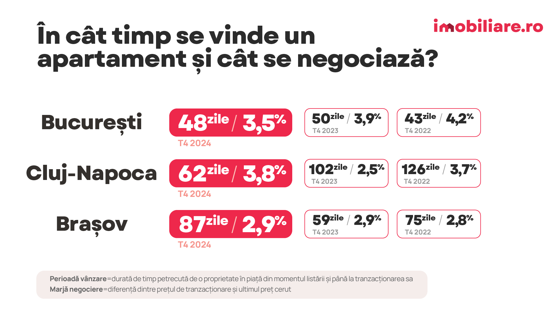 Potrivit celor de la Imobiliare.ro, apartamentele din marile orașe se vând în general într-o perioadă cuprinsă între o lună și jumătate și două luni, excepție făcând doar Brașovul unde sunt necesare trei luni pentru identificarea cumpărătorilor.