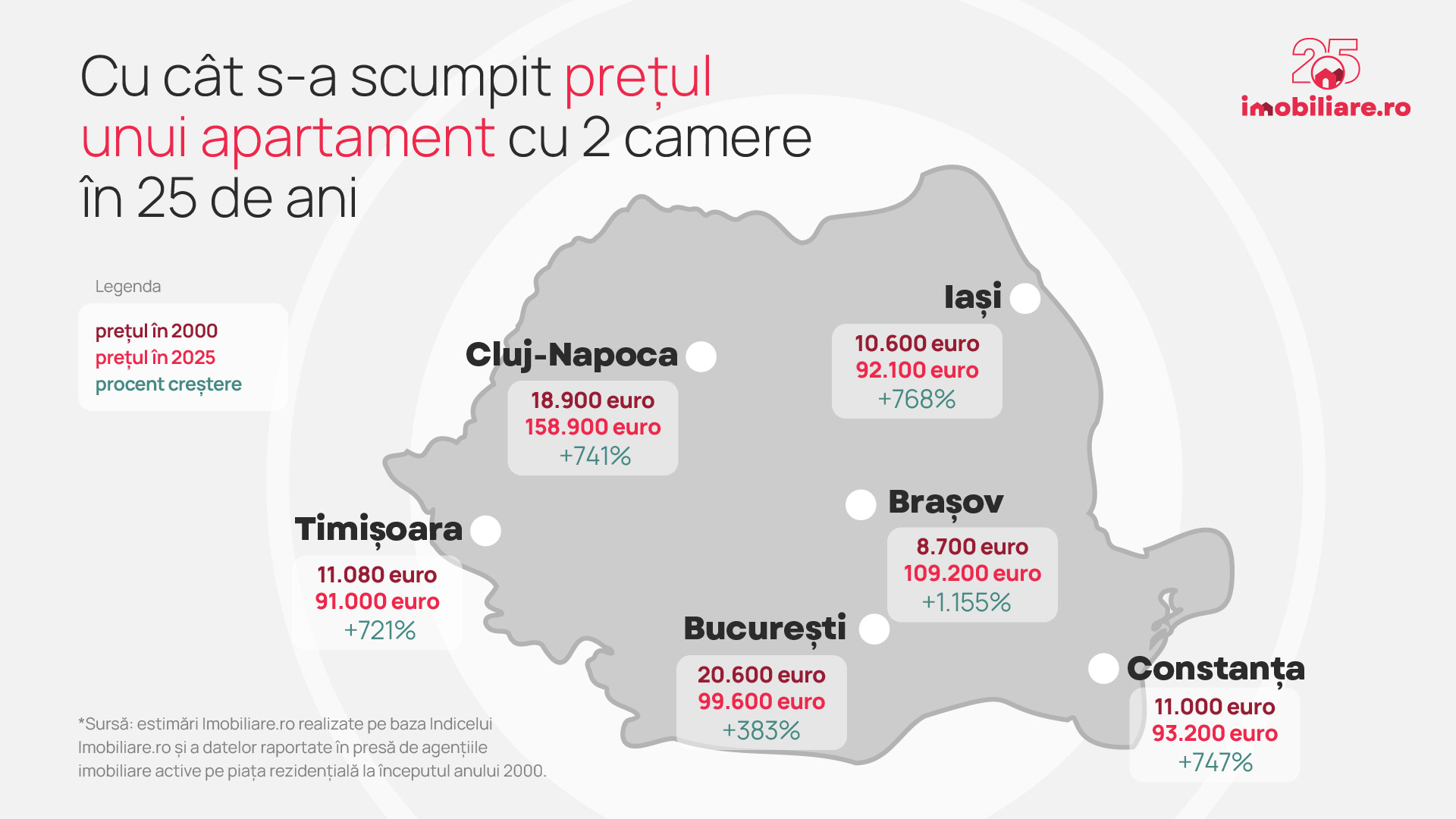Cu ocazia aniversării a 25 de ani de la lansare, facem o paralelă între condițiile de pe piața rezidențială din 2000 și cele actuale și vă invităm să parcurgeți în continuare o analiză detaliată cu focus pe evoluția prețurilor, chiriilor și accesibilității locuințelor din România.