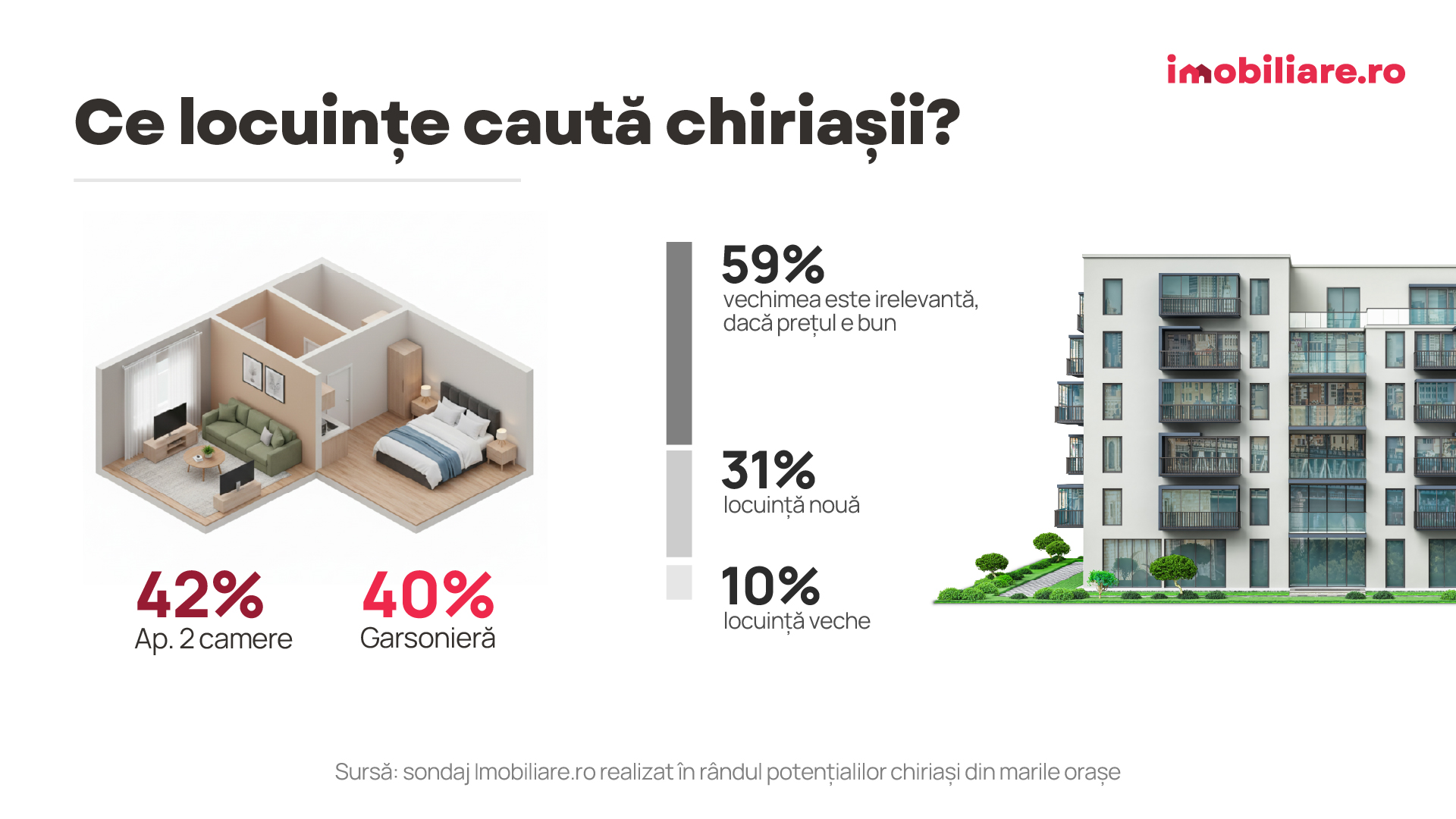 Chiriașii aflați, în momentul de față, în căutarea unei locuințe sunt interesați, în principal, de apartamentele cu două camere. Acestea atrag atât studenții veniți în marile orașe înainte de începerea noului an universitar, cât și tinerii și familiile aflate la început de drum. Garsonierele sunt aproape la fel de căutate în marile orașe, aproximativ 40% dintre cei care au participat la sondajul Imobiliare.ro arătându-și interesul față de acestea.