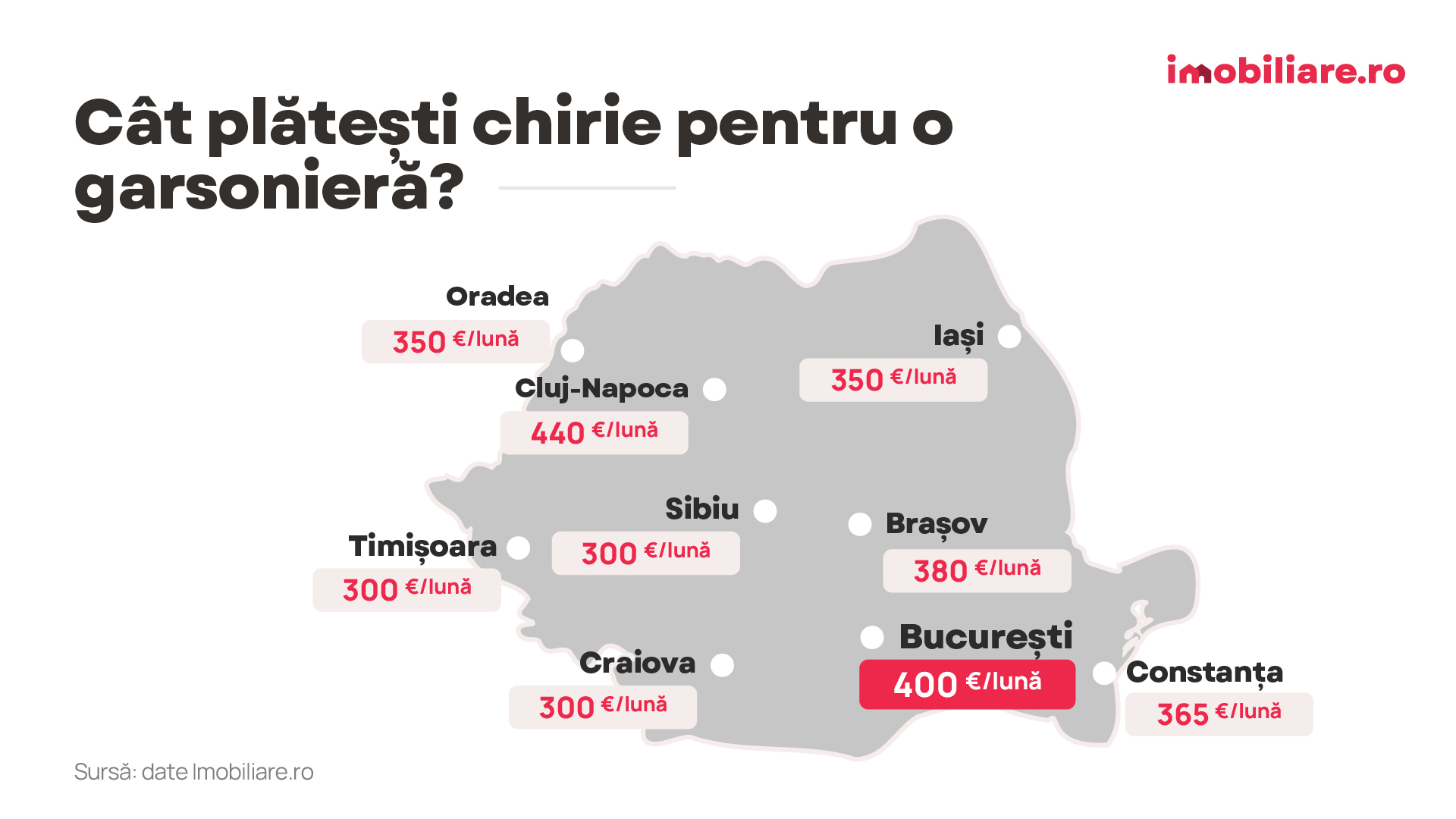 Cu toate că își doresc să achite lunar mai puțin de 300 euro pentru chirie, nu sunt mulți cei care și reușesc să facă acest lucru. În Timișoara, Craiova și Sibiu chiria medie pentru o garsonieră este de 300 de euro, dar prețurile cresc considerabil în alte centre urbane majore din țară care sunt și importanți poli universitari.