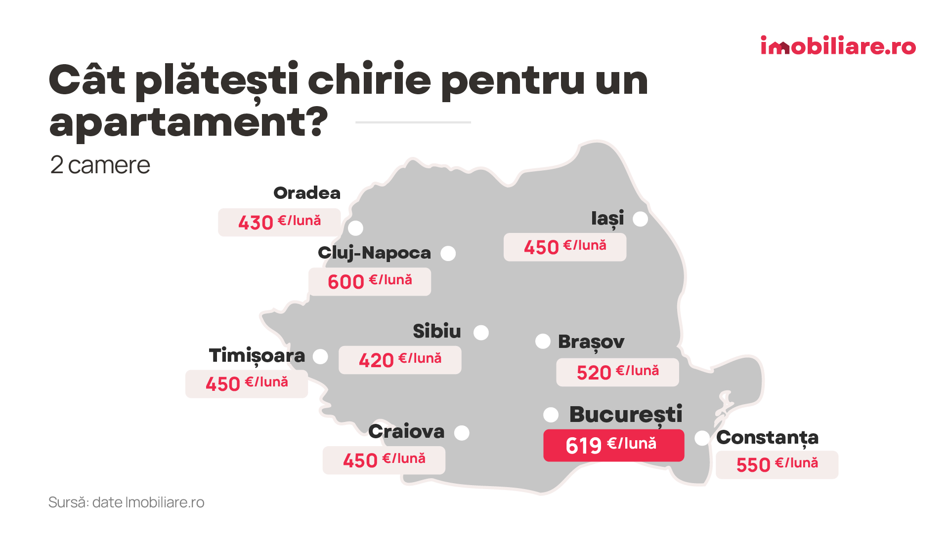 Cele mai multe apartamente de închiriat sunt disponibile în București, Cluj-Napoca, Timișoara și în Iași. Cele mai mari chirii sunt achitate, în general, de chiriașii din Capitală și din Cluj-Napoca.