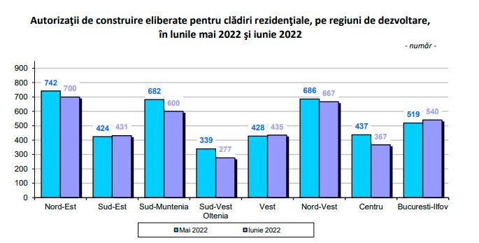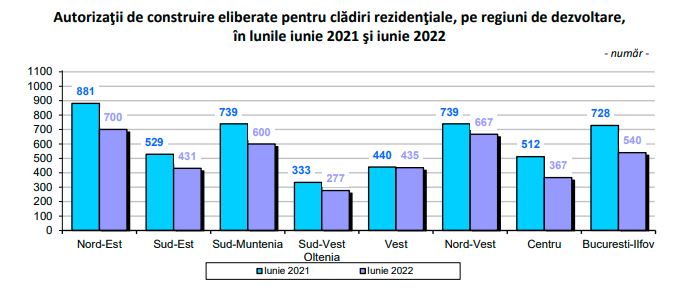 Raportat la lunile mai și iunie 2022, doar în regiunea de Vest, în Sud-Est și în București-Ilfov numărul de autorizații de construire a crescut de la o lună la alta.