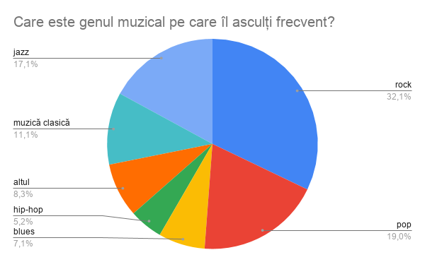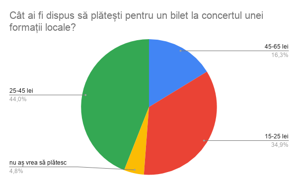 Conform datelor prelucrate a reieșit că, în ceea ce privește genurile muzicale preferate, pe primul loc este rock-ul (32,1%), urmat de pop (19%), jazz (17,1%) și muzică clasică (11,1%). La întrebarea ce sumă de bani ar fi dispuși să plătească pentru participarea la concertul unei trupe locale, 44% dintre respondenți au declarat că între 25-45 de lei, în timp ce un procent de 4,8% spun că nu ar dori să plătească. La sondaj au participat persoane cu vârste cuprinse între 18-55(+) ani, iar după atingerea pragului de 1000 de respondenți va fi furnizată o analiză sociologică completă.