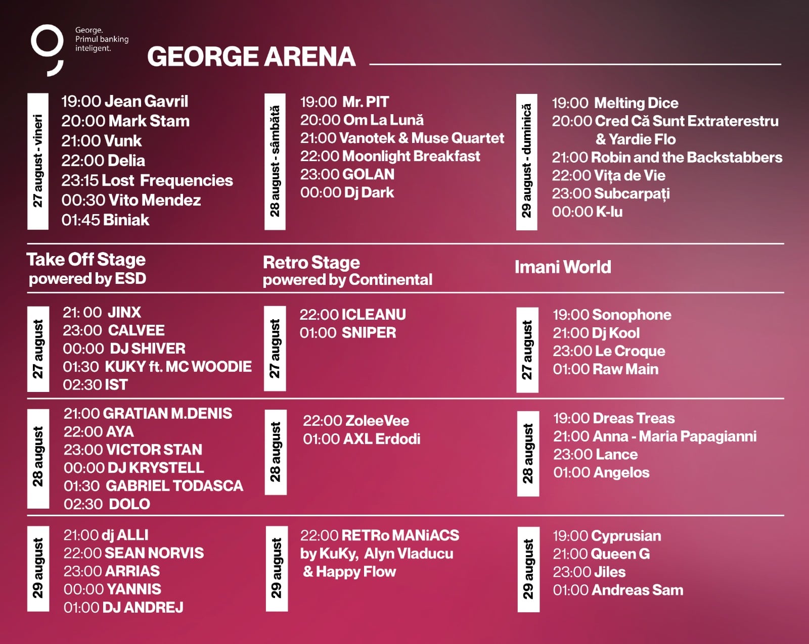 Vor fi patru scene muzicale diferite, pe care vor urca artiști precum Lost Frequencies, Stefan Biniak, Vito Mendez, Delia, Vunk, Vanotek & Muse Quartet, Jean Gavril, Mark Stam, DJ Dark, Mr. Pit, Angelos și Raw Main. Pe lângă aceștia, organizatorii le-au pregătit participanților activități inedite, precum zboruri cu avionul, incursiuni în spații imersive, zone instagramabile, tech world – interacțiuni cu brandurile, spații de relaxare și locuri de joacă pentru copii.