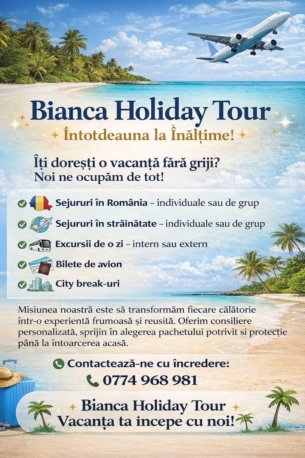 Bianca Holiday Tour vrea să fie „întotdeauna la înălțime”. Activitatea agenției se axează pe sejururi în România și străinătate, individuale sau de grup, excursii de o zi intern sau extern, bilete de avion și city-break-uri.