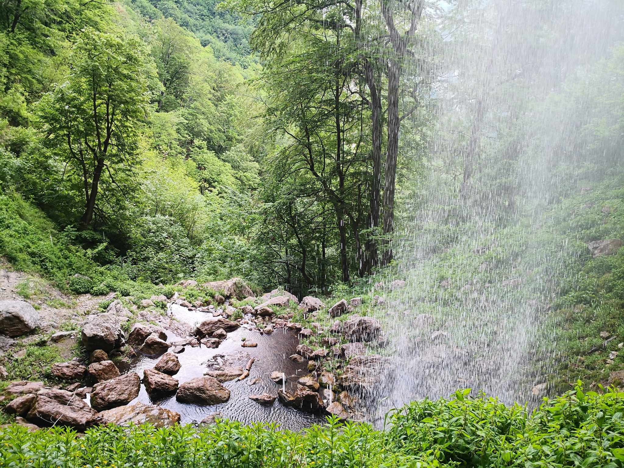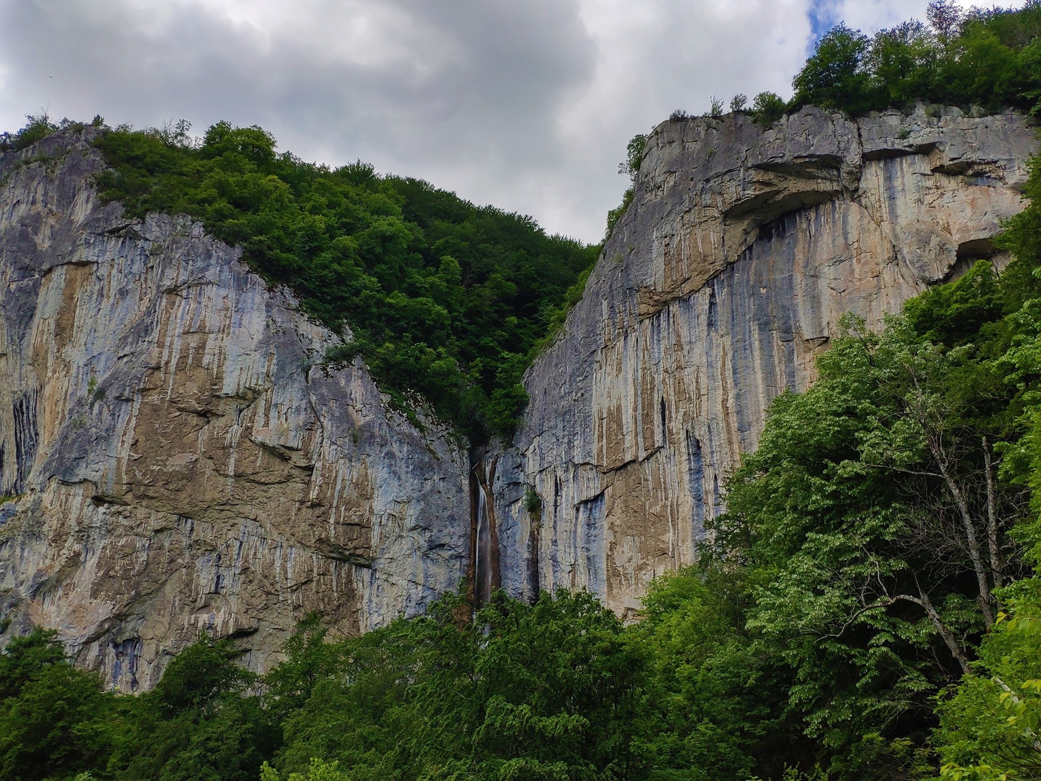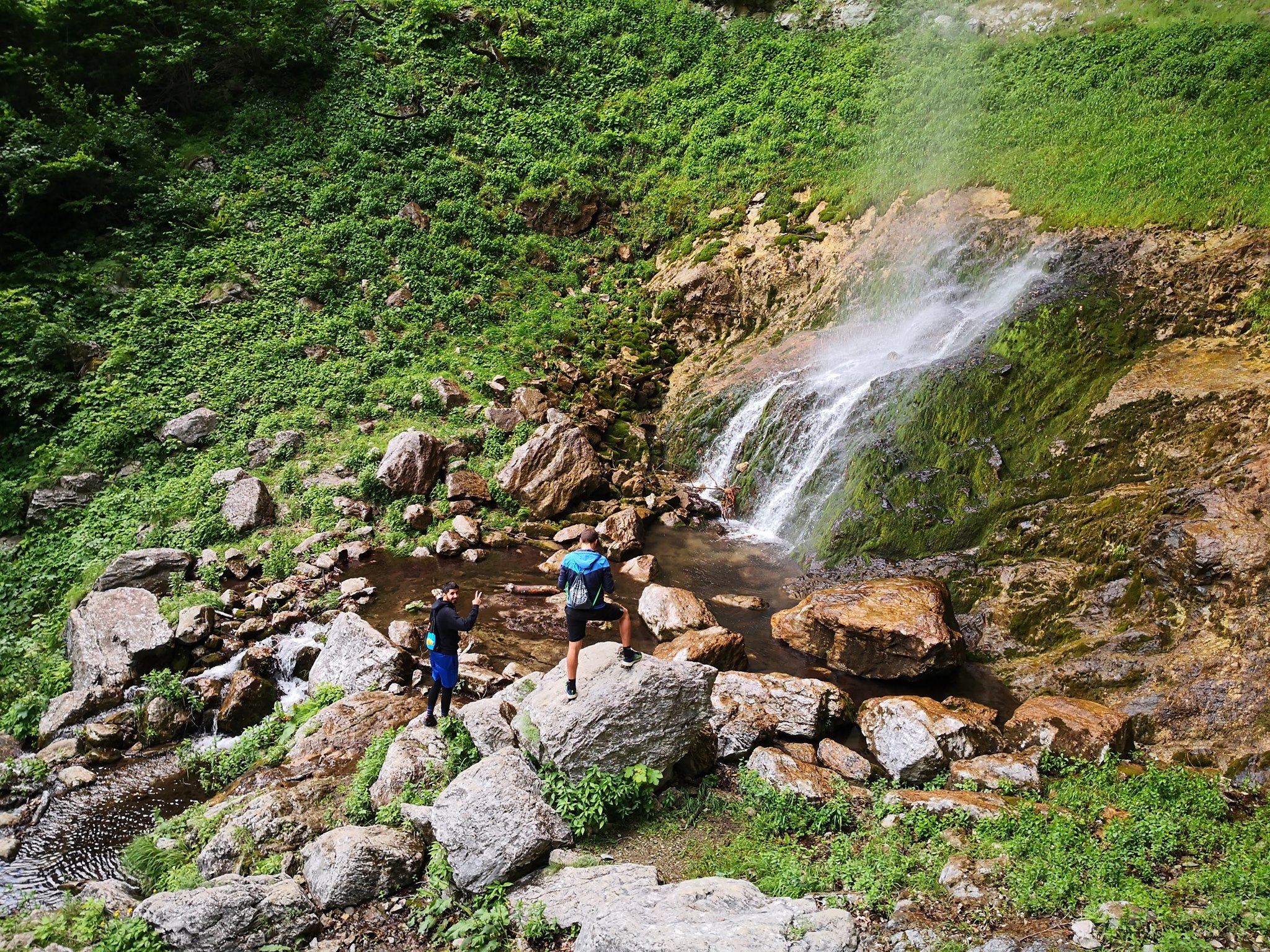 Traseul trece mai departe prin spatele pânzei de apă a cascadei și urcă în serpentine, până pe platoul de deasupra cascadei.