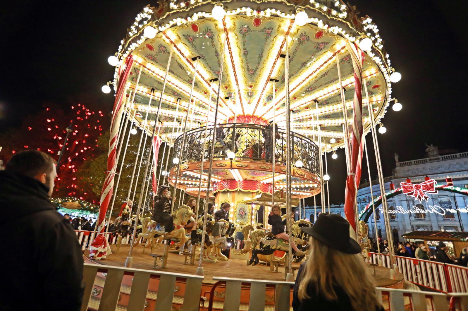 Nu rămâne repetent, e realizat cu bun gust și… fără „bling bling”. Are decorațiuni luminoase ca cele din România, un brad frumos și înalt, căsuțe în care poți cumpăra globuri de sticlă cu 12 sau 25 de euro și vin fiert cu 5 euro. O roată panoramică care seamănă cu cea din Timișoara (da, aia dintre fântâna cu pești „roz-fondantă” și catedrală), parcă e sora roții din Mica Vienă, și unde dai trei euro să te dai o tură (care cuprinde trei rotiri complete) și să vezi printre gratiile roții ramurile copacului unde sunt atârnate inimi roșii – aici efectul e unul într-adevăr superb. Un copac mare plin de inimi, se pot face și donații pentru inimi sănătoase.