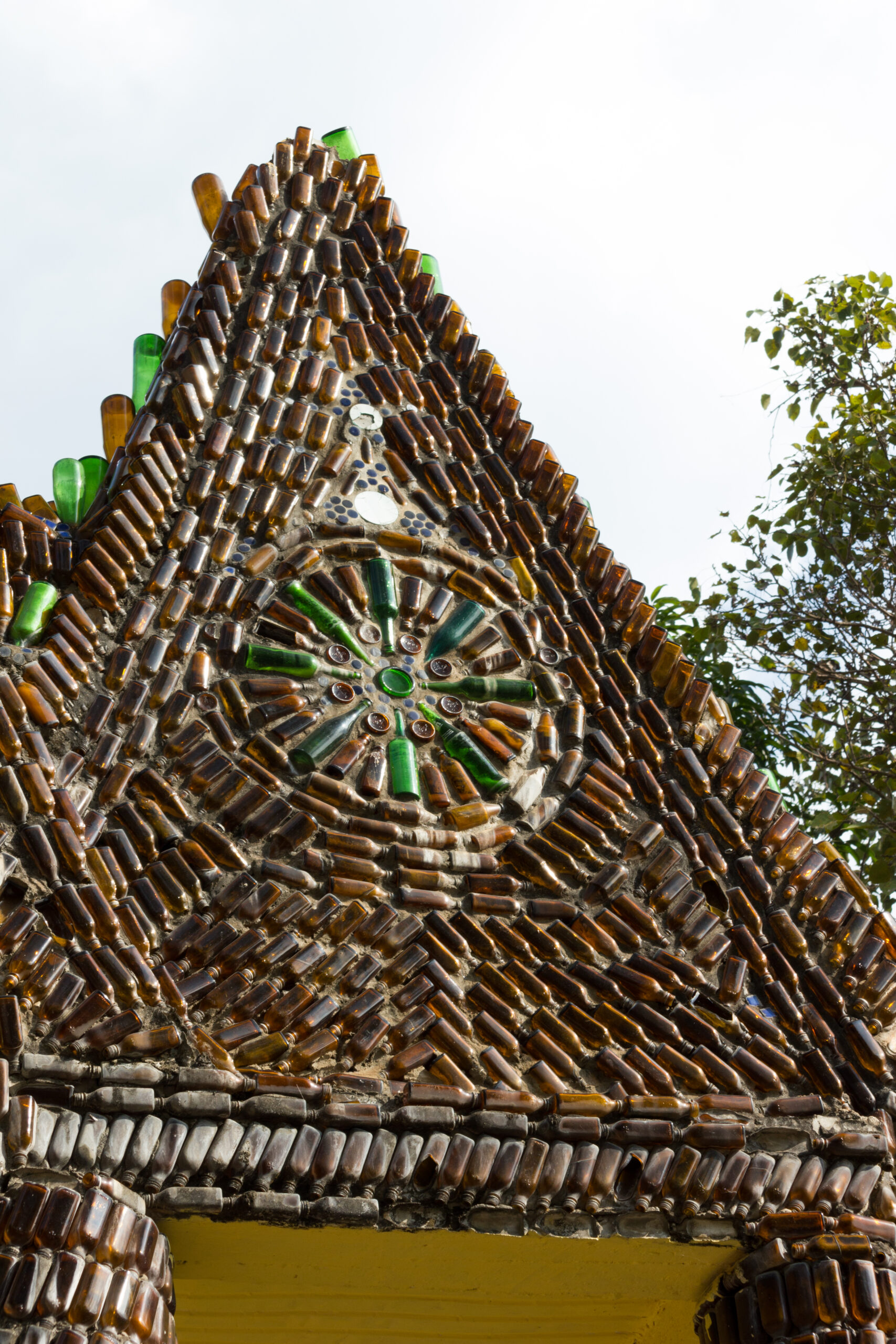 Sticlele nu sunt doar lipite pe suprafețe, ci integrate în structura zidurilor. Ele permit pătrunderea luminii, creând interioare scăldate într-o lumină aproape mistică. Tot complexul, care include sala principală de rugăciune, turnuri, case pentru călugări și chiar crematoriul, a fost ridicat folosind același principiu. Chiar și băile publice din incintă sunt acoperite cu mozaicuri de sticle. Un detaliu impresionant este modul în care capacele metalice ale sticlelor au fost reciclate ca elemente decorative.