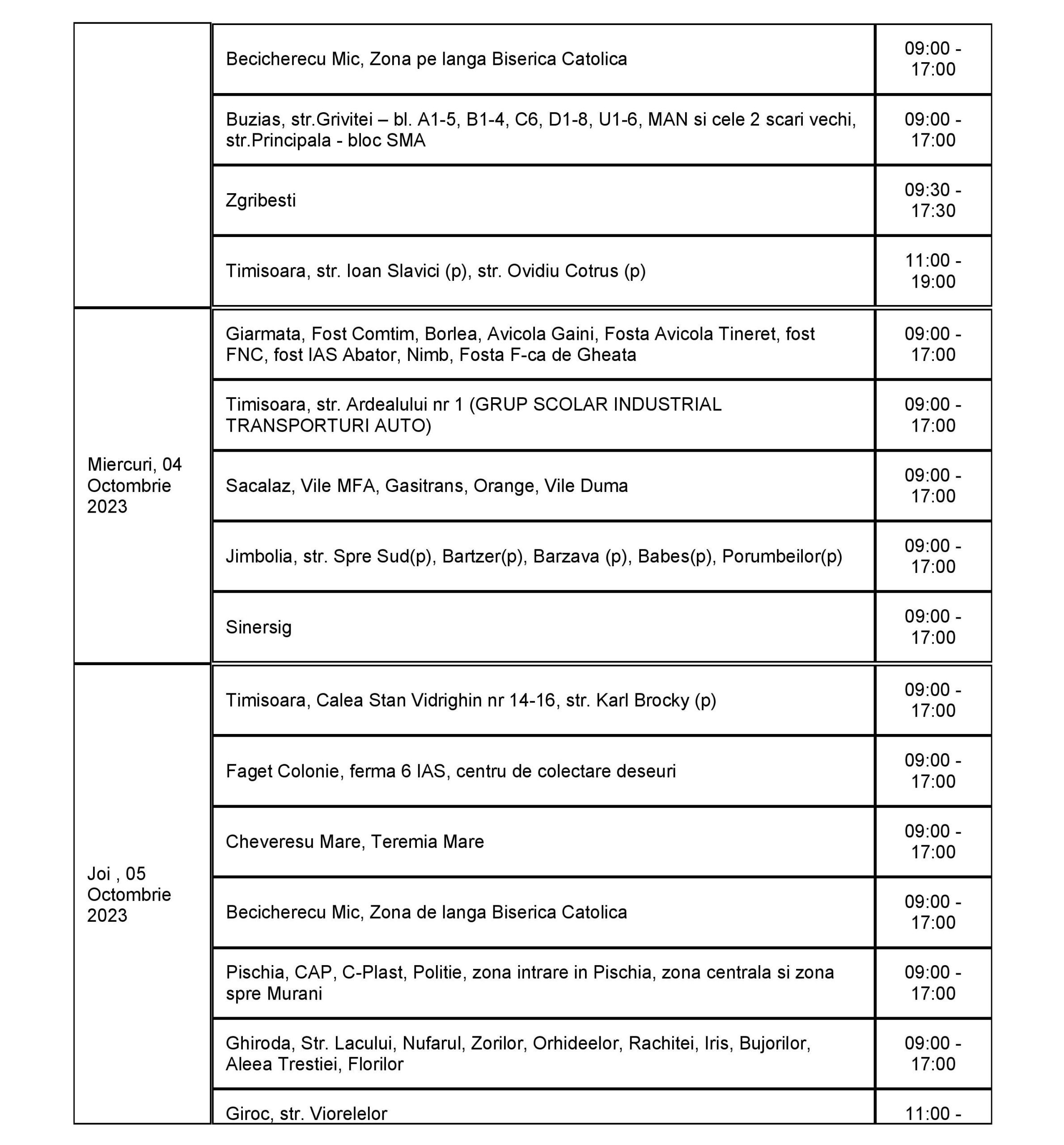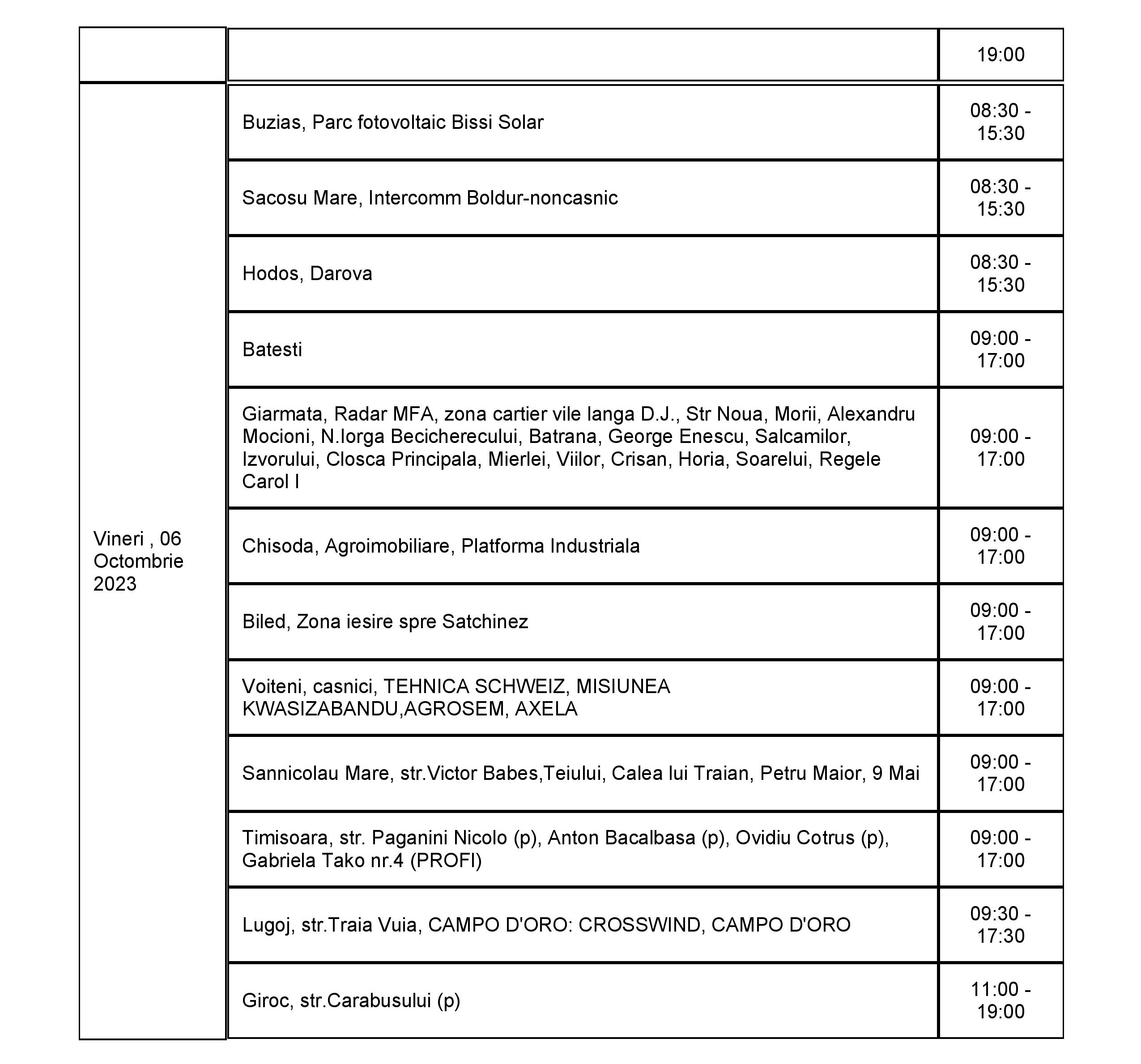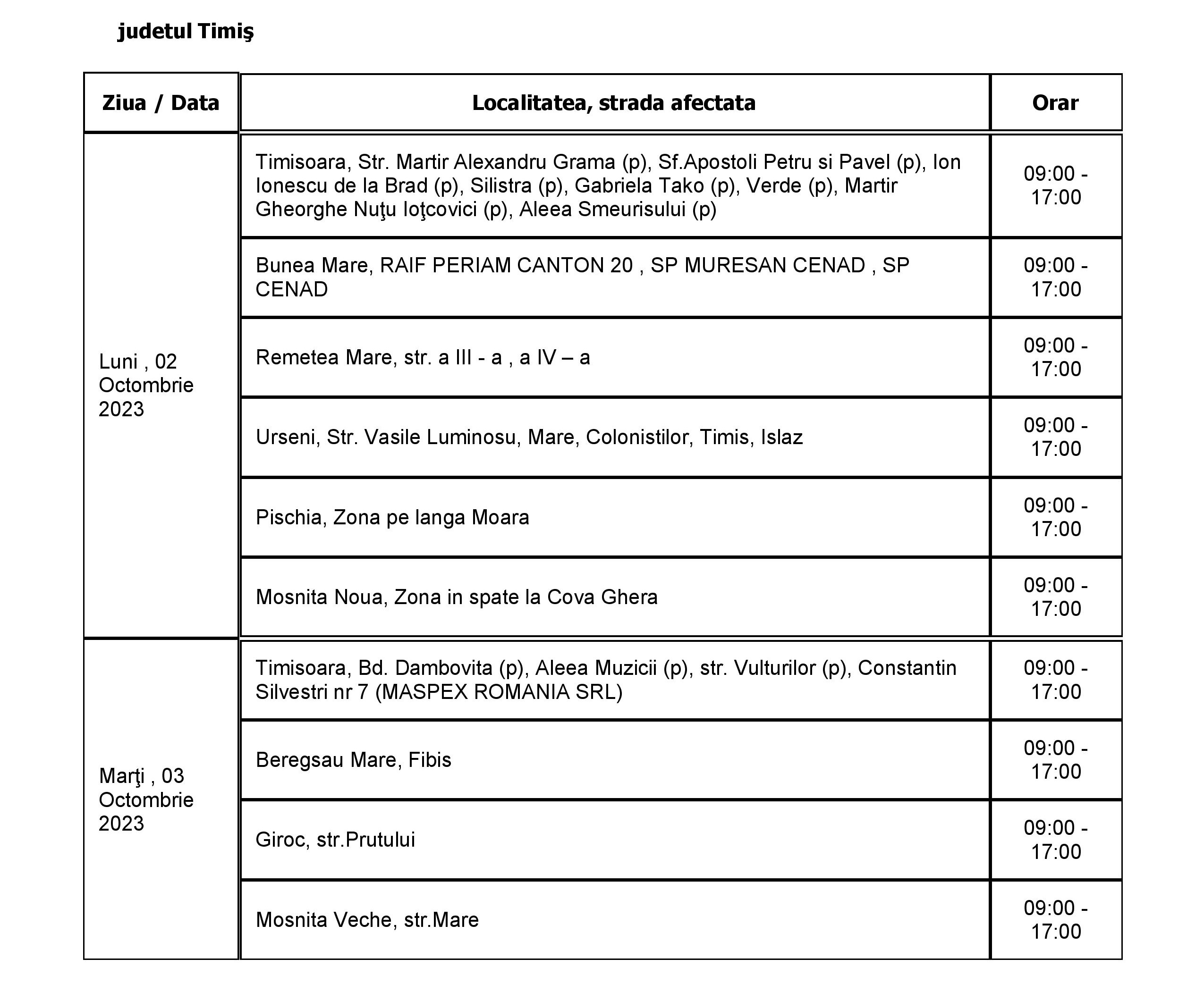 Lucrările au fost reduse la cele care sunt necesare pentru a asigura capacitatea rețelei de a funcționa și a alimenta clienții cu energie electrică în bune condiții. În perioada 2 – 8 octombrie, curentul va fi întrerupt astfel: