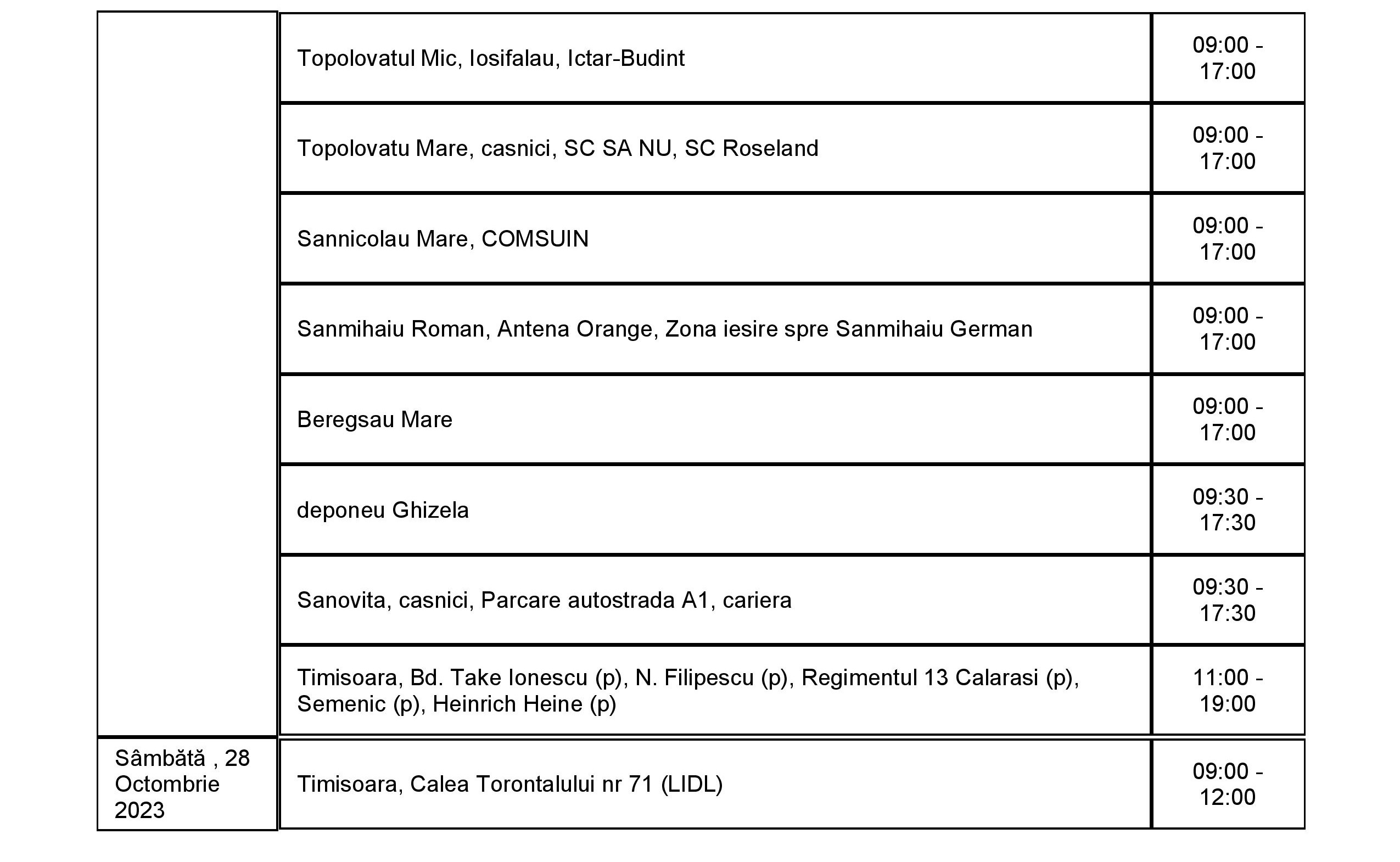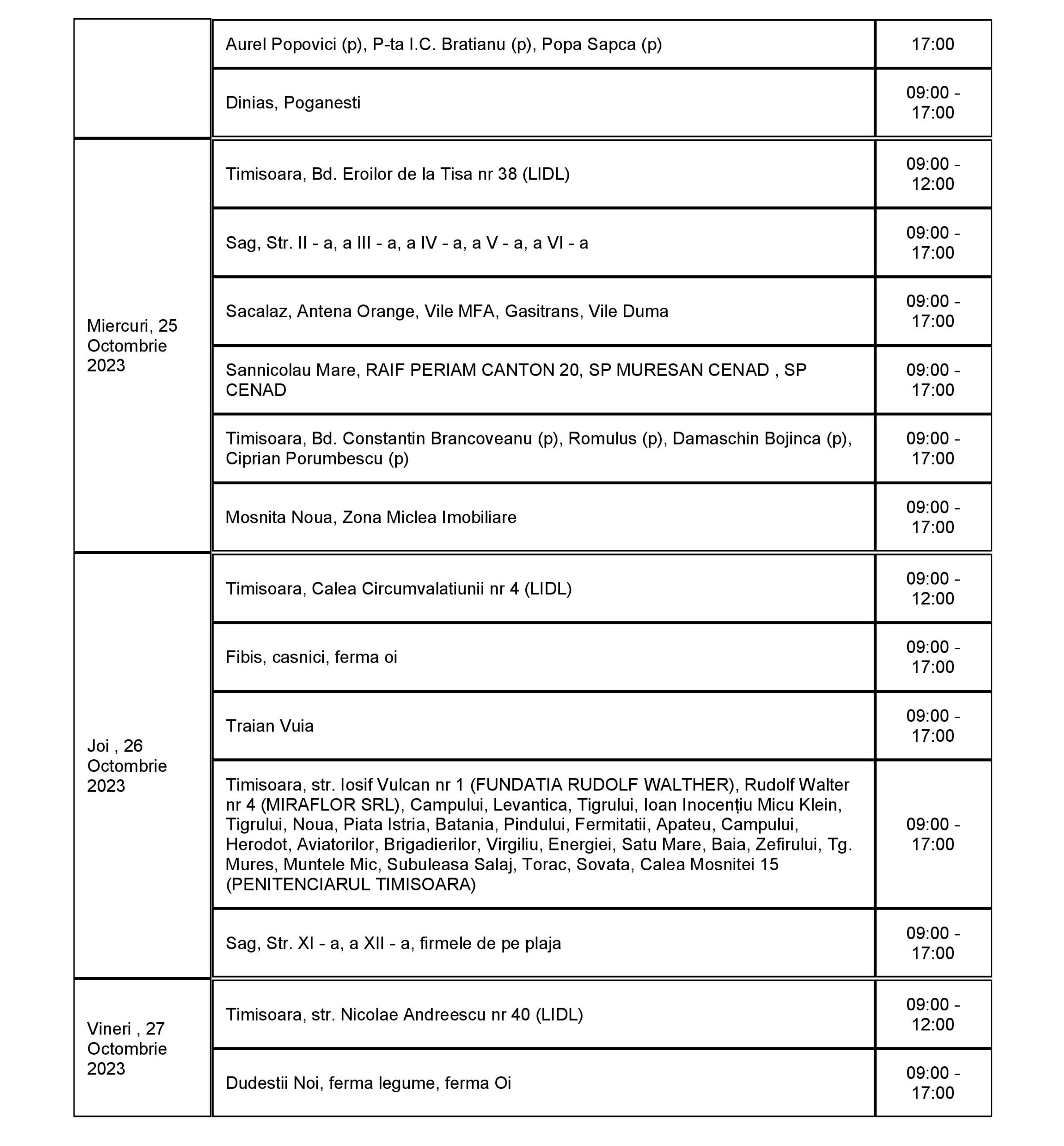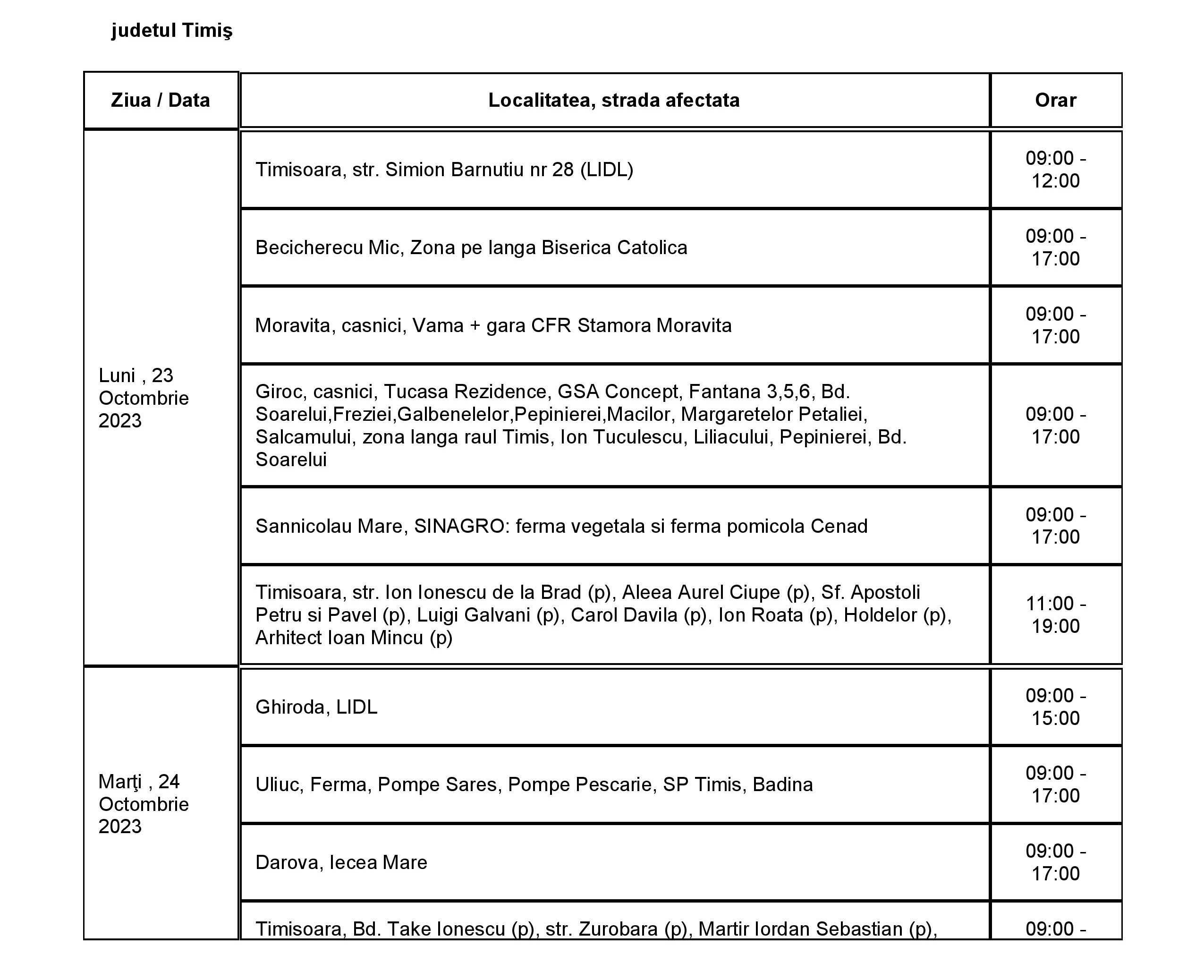 Lucrările au fost reduse la cele care sunt necesare pentru a asigura capacitatea rețelei de a funcționa și a alimenta clienții cu energie electrică în bune condiții. În perioada 23 – 29 octombrie, curentul va fi întrerupt astfel:
