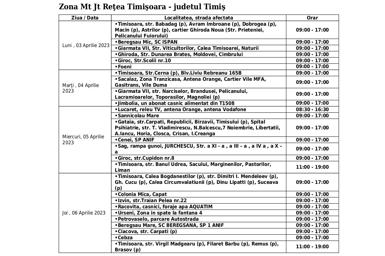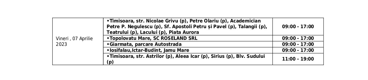 Lucrările au fost reduse la cele care sunt necesare pentru a asigura capacitatea rețelei de a funcționa și a alimenta clienții cu energie electrică în bune condiții. În perioada 3 – 9 aprilie, curentul va fi întrerupt astfel: