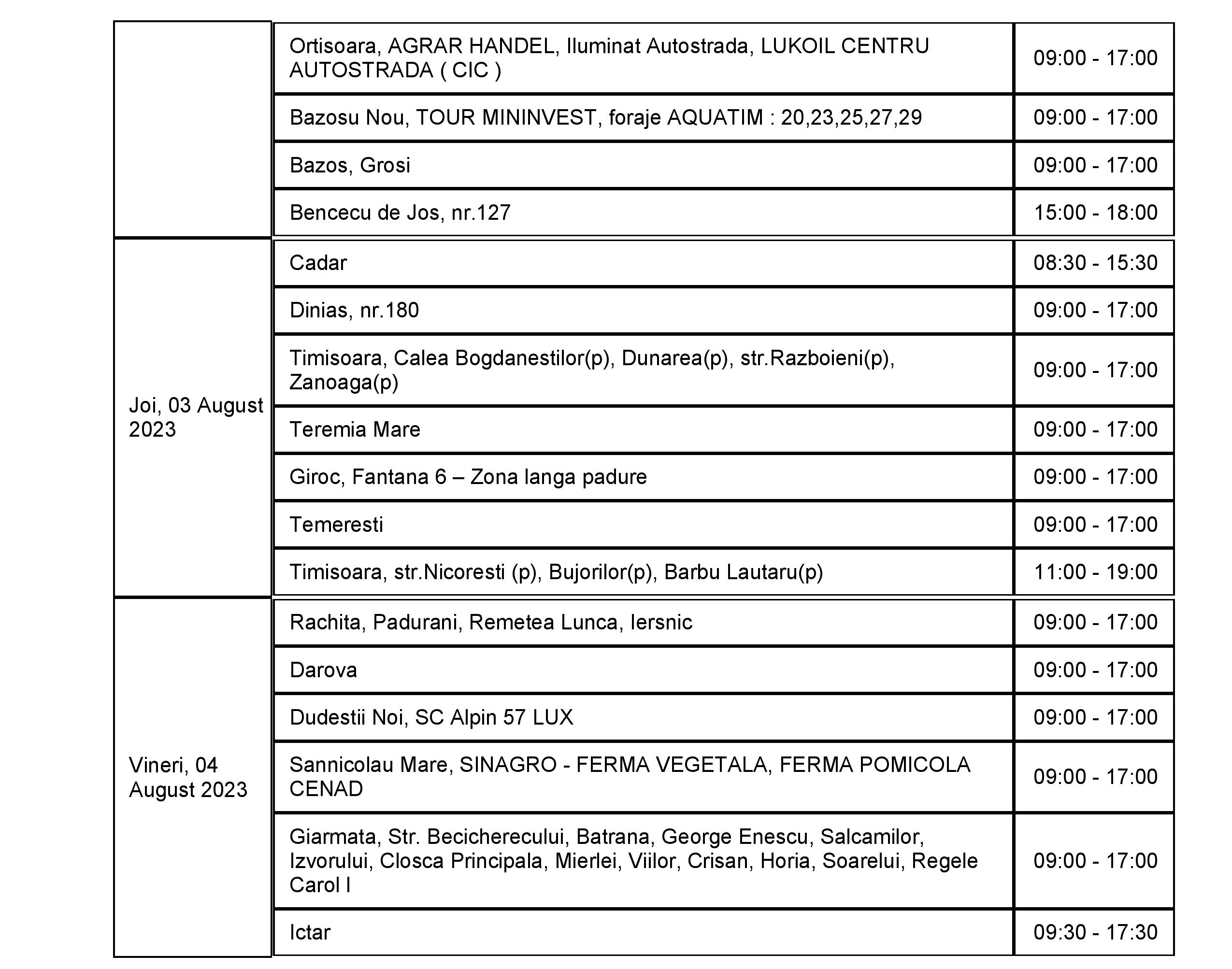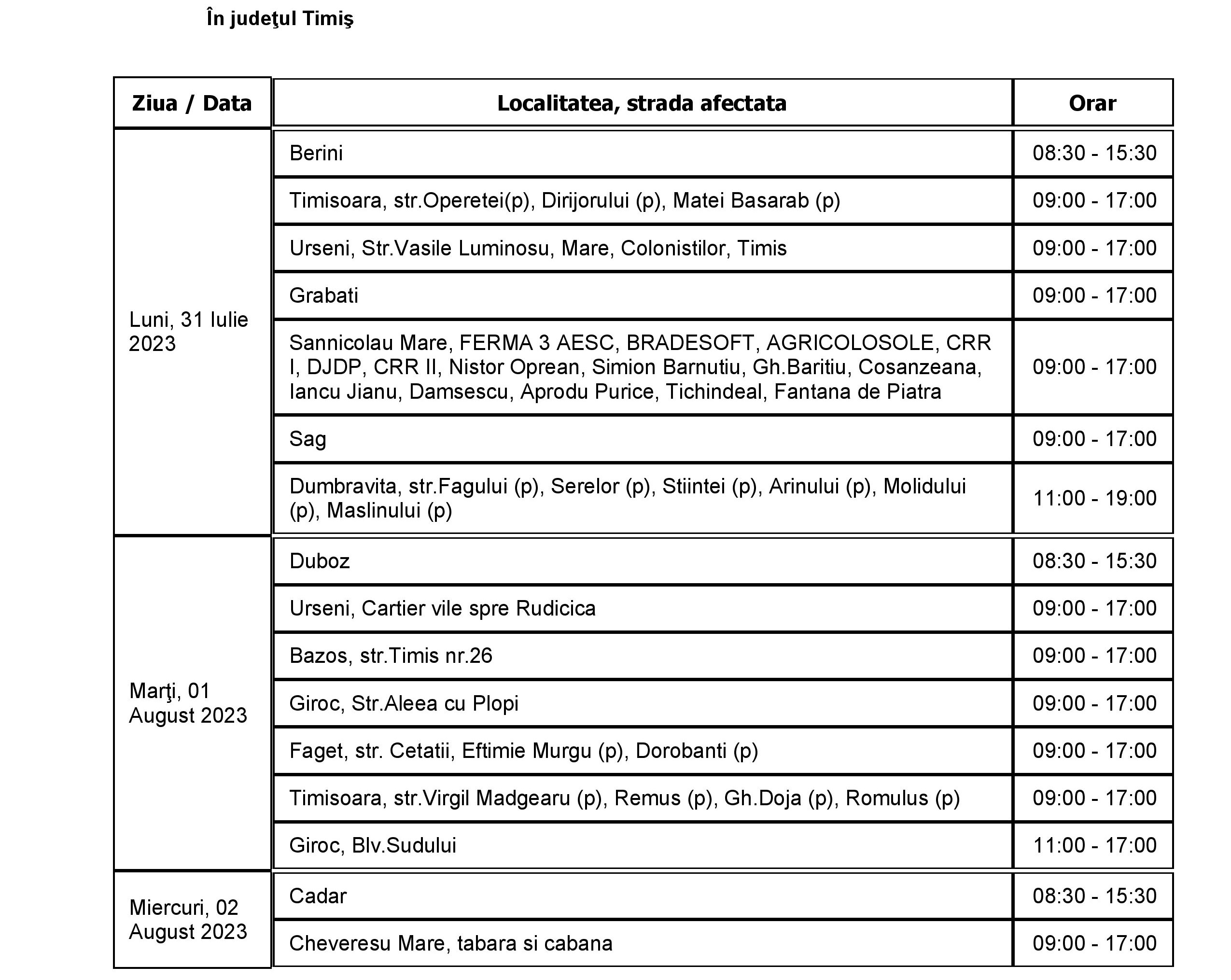 Lucrările au fost reduse la cele care sunt necesare pentru a asigura capacitatea rețelei de a funcționa și a alimenta clienții cu energie electrică în bune condiții. În perioada 31 iulie – 6 august, curentul va fi întrerupt astfel:
