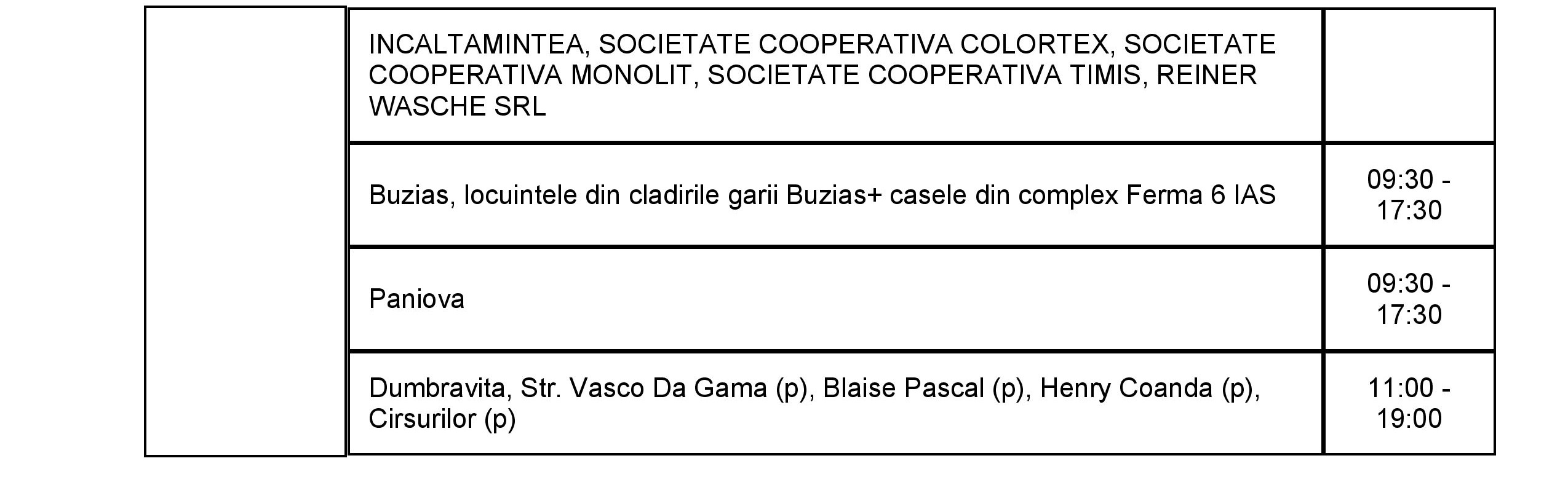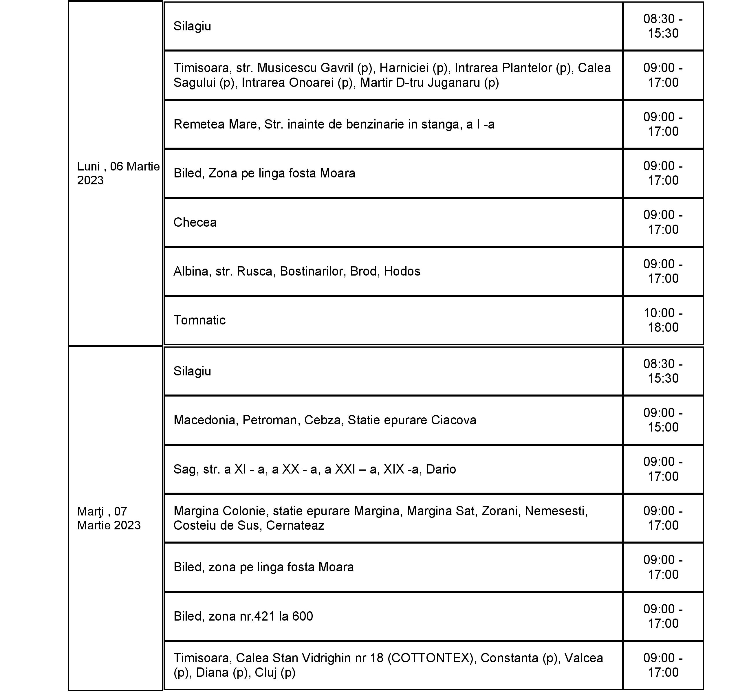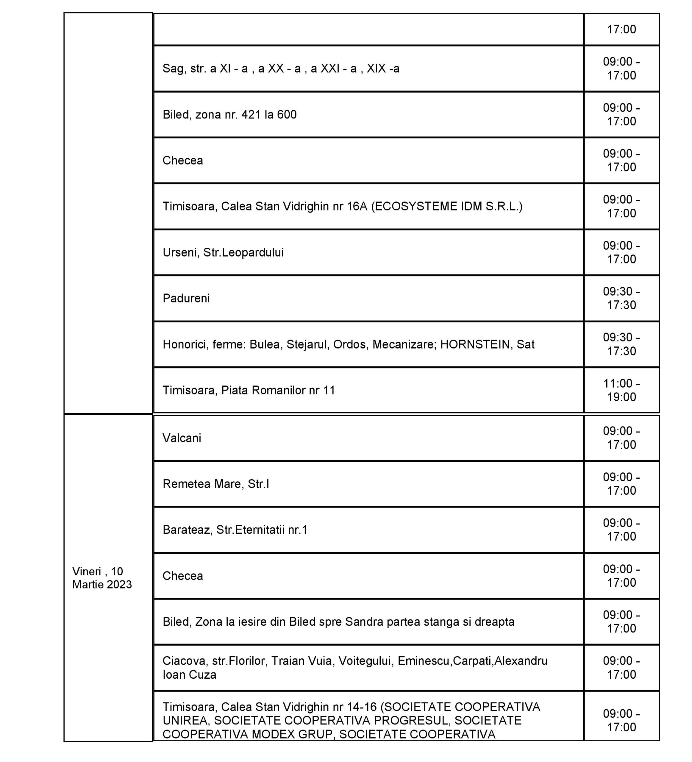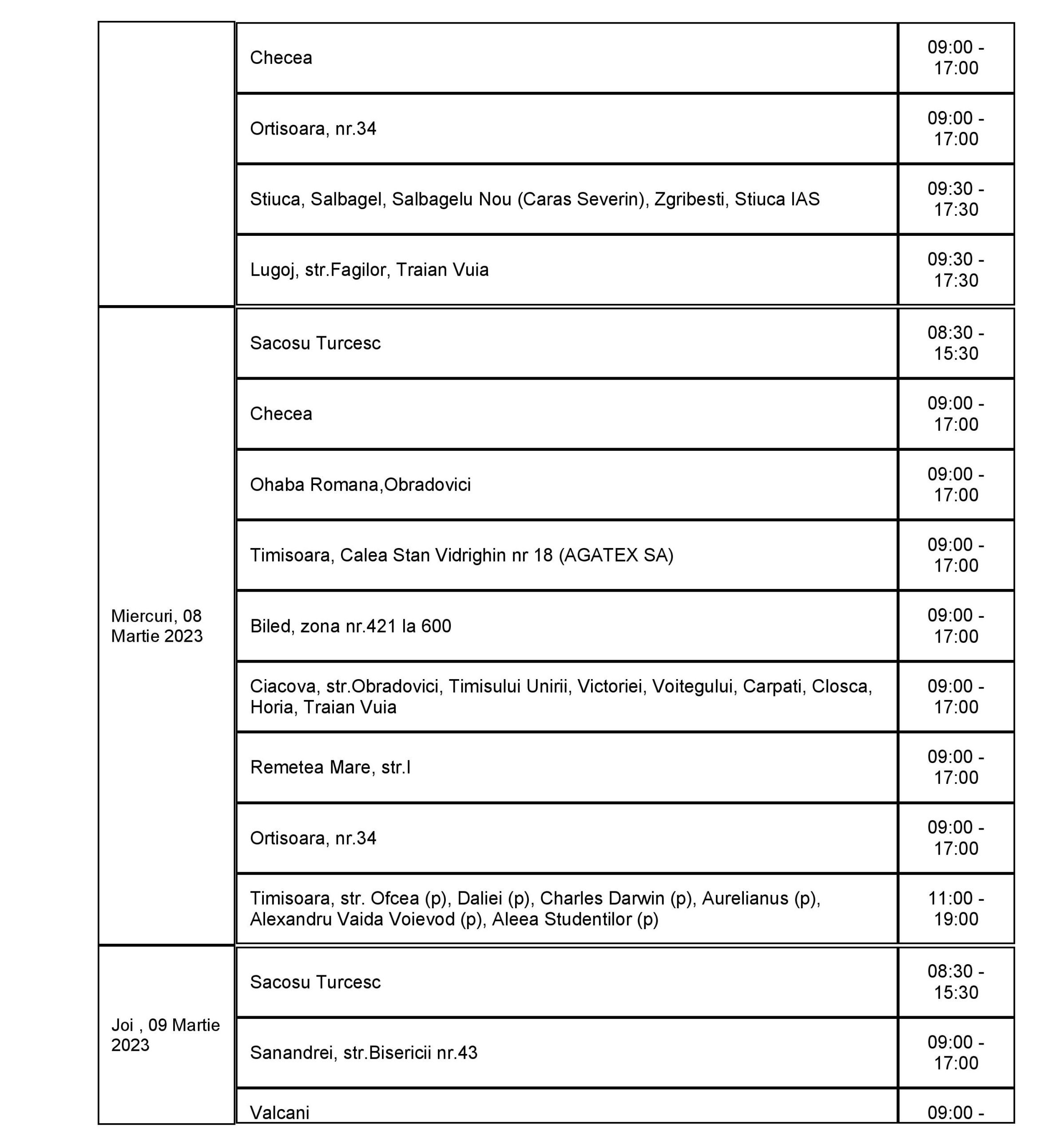 Lucrările au fost reduse la cele care sunt necesare pentru a asigura capacitatea rețelei de a funcționa și a alimenta clienții cu energie electrică în bune condiții. În perioada 6 – 12 martie, curentul va fi întrerupt astfel: