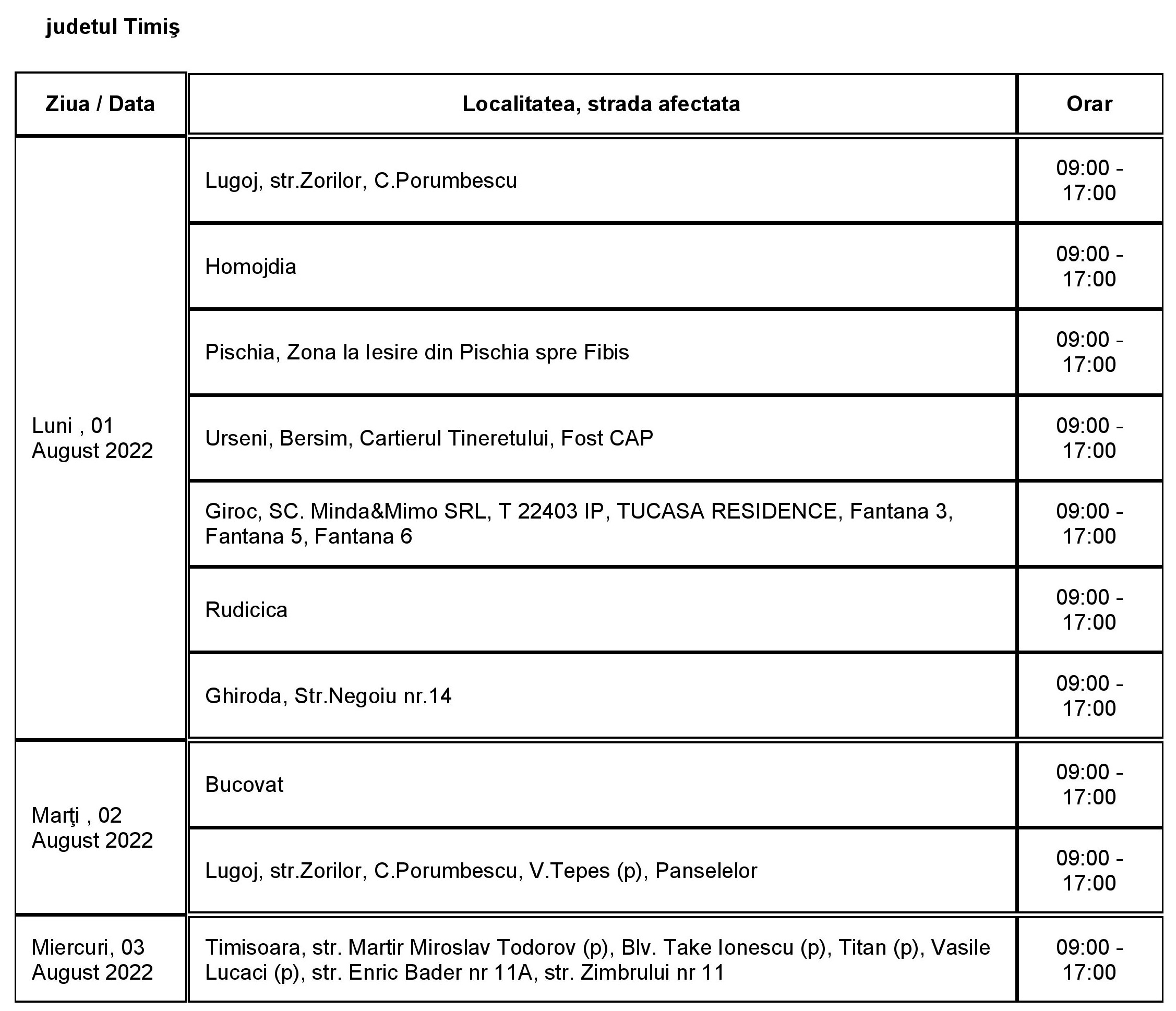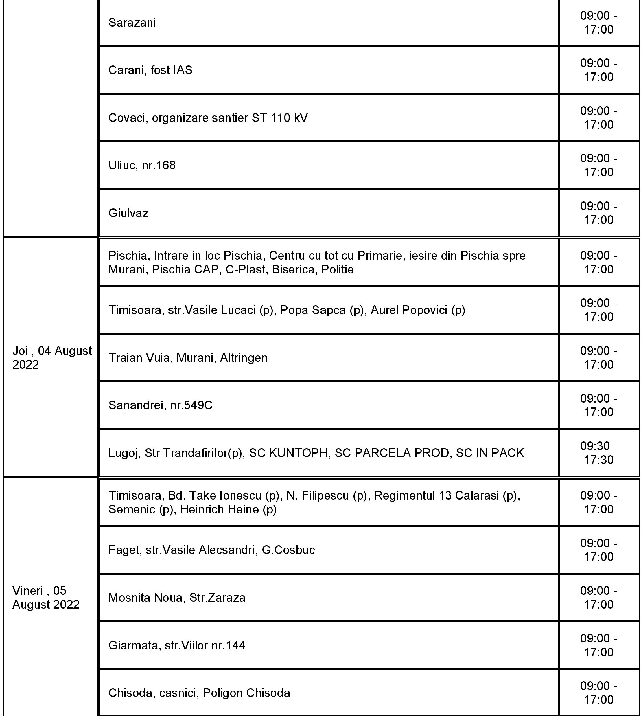 Lucrările au fost reduse la cele care sunt necesare pentru a asigura capacitatea rețelei de a funcționa și a alimenta clienții cu energie electrică în bune condiții. În perioada 1 – 7 august, curentul va fi întrerupt astfel: