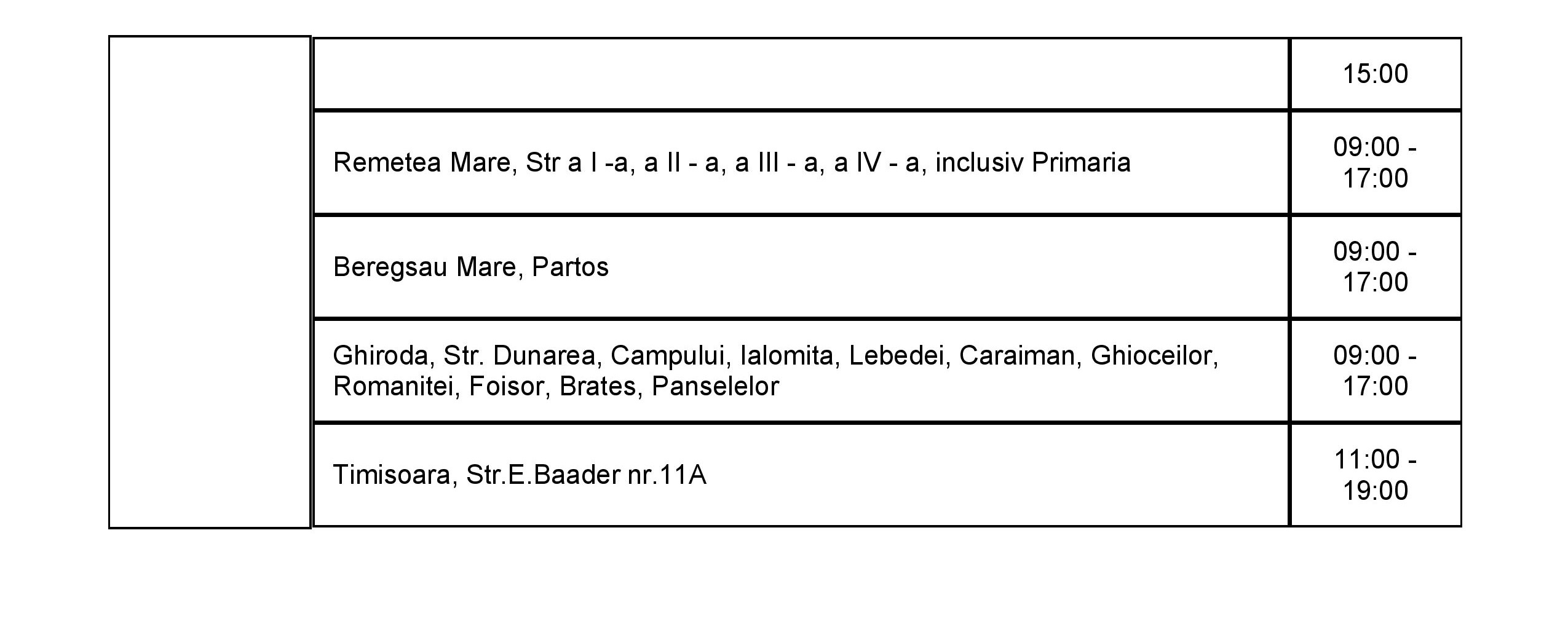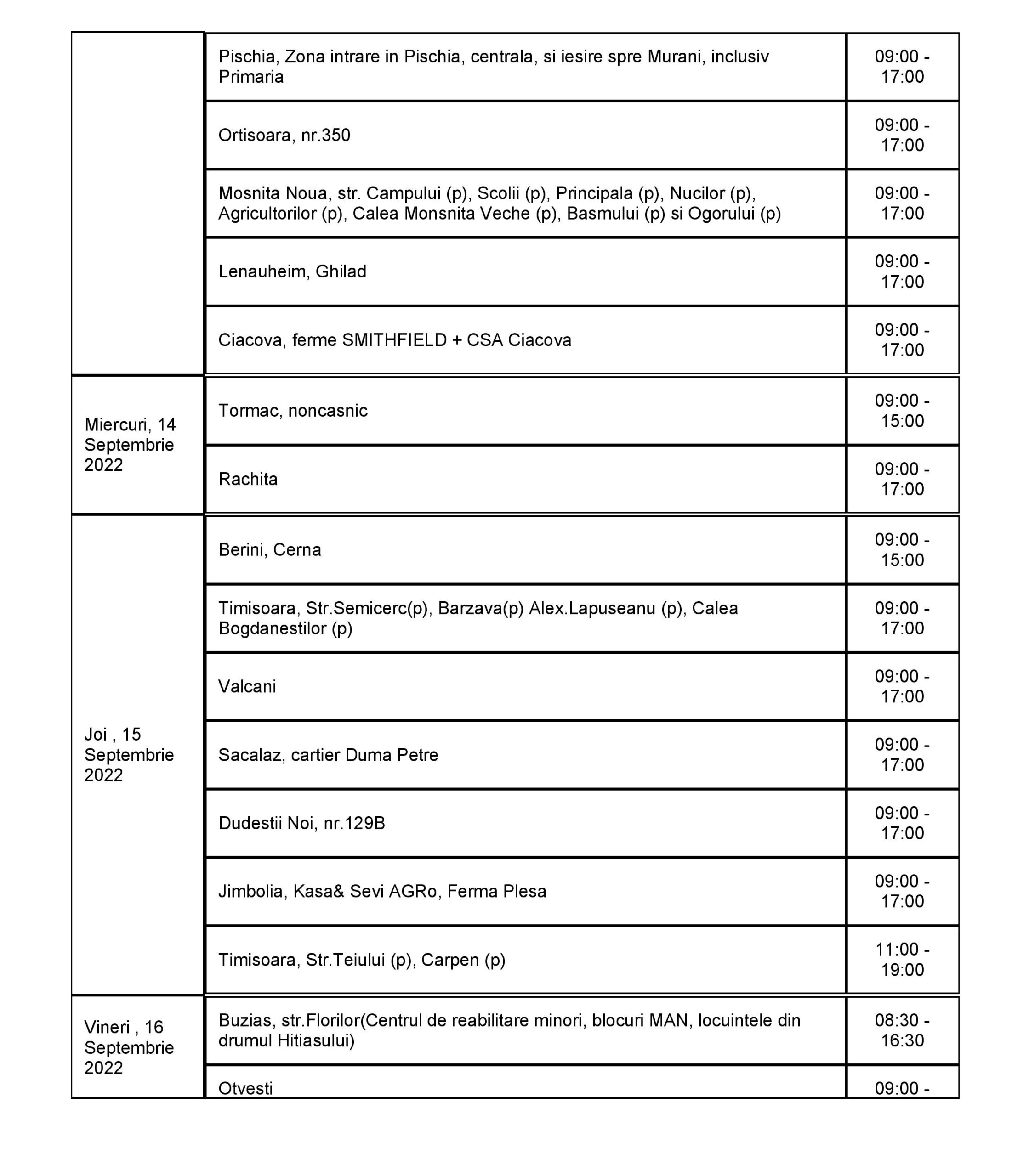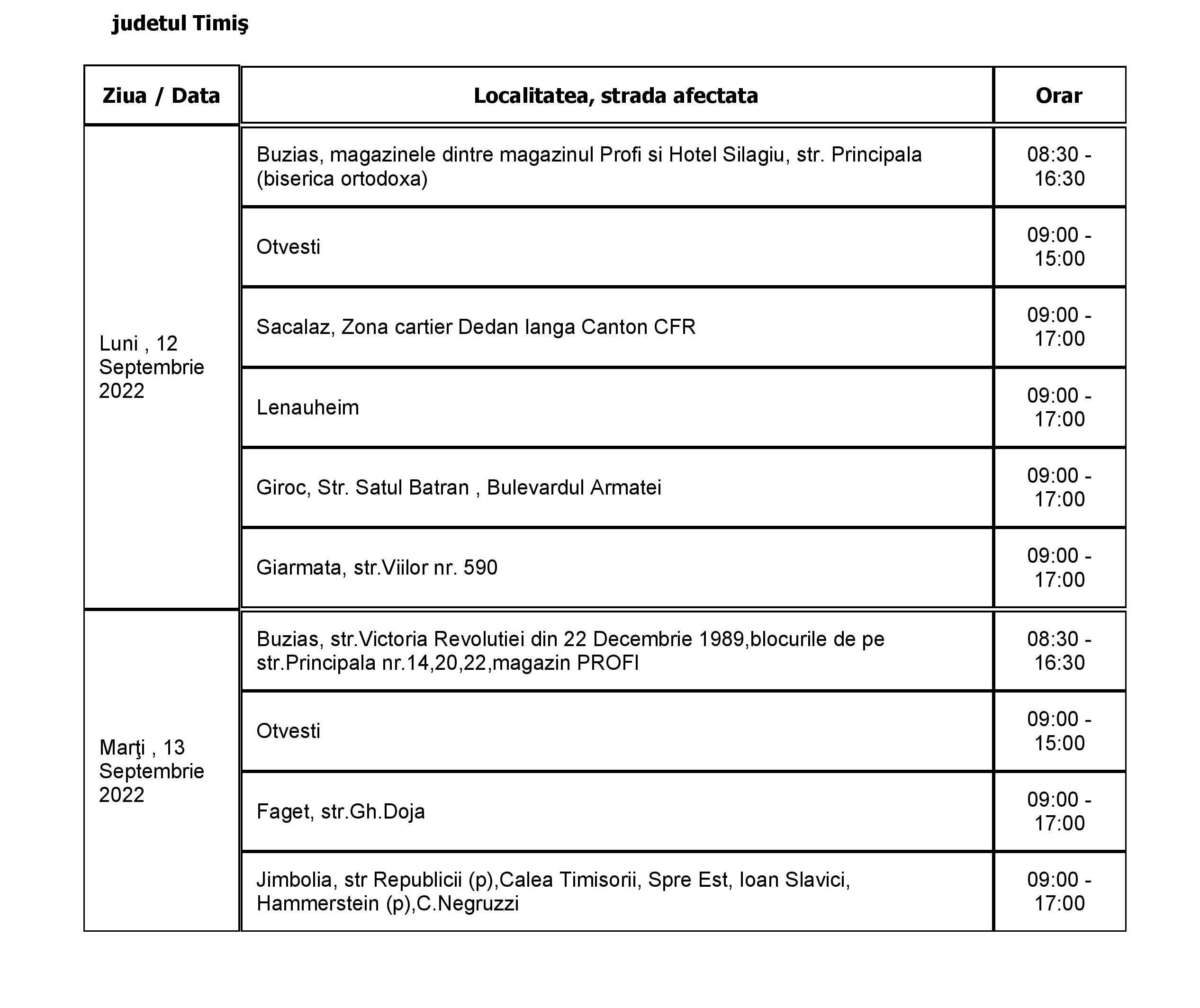 Lucrările au fost reduse la cele care sunt necesare pentru a asigura capacitatea rețelei de a funcționa și a alimenta clienții cu energie electrică în bune condiții. În perioada 12 septembrie – 18 septembrie, curentul va fi întrerupt astfel: