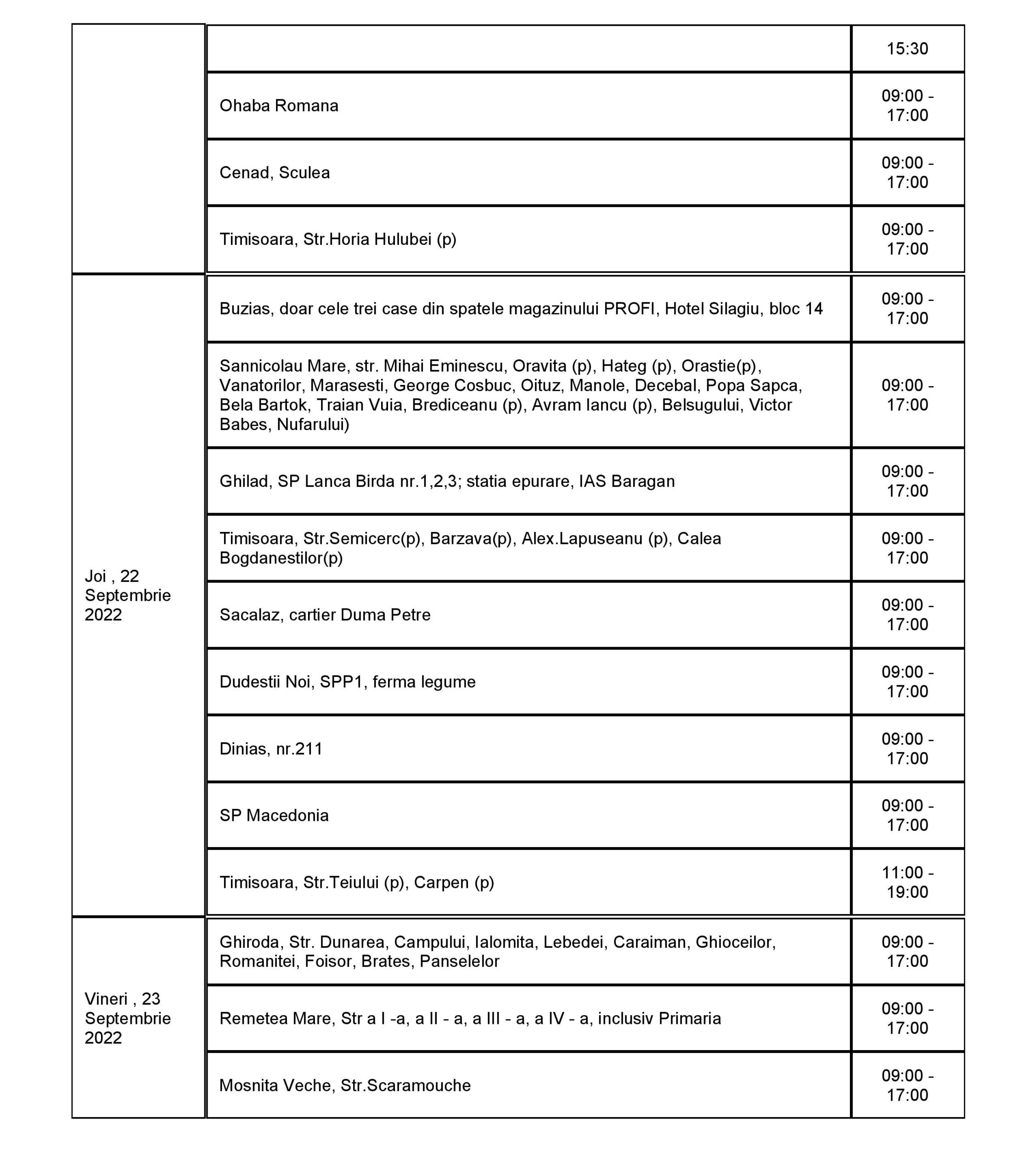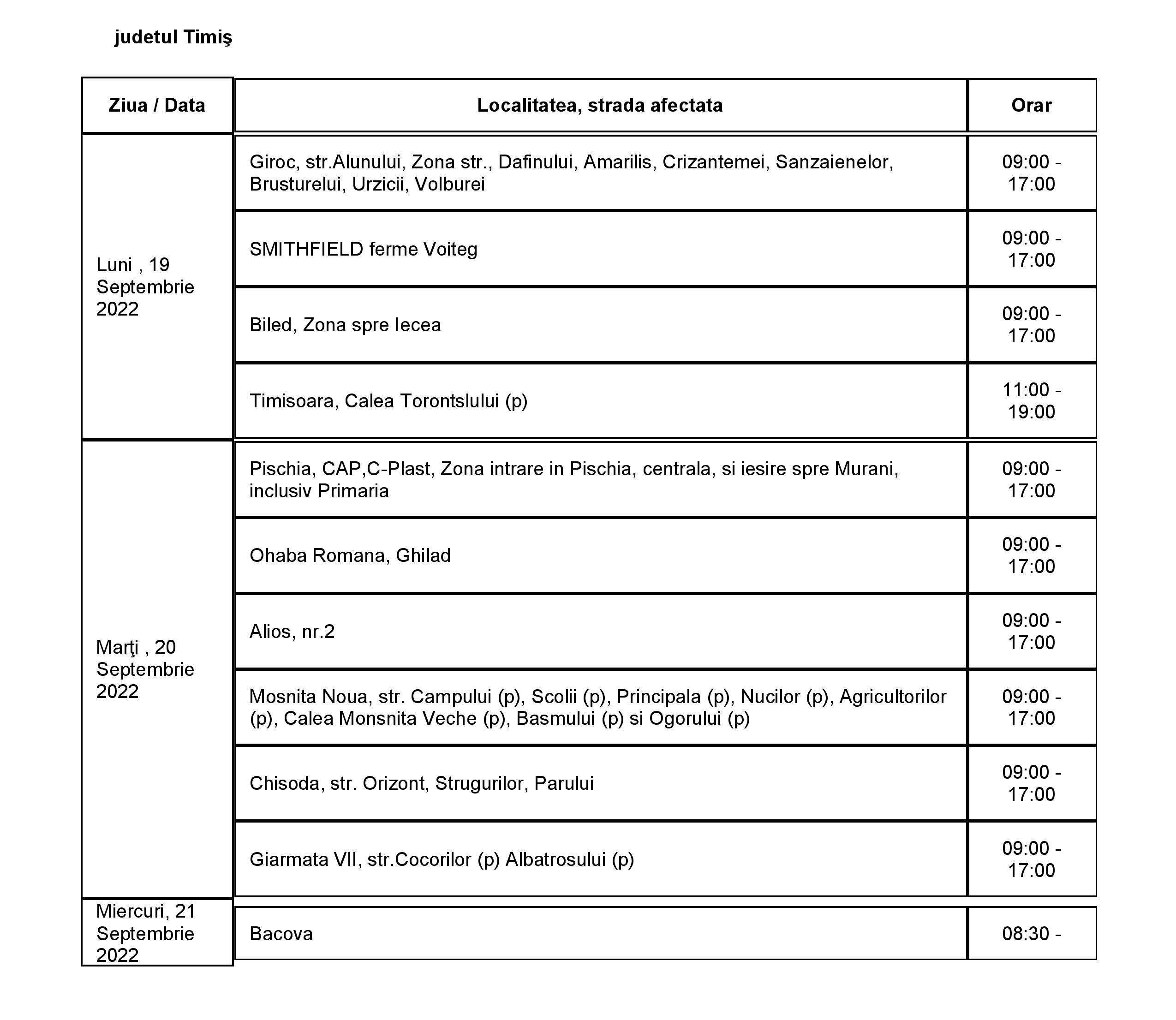 Lucrările au fost reduse la cele care sunt necesare pentru a asigura capacitatea rețelei de a funcționa și a alimenta clienții cu energie electrică în bune condiții. În perioada 19 septembrie – 25 septembrie, curentul va fi întrerupt astfel: