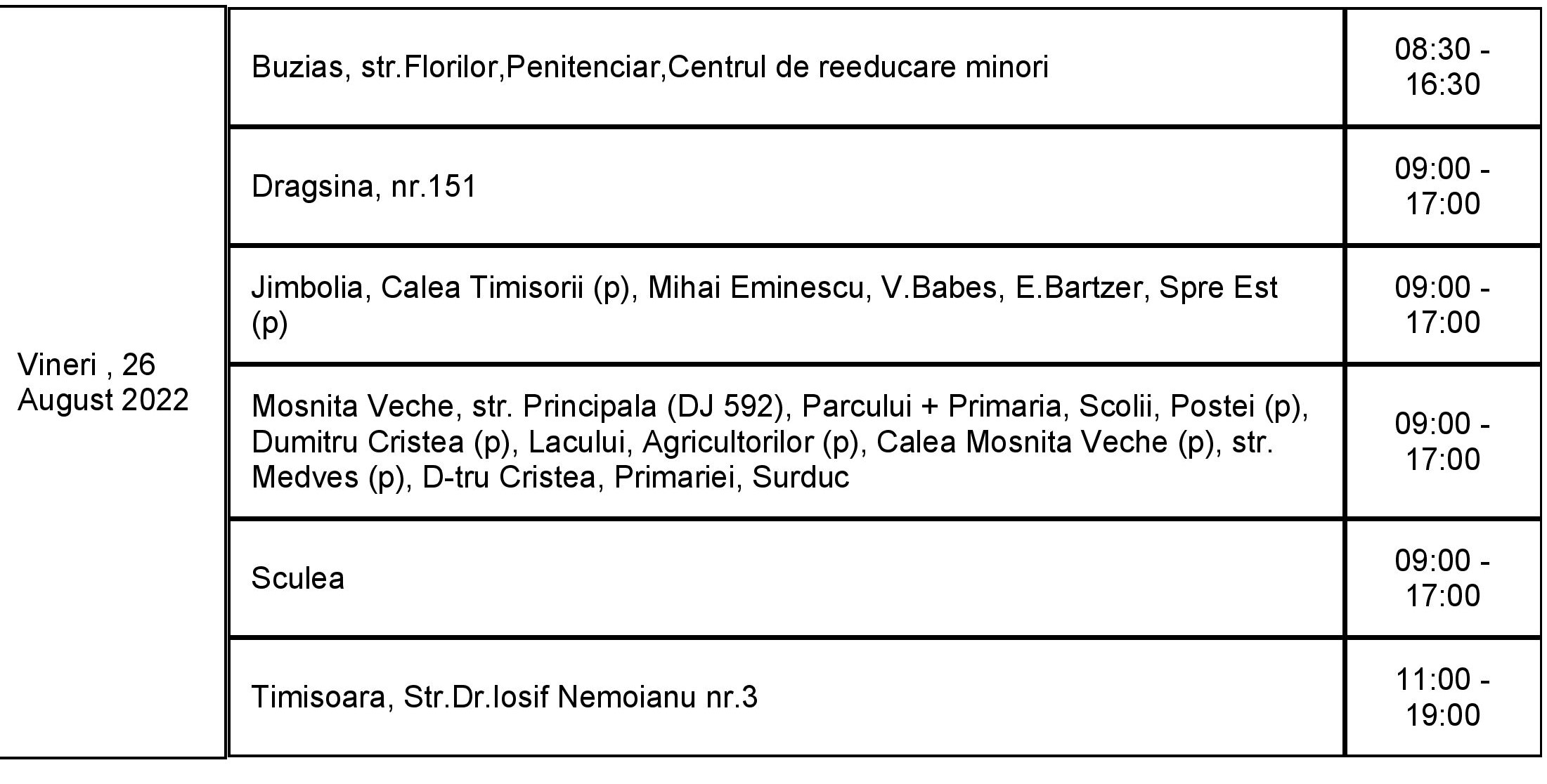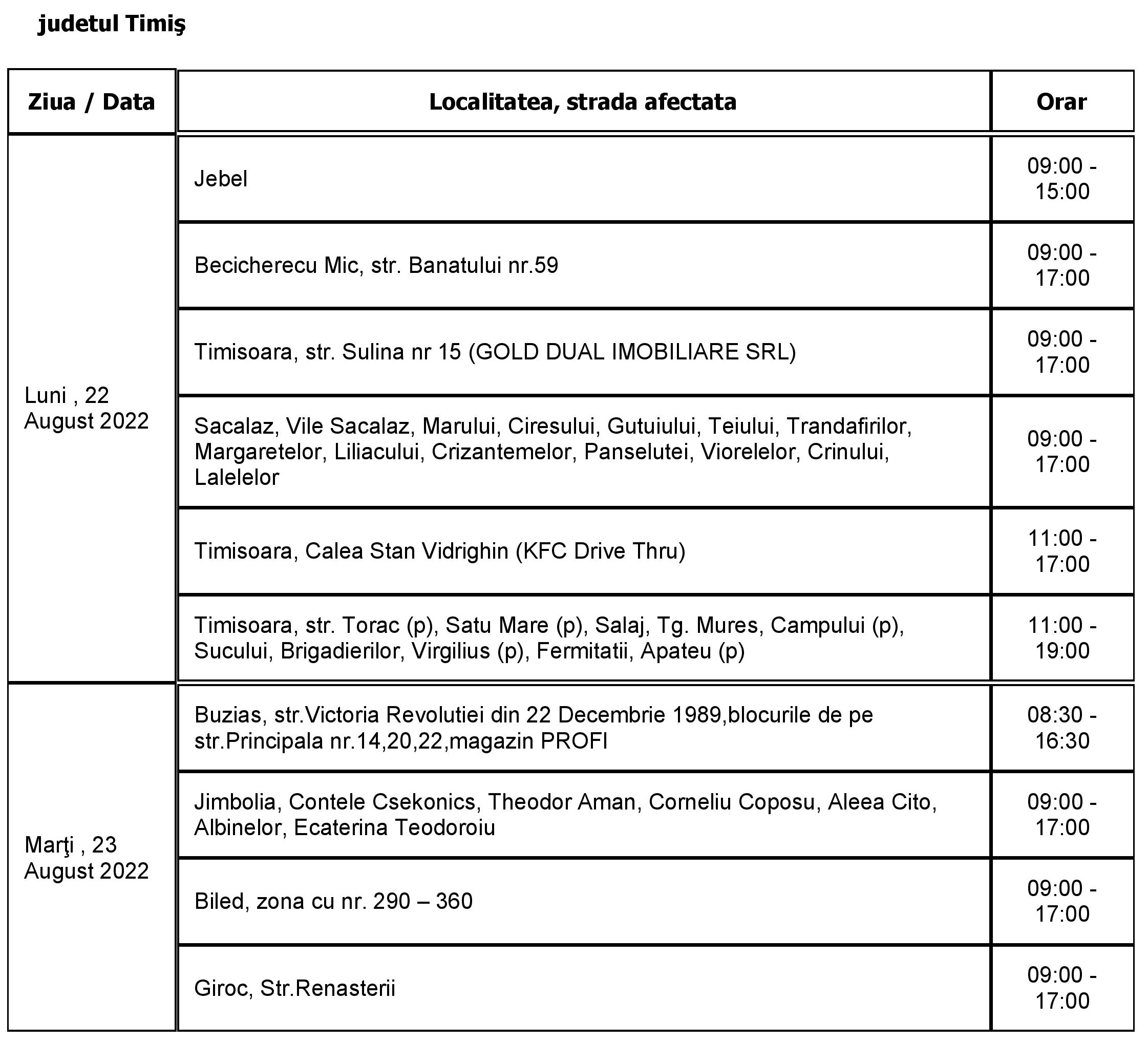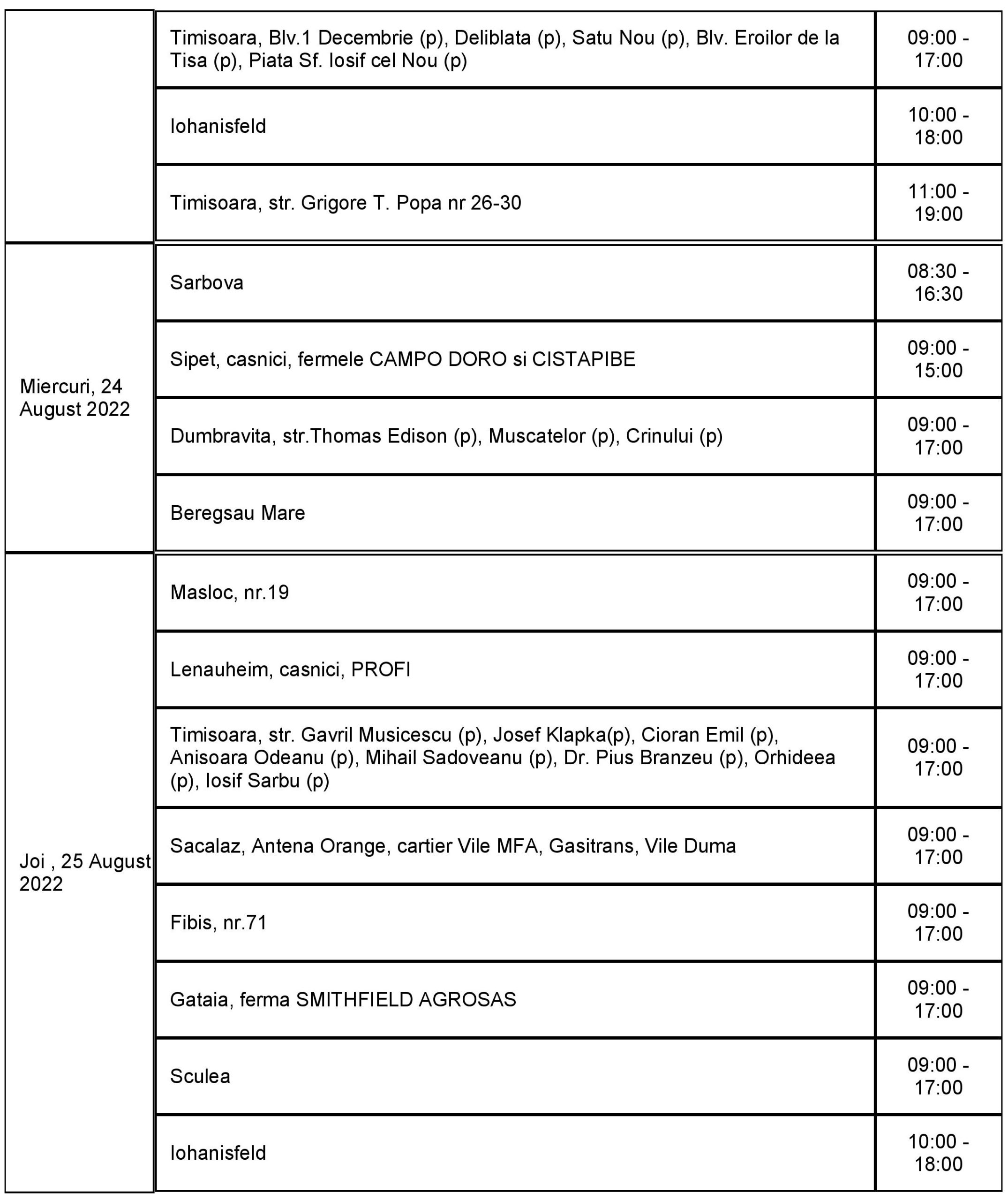Lucrările au fost reduse la cele care sunt necesare pentru a asigura capacitatea rețelei de a funcționa și a alimenta clienții cu energie electrică în bune condiții. În perioada 22 – 28 august, curentul va fi întrerupt astfel: