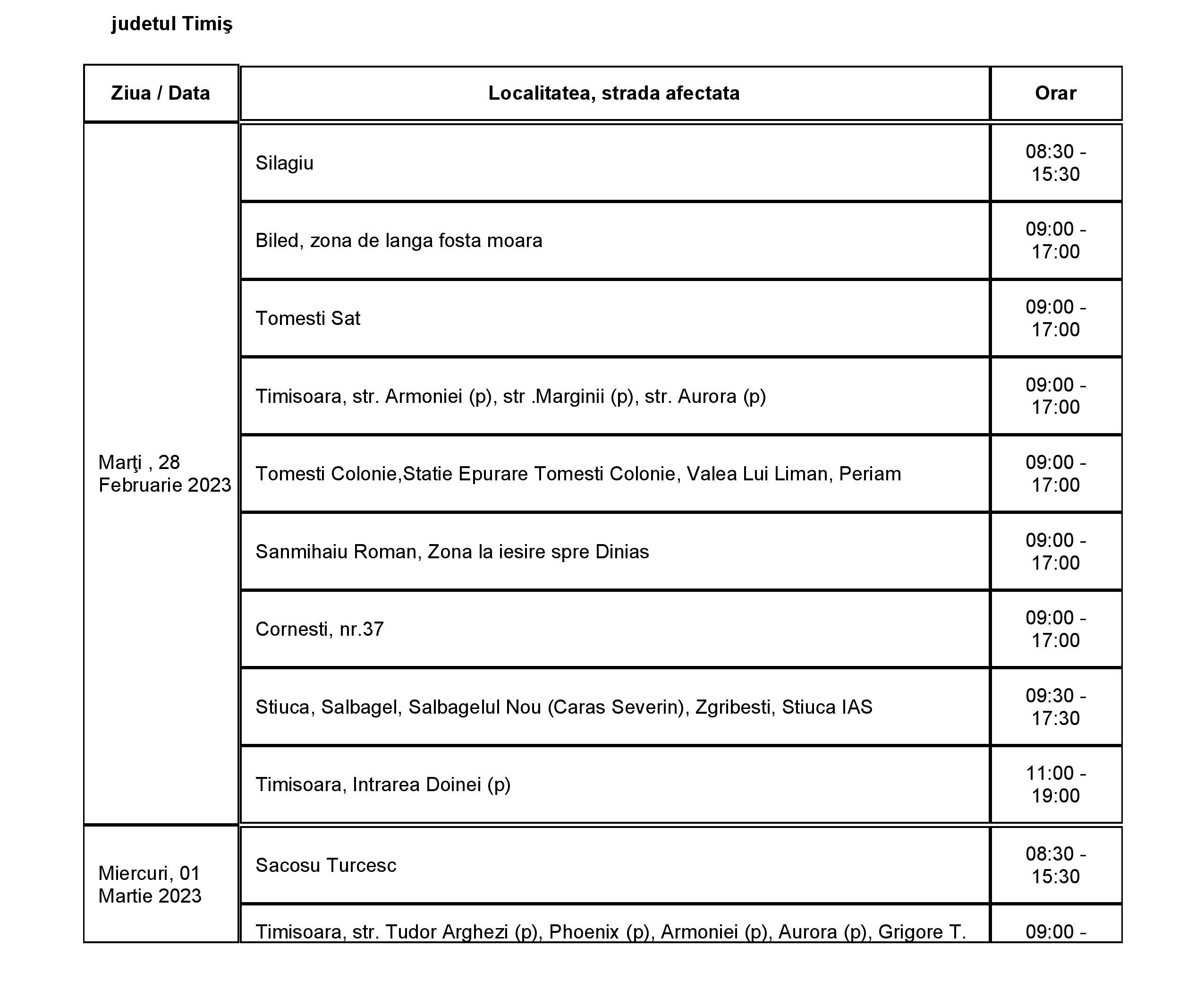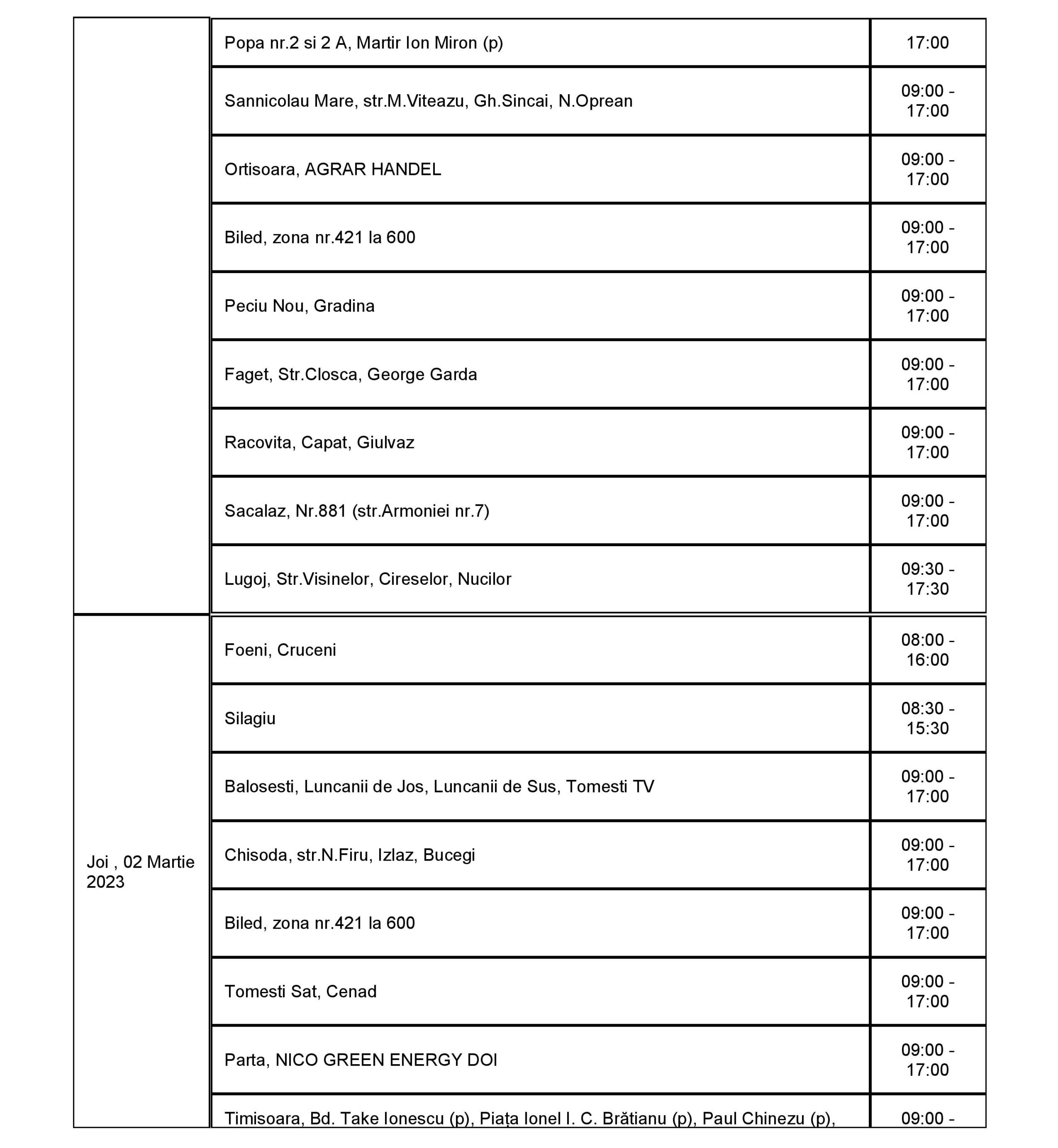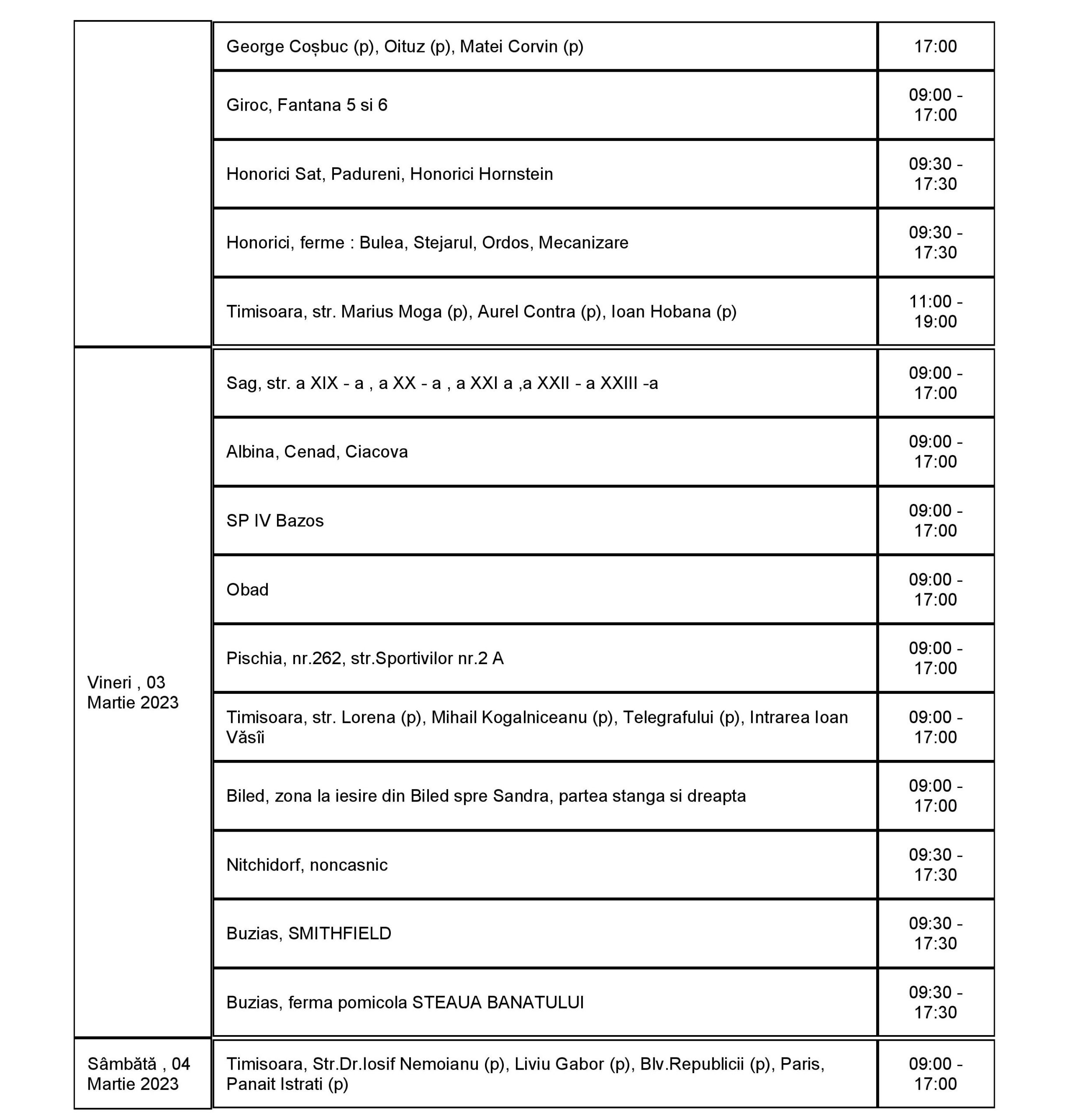 Lucrările au fost reduse la cele care sunt necesare pentru a asigura capacitatea rețelei de a funcționa și a alimenta clienții cu energie electrică în bune condiții. În perioada 28 februarie – 4 martie, curentul va fi întrerupt astfel:
