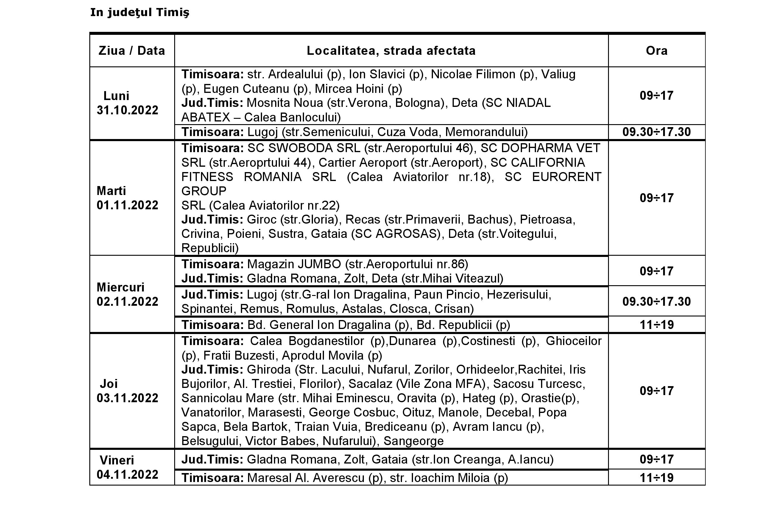 Lucrările au fost reduse la cele care sunt necesare pentru a asigura capacitatea rețelei de a funcționa și a alimenta clienții cu energie electrică în bune condiții. În perioada 31 octombrie – 6 noiembrie, curentul va fi întrerupt astfel: