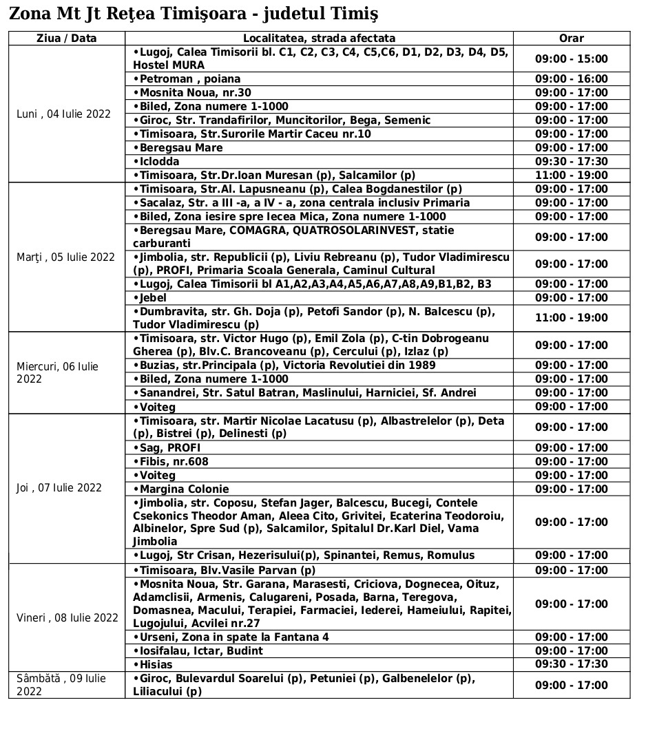Lucrările au fost reduse la cele care sunt necesare pentru a asigura capacitatea rețelei de a funcționa și a alimenta clienții cu energie electrică în bune condiții. În perioada 4 – 9 iulie, curentul va fi întrerupt astfel:
