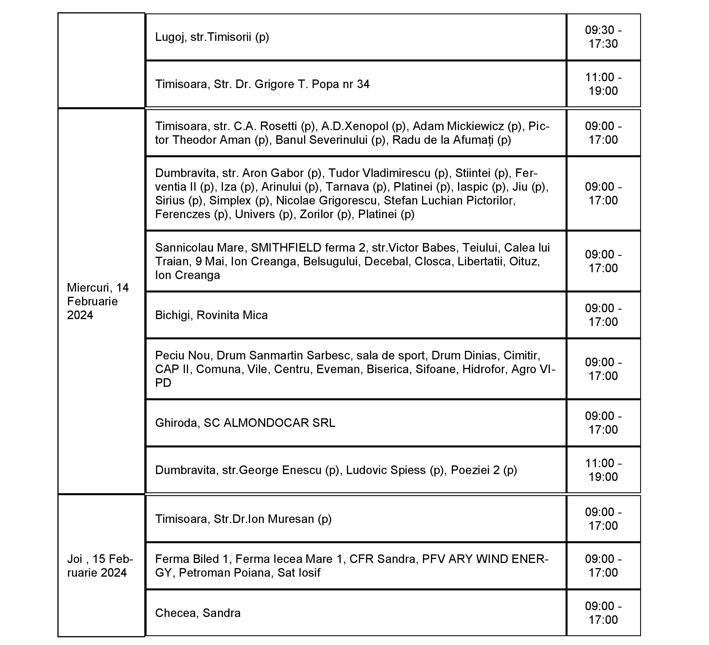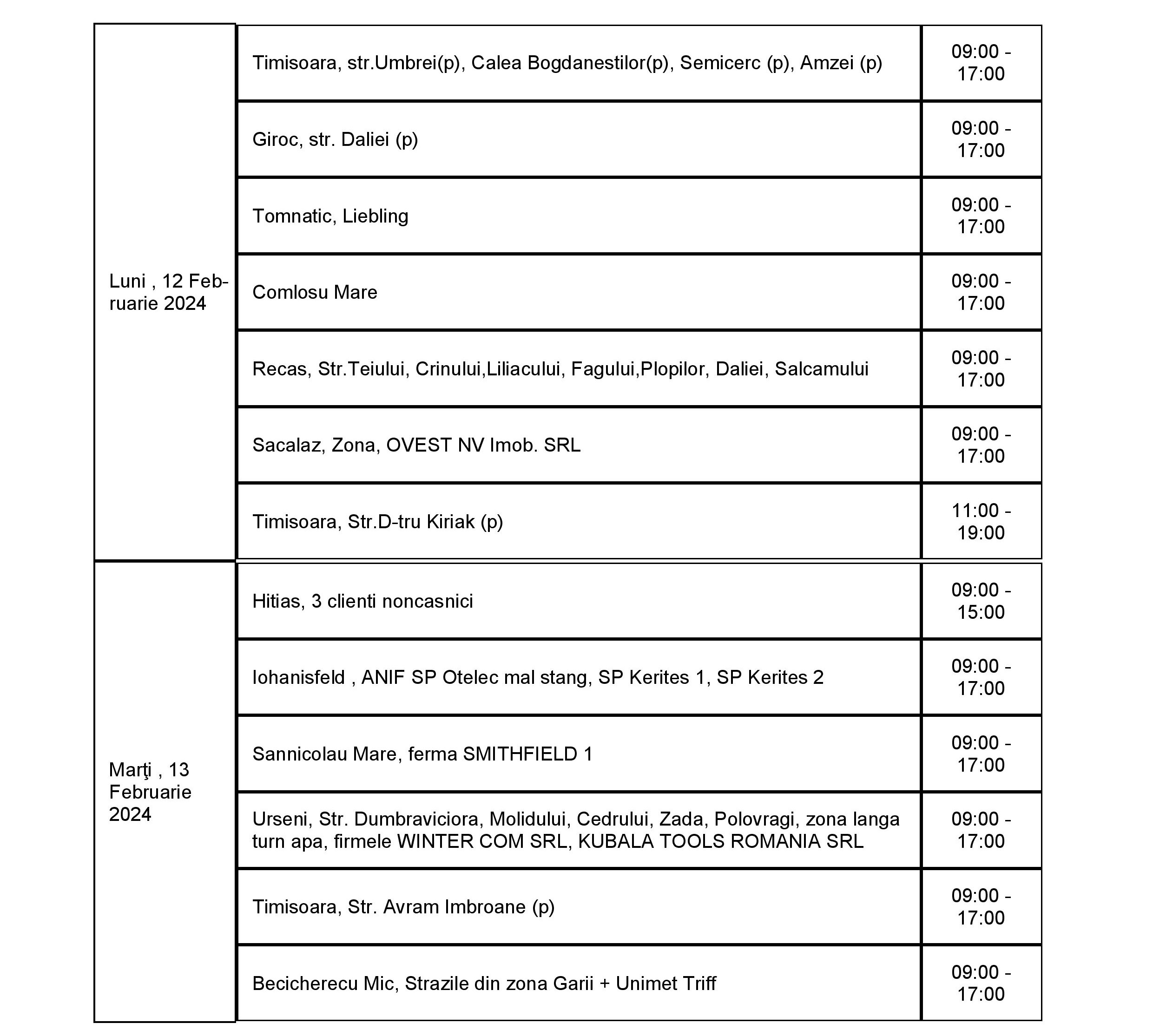 Lucrările au fost reduse la cele care sunt necesare pentru a asigura capacitatea rețelei de a funcționa și a alimenta clienții cu energie electrică în bune condiții. În perioada 12 – 18 februarie, curentul va fi întrerupt astfel: