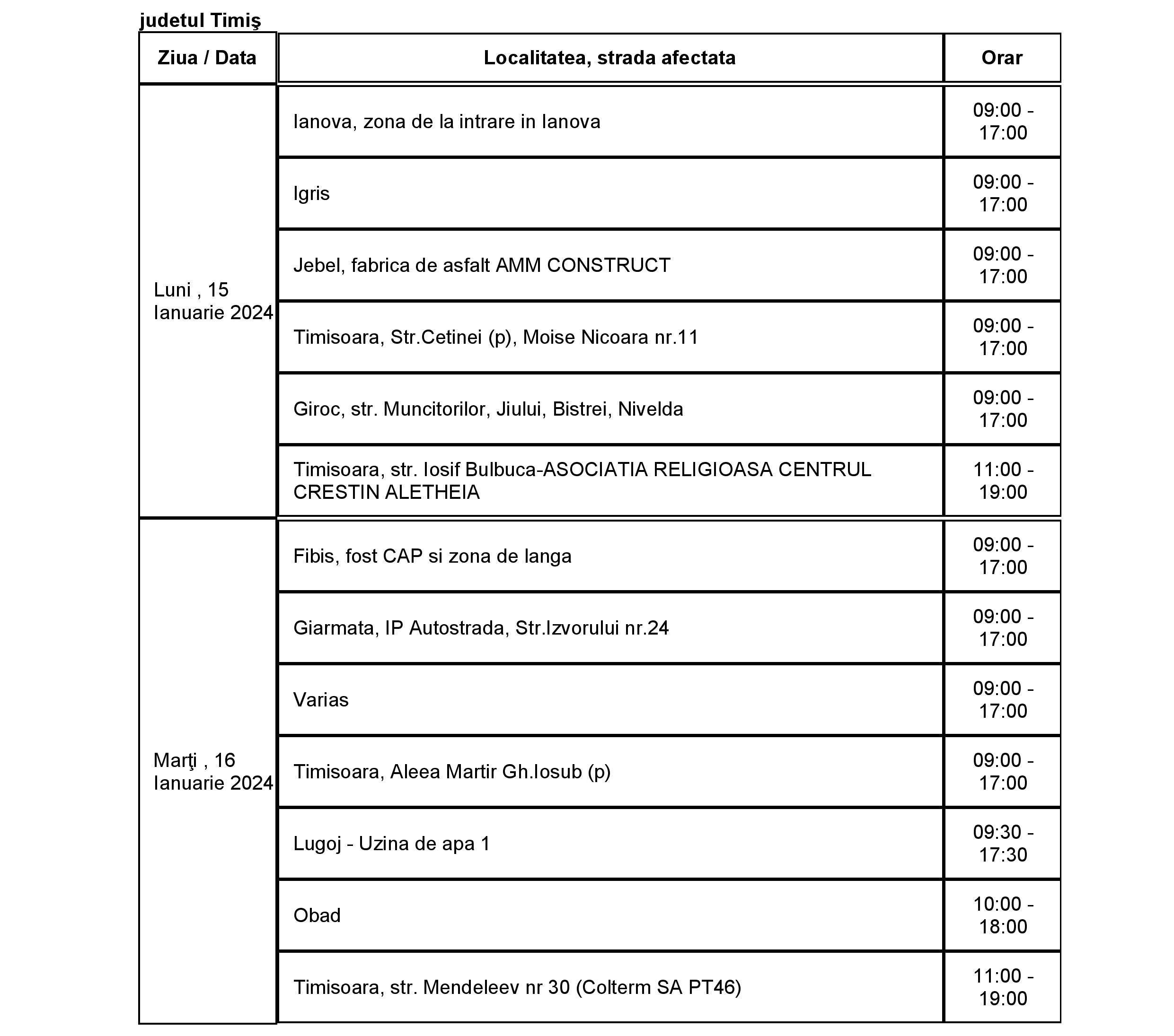Lucrările au fost reduse la cele care sunt necesare pentru a asigura capacitatea rețelei de a funcționa și a alimenta clienții cu energie electrică în bune condiții. În perioada 15 – 21 ianuarie, curentul va fi întrerupt astfel: