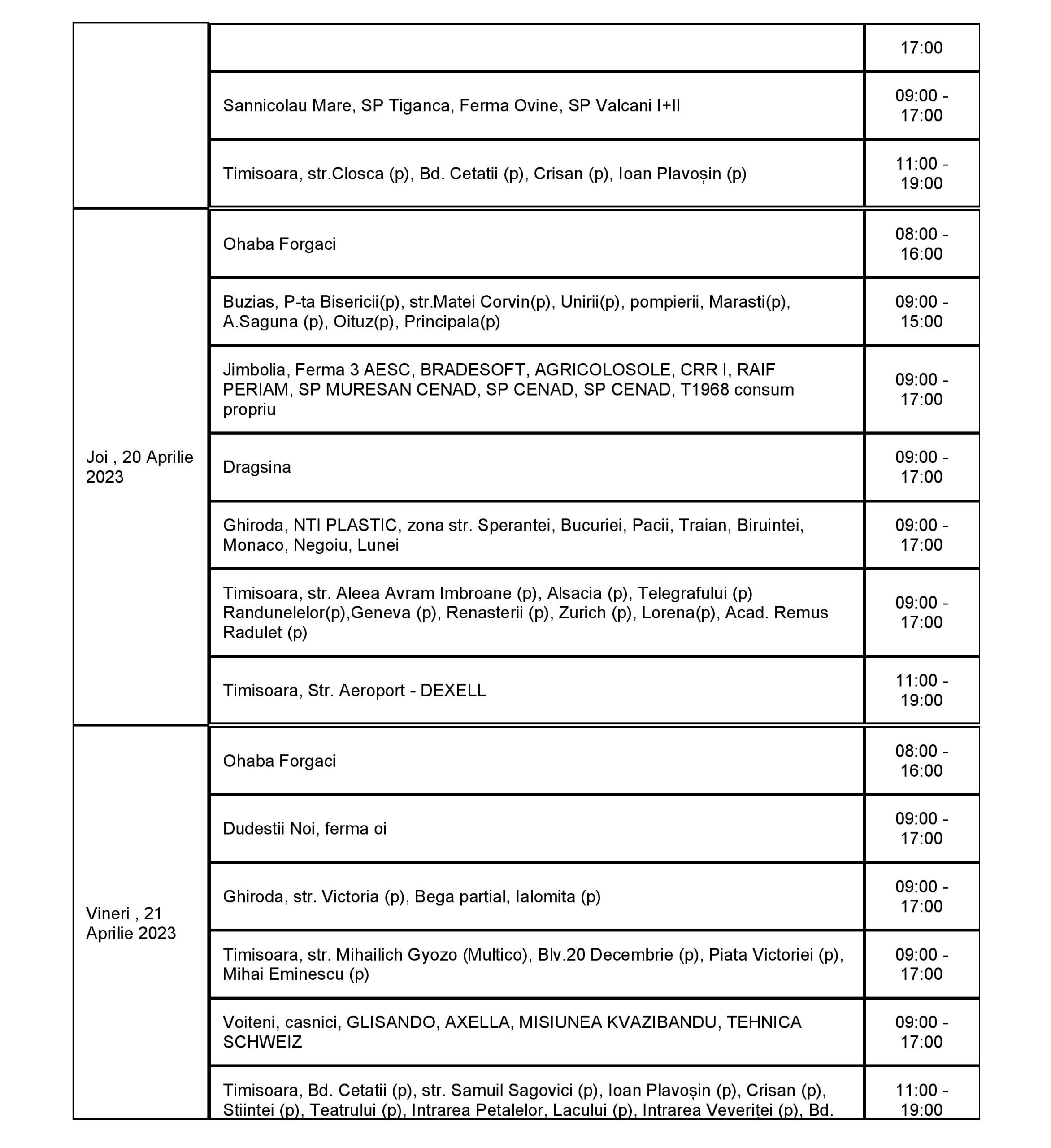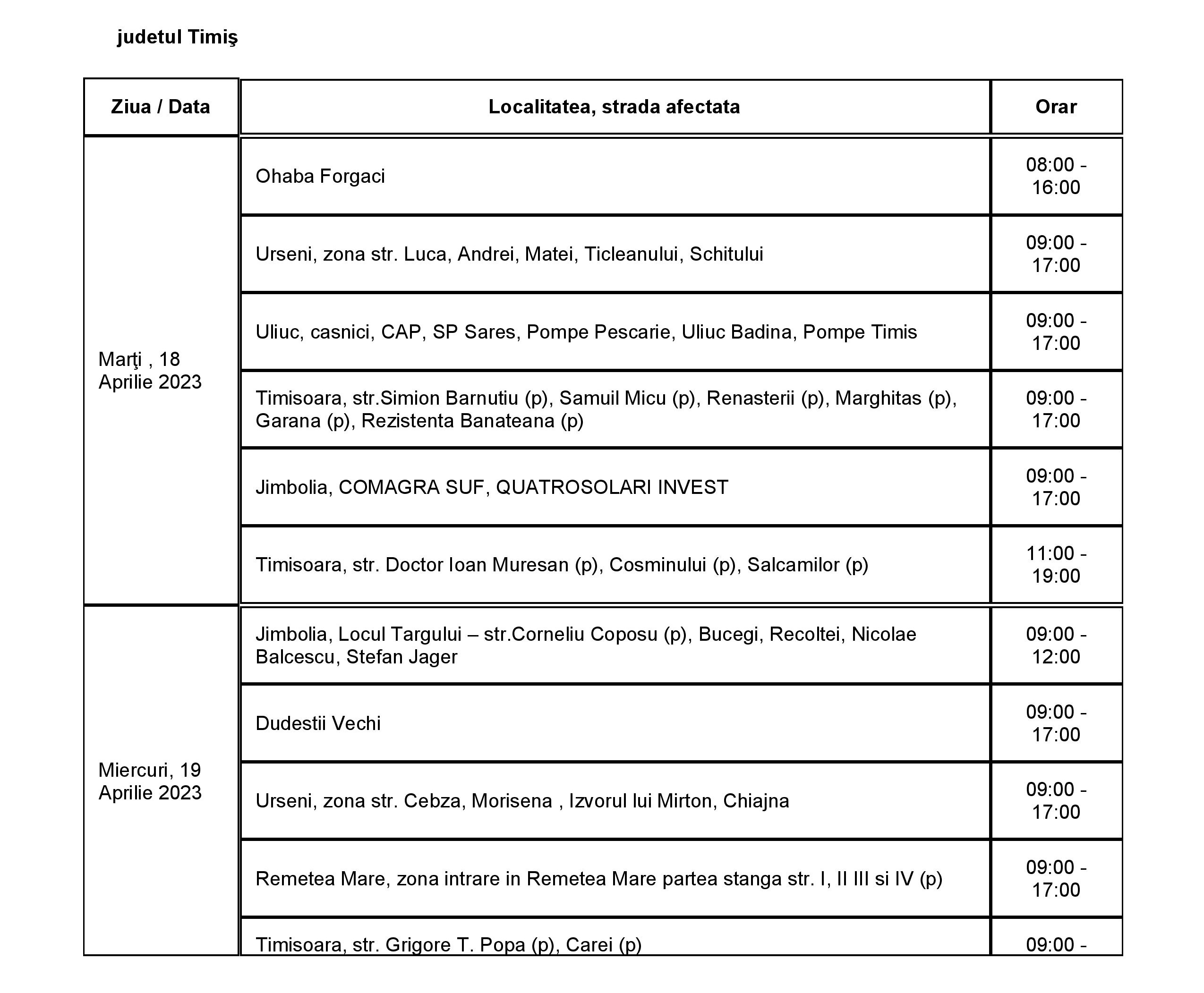 Lucrările au fost reduse la cele care sunt necesare pentru a asigura capacitatea rețelei de a funcționa și a alimenta clienții cu energie electrică în bune condiții. În perioada 17 – 23 aprilie, curentul va fi întrerupt astfel: