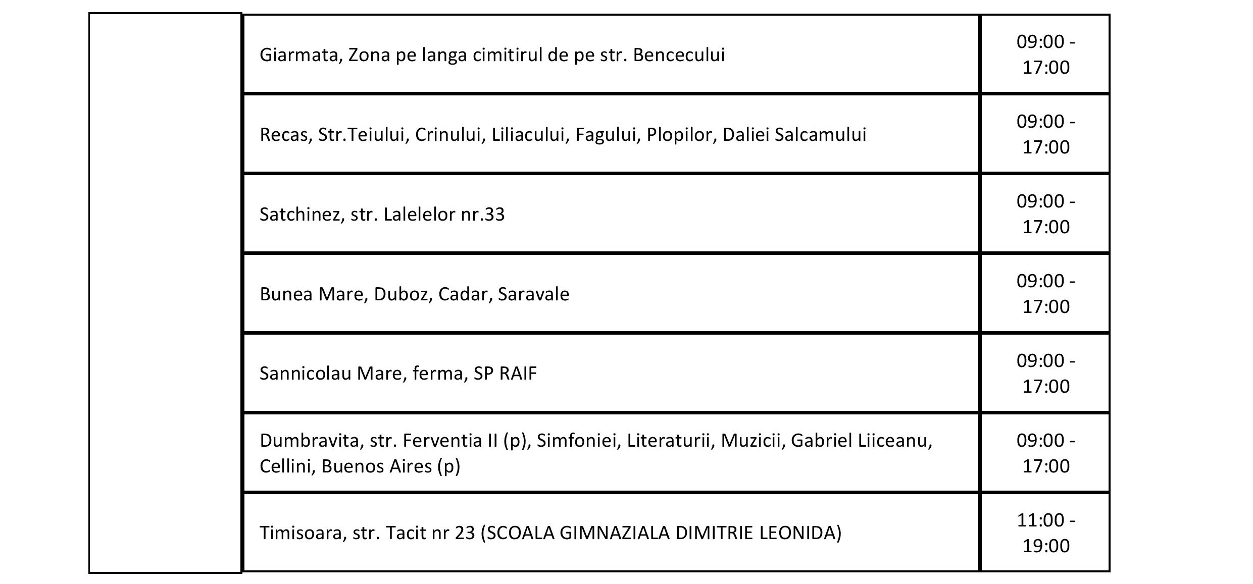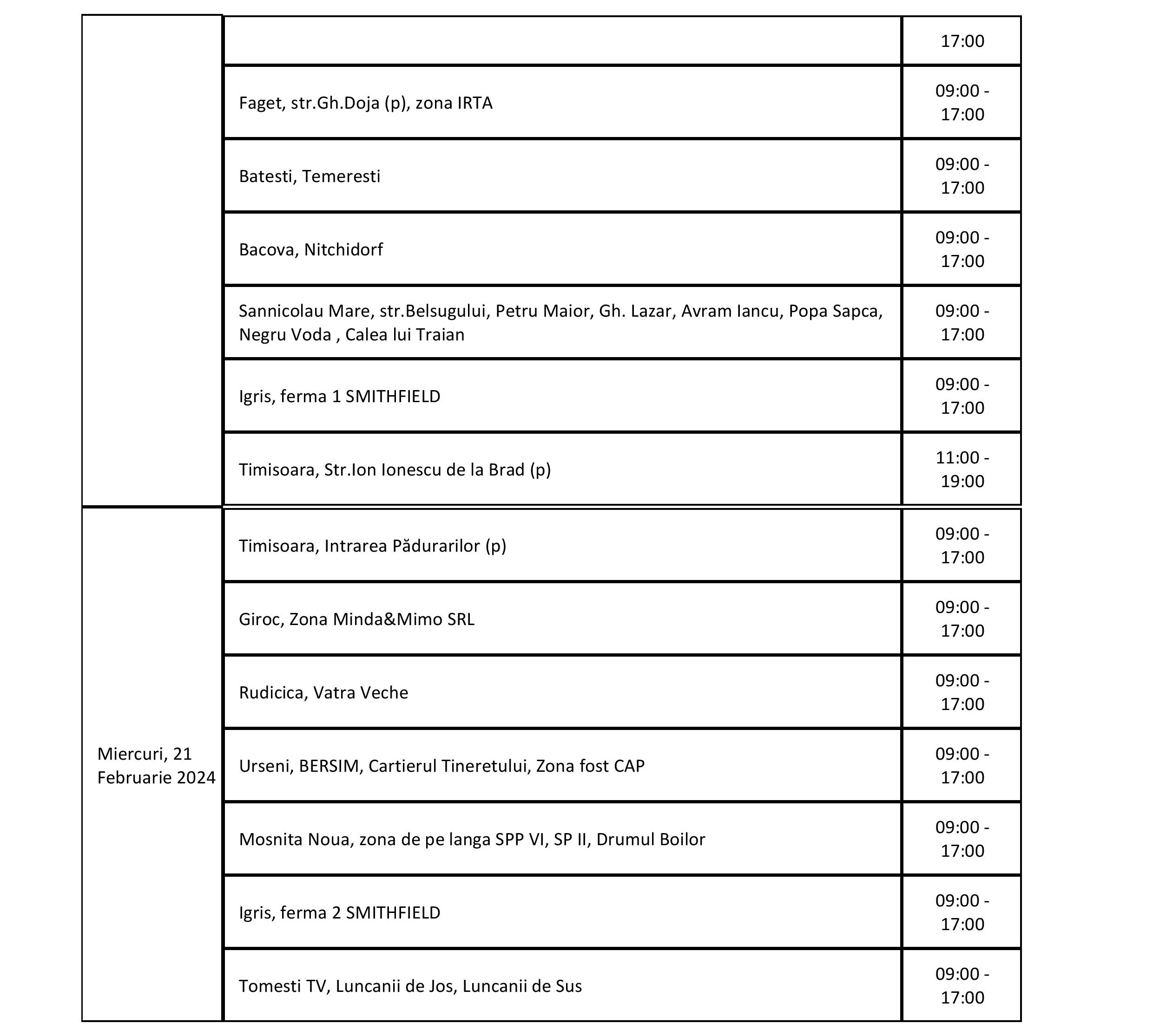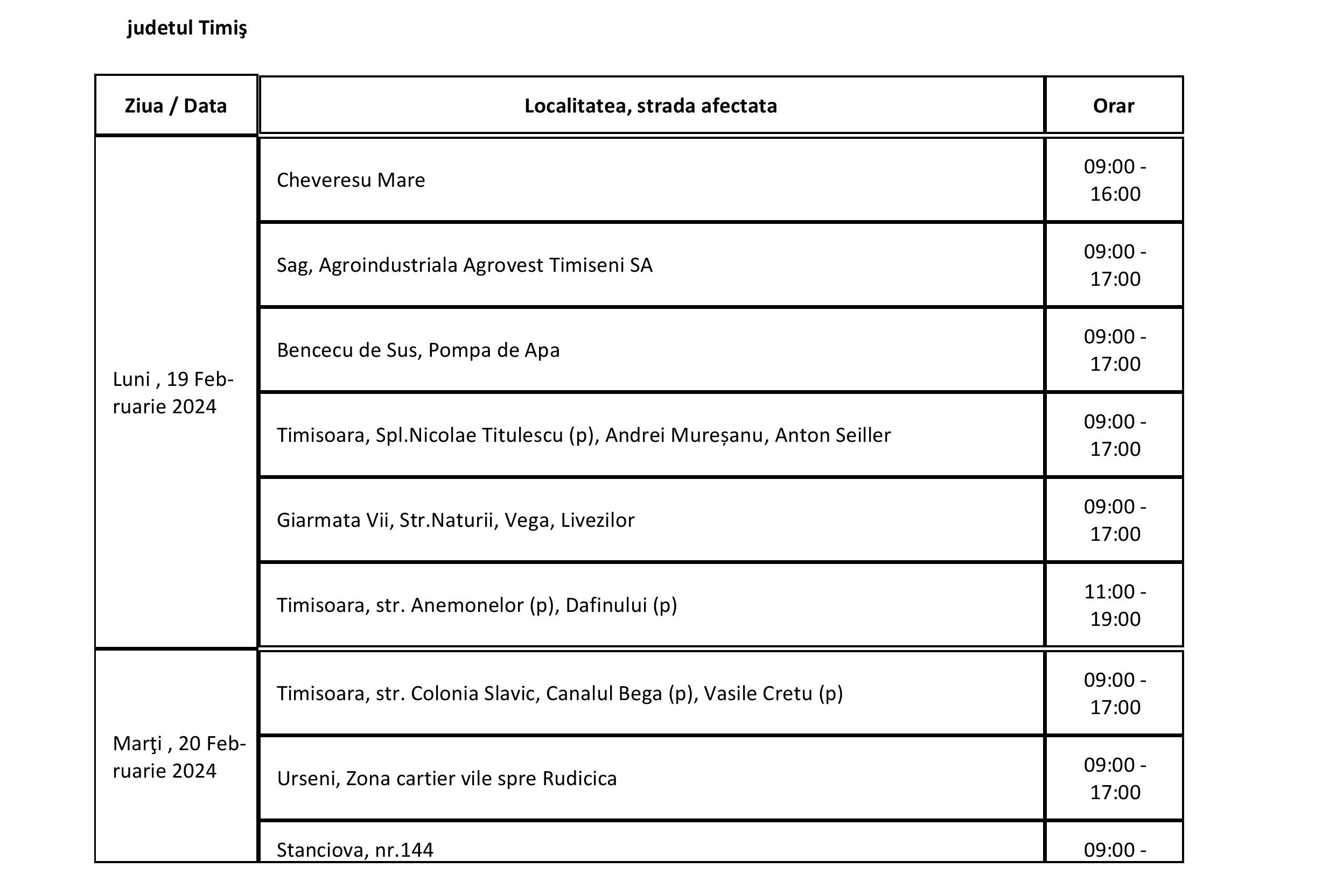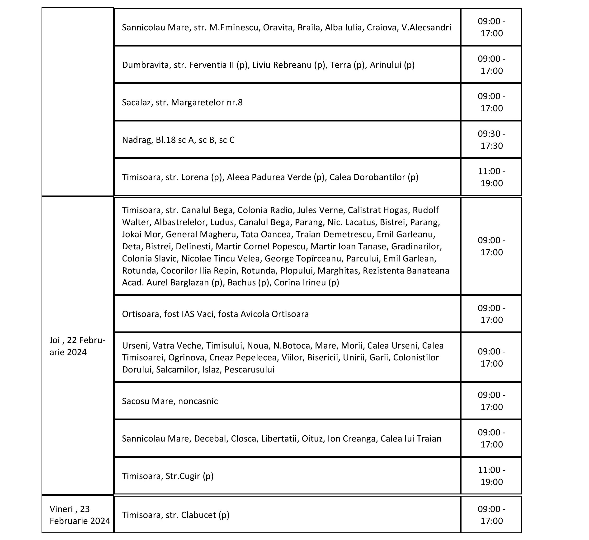 Lucrările au fost reduse la cele care sunt necesare pentru a asigura capacitatea rețelei de a funcționa și a alimenta clienții cu energie electrică în bune condiții. În perioada 19 – 25 februarie, curentul va fi întrerupt astfel: