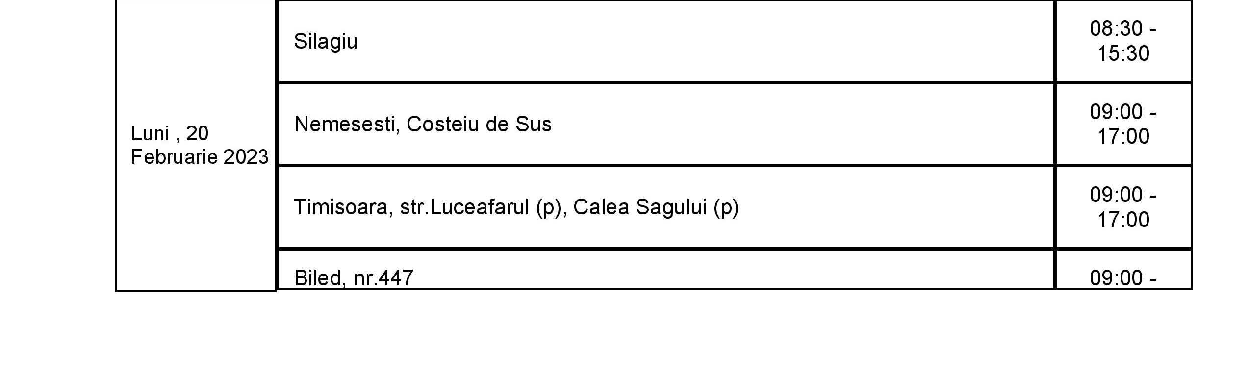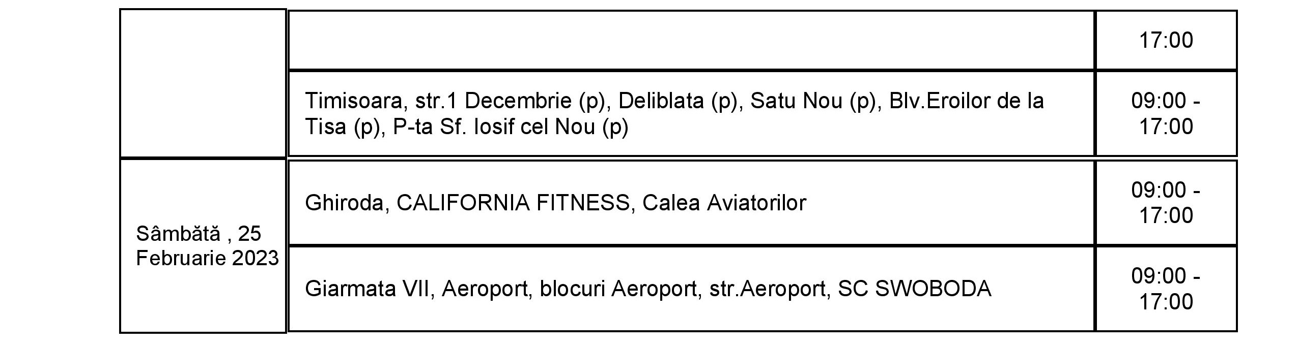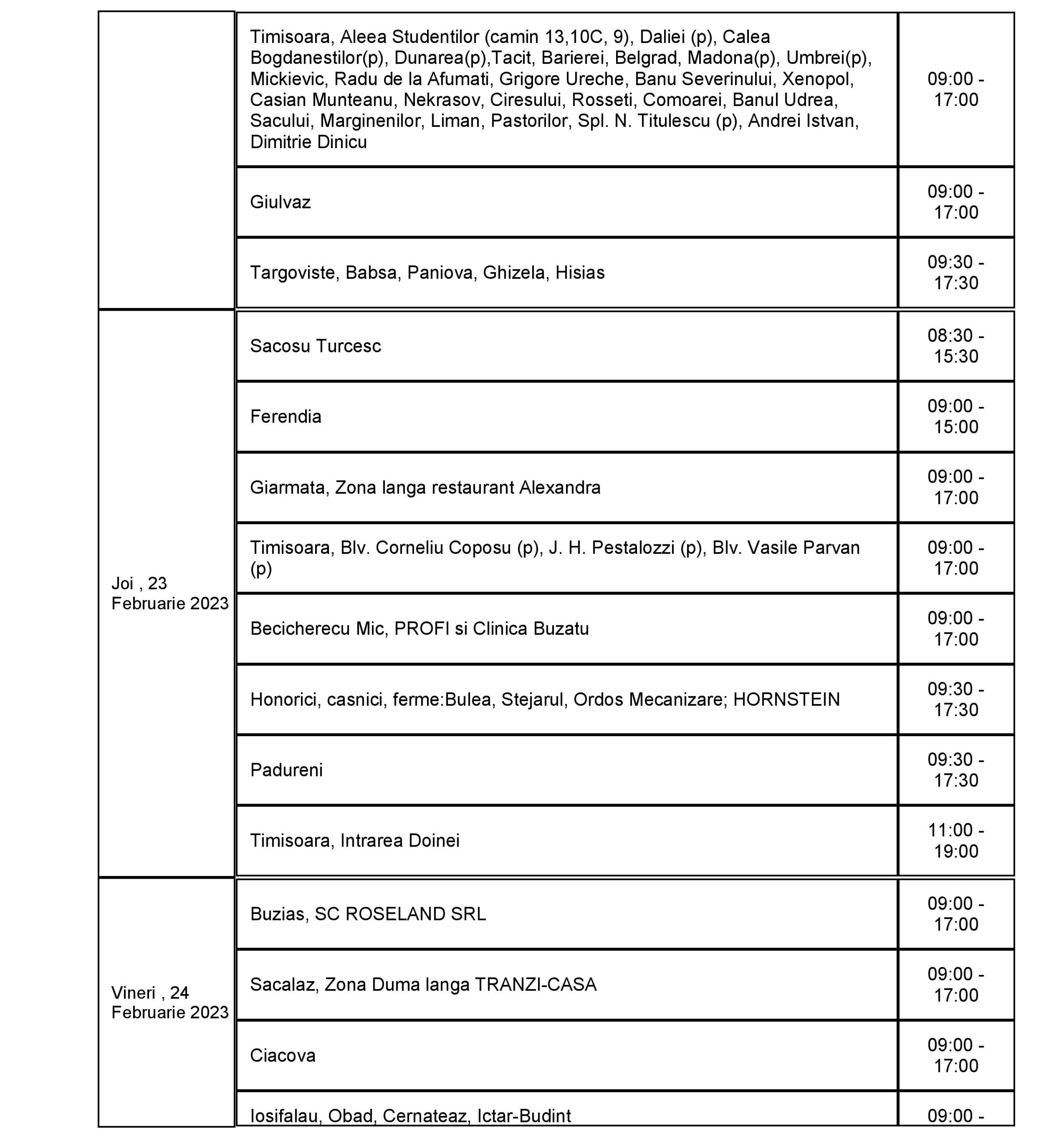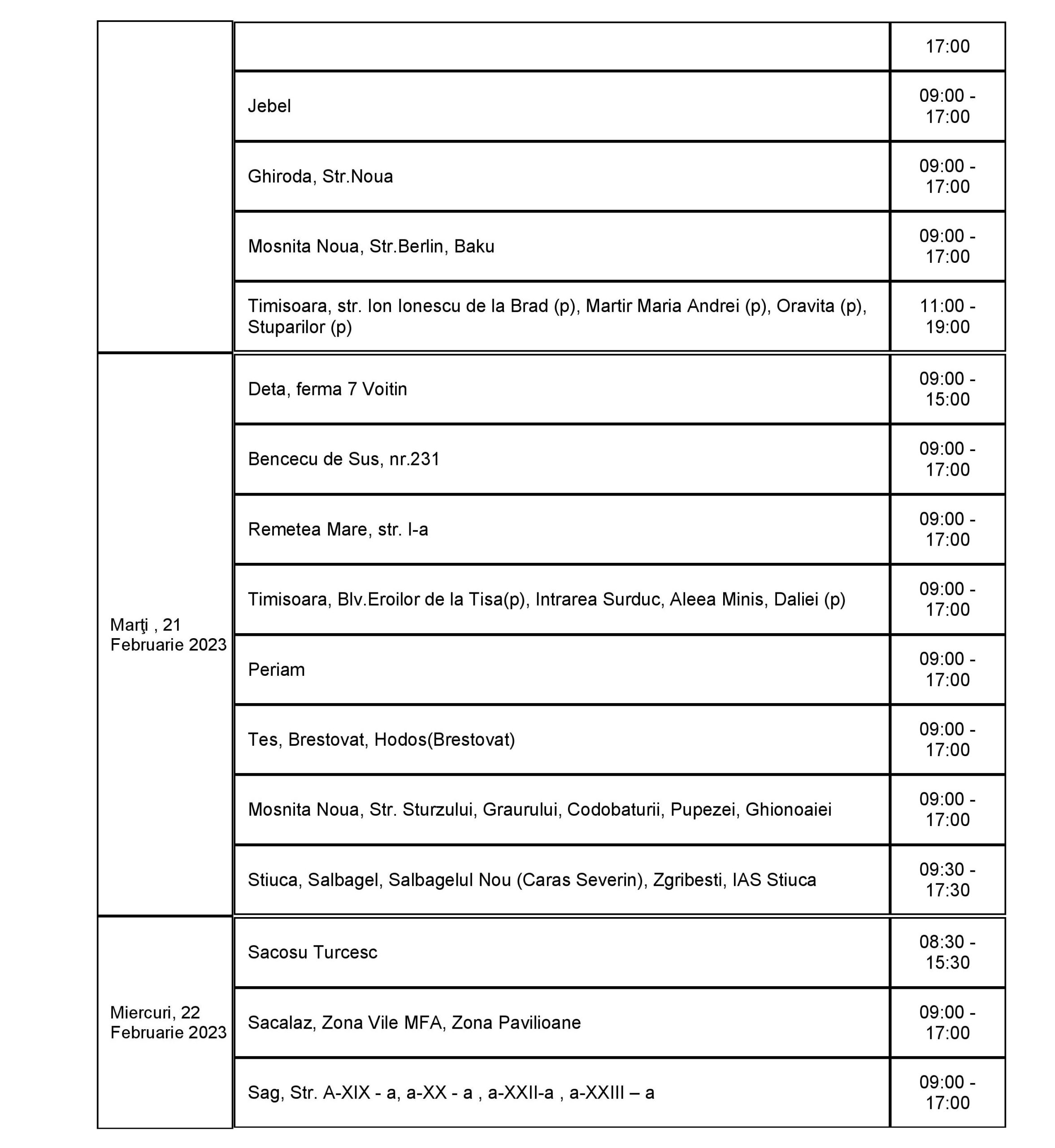 Lucrările au fost reduse la cele care sunt necesare pentru a asigura capacitatea rețelei de a funcționa și a alimenta clienții cu energie electrică în bune condiții. În perioada 20 – 26 februarie, curentul va fi întrerupt astfel: