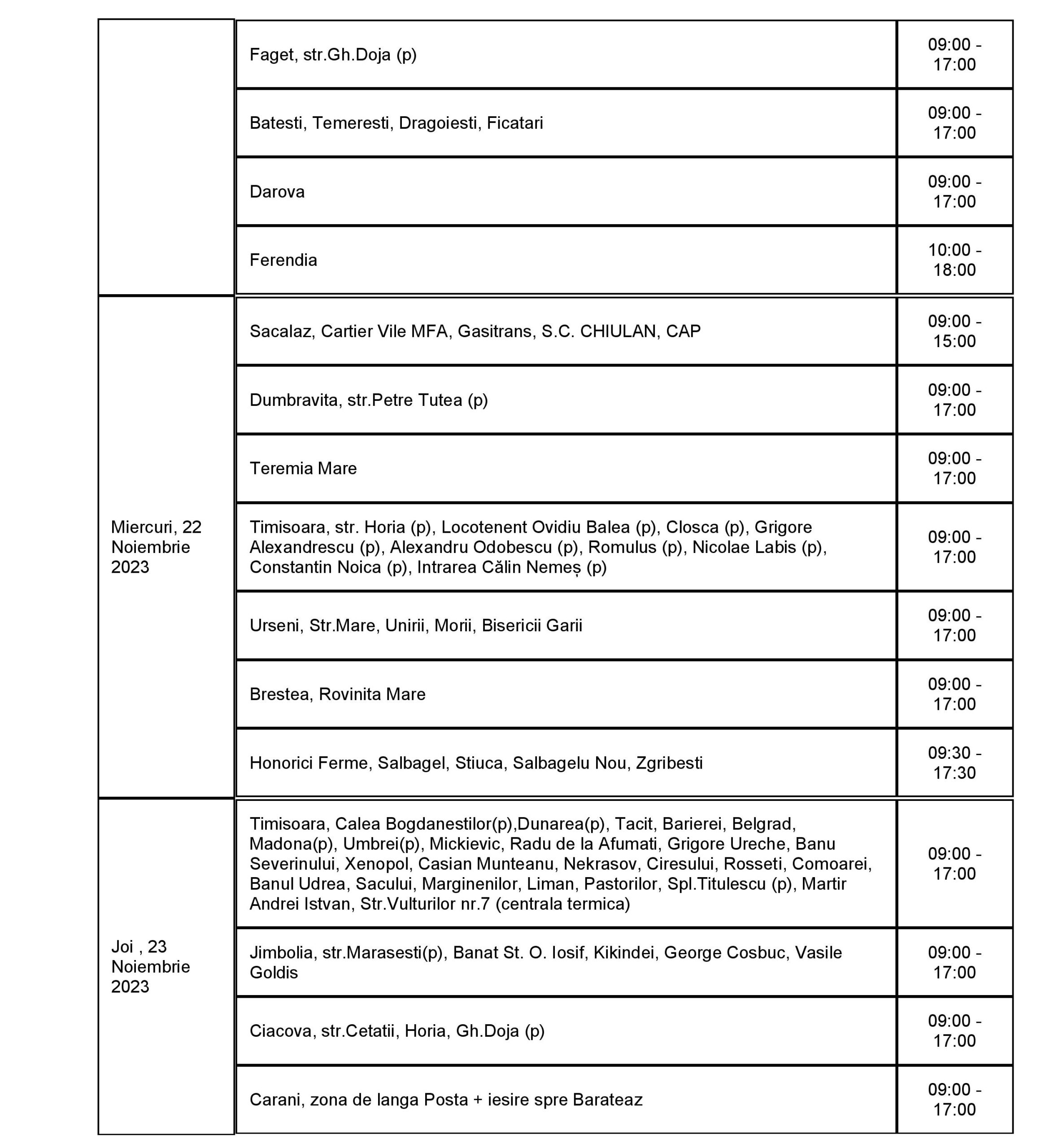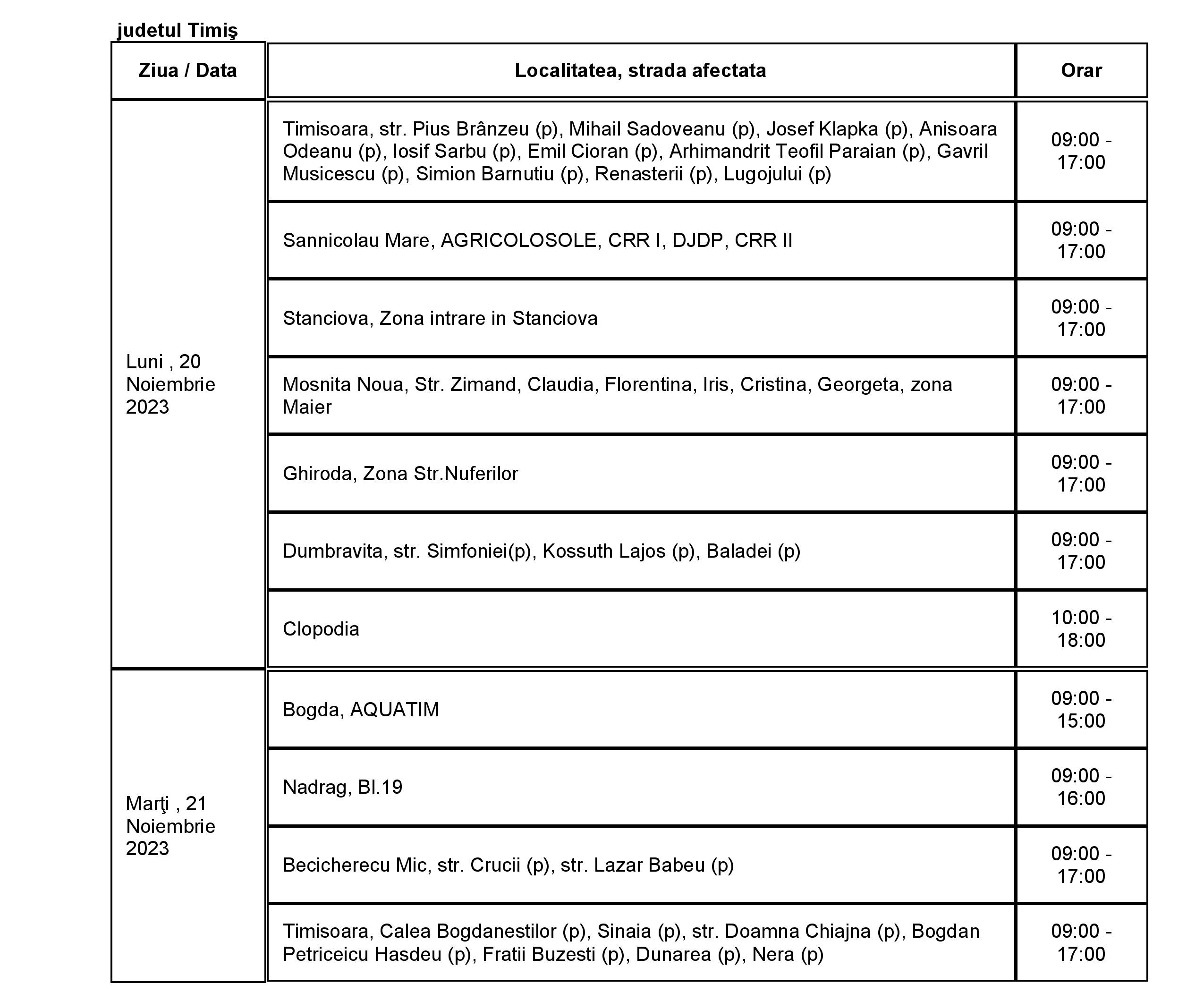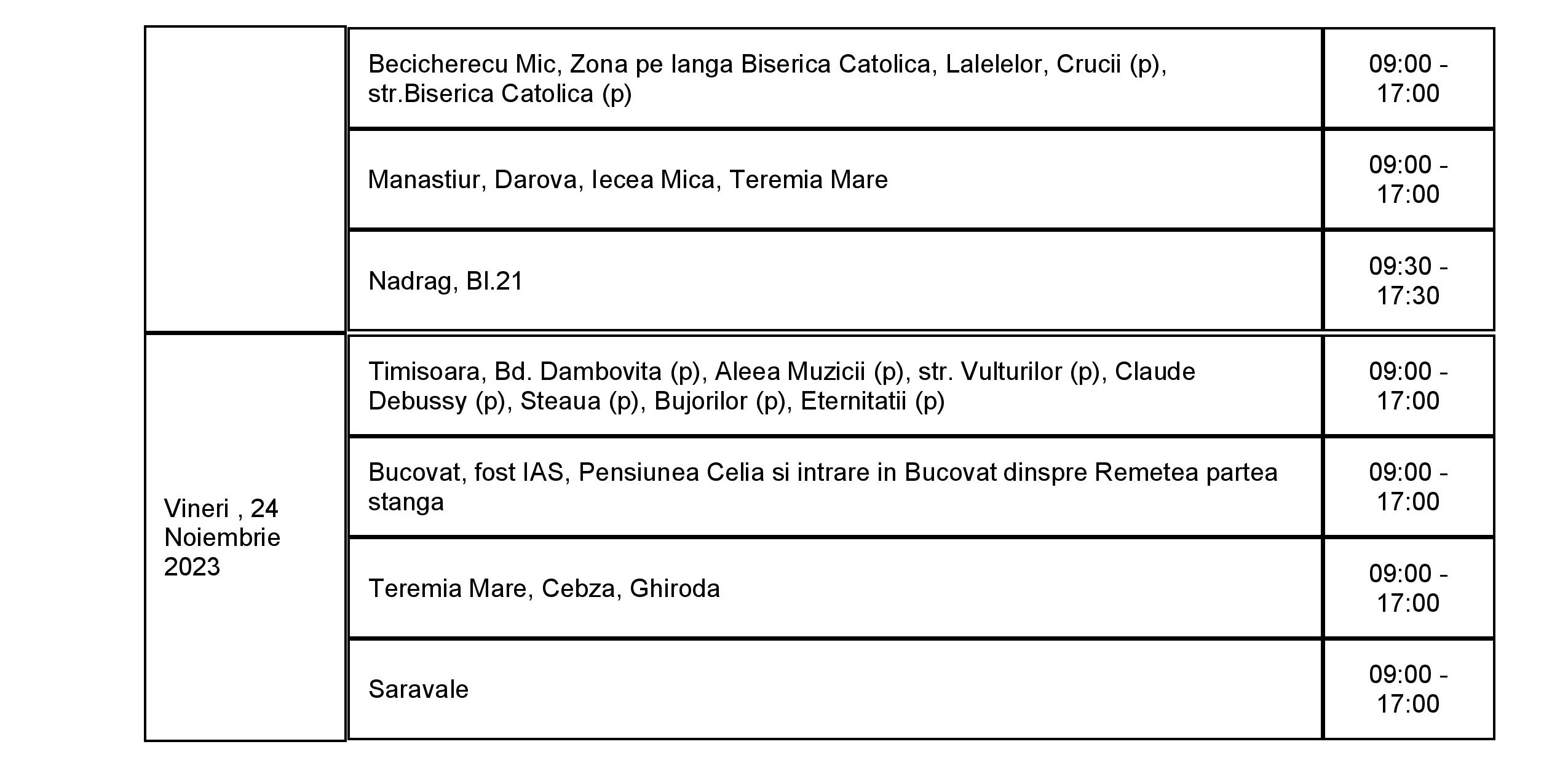 Lucrările au fost reduse la cele care sunt necesare pentru a asigura capacitatea rețelei de a funcționa și a alimenta clienții cu energie electrică în bune condiții. În perioada 20 – 26 noiembrie, curentul va fi întrerupt astfel: