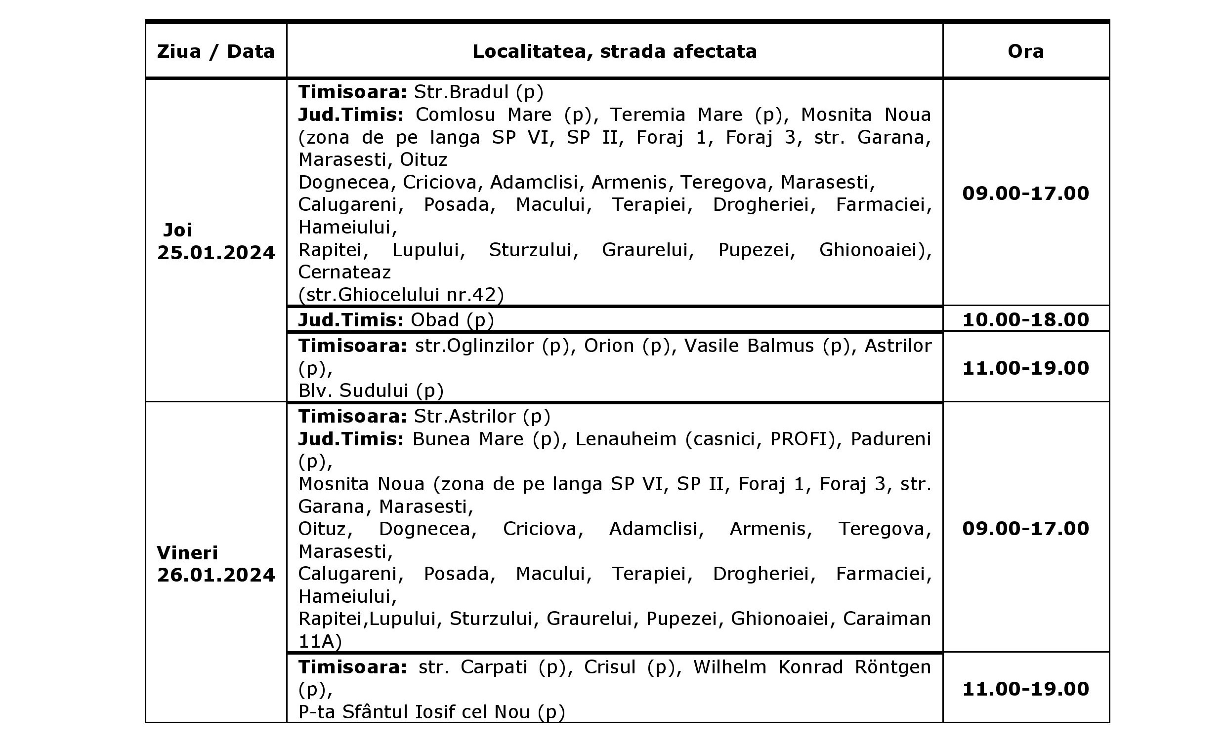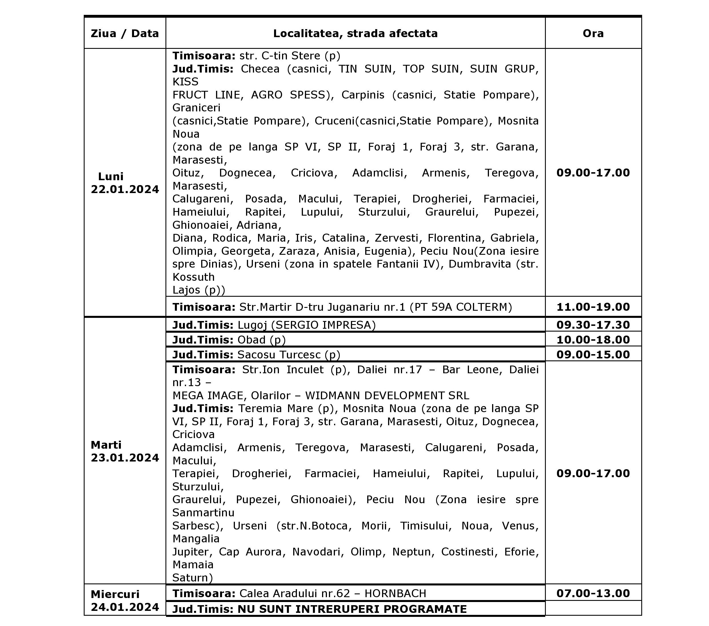 Lucrările au fost reduse la cele care sunt necesare pentru a asigura capacitatea rețelei de a funcționa și a alimenta clienții cu energie electrică în bune condiții. În perioada 22 – 28 ianuarie, curentul va fi întrerupt astfel: