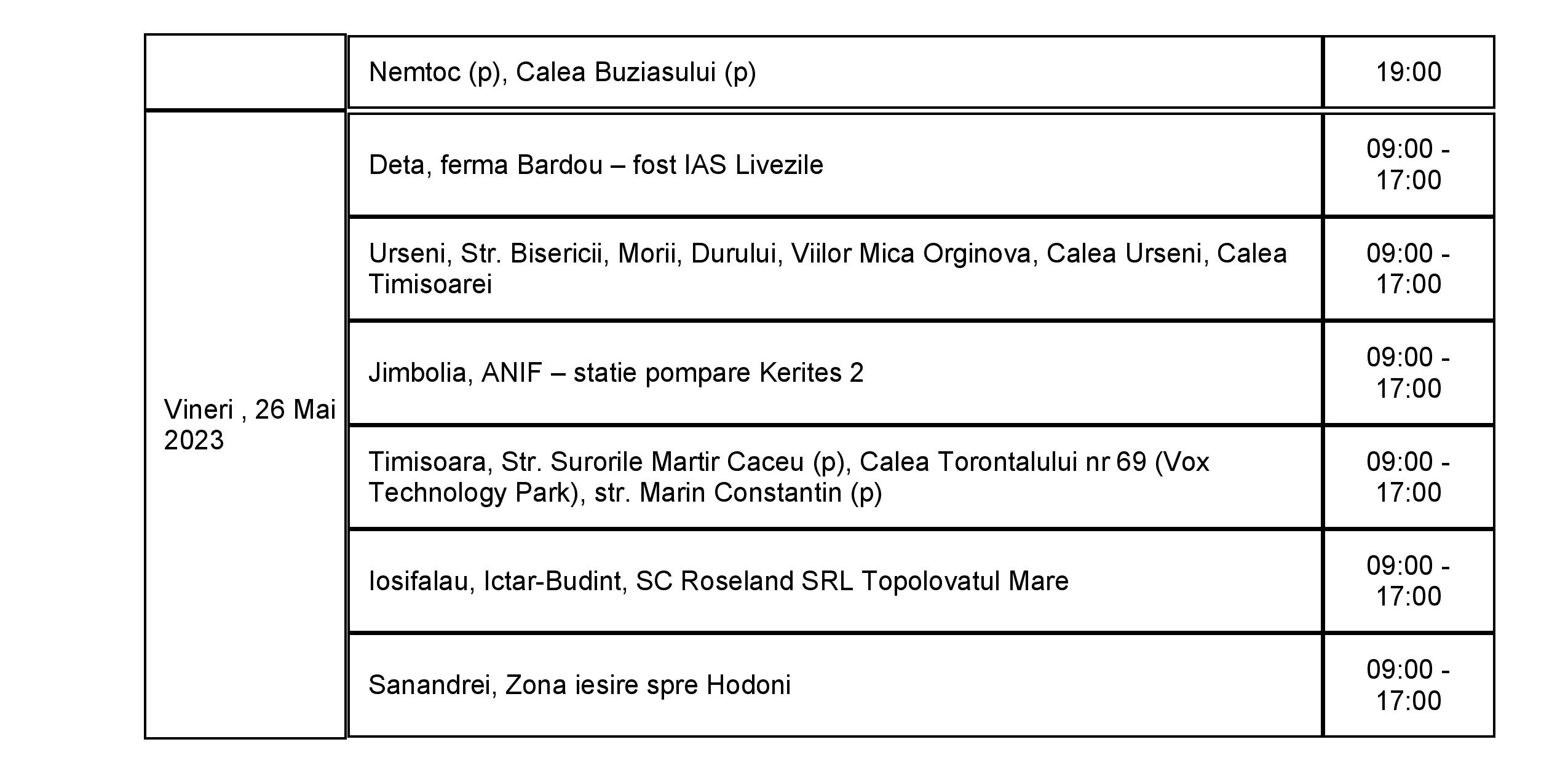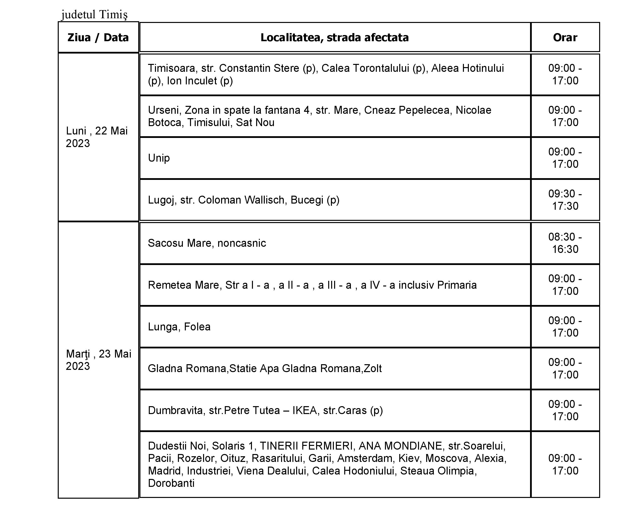 Lucrările au fost reduse la cele care sunt necesare pentru a asigura capacitatea rețelei de a funcționa și a alimenta clienții cu energie electrică în bune condiții. În perioada 22 – 28 mai, curentul va fi întrerupt astfel: